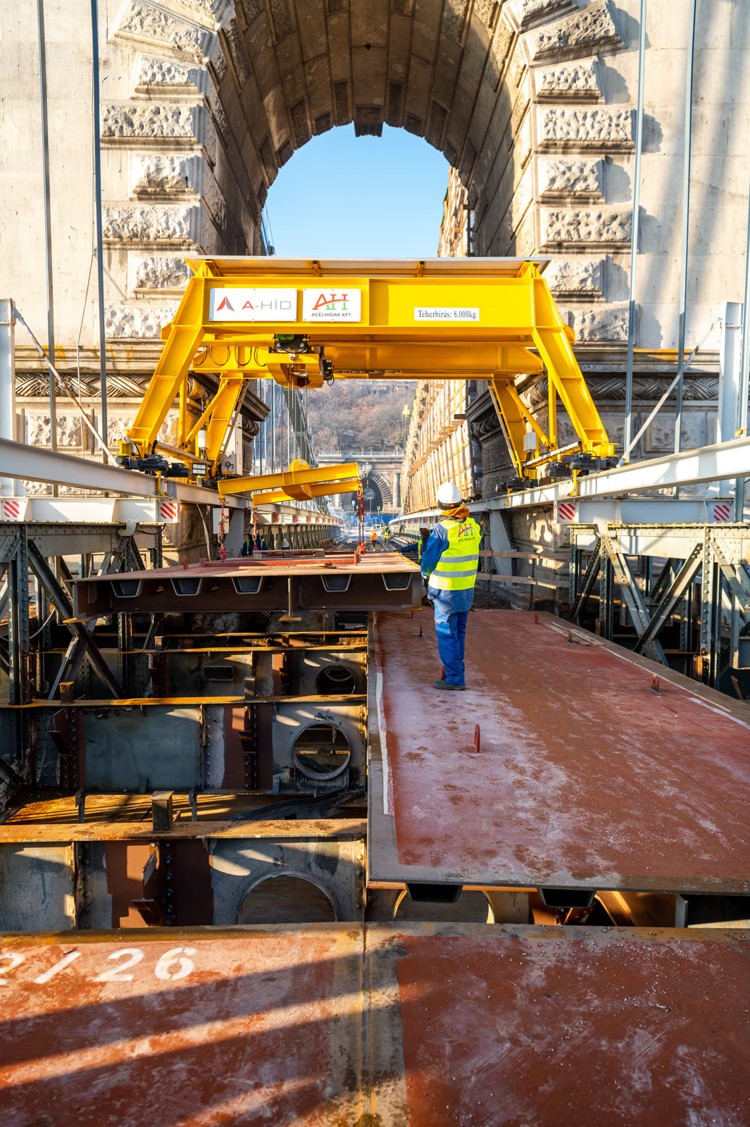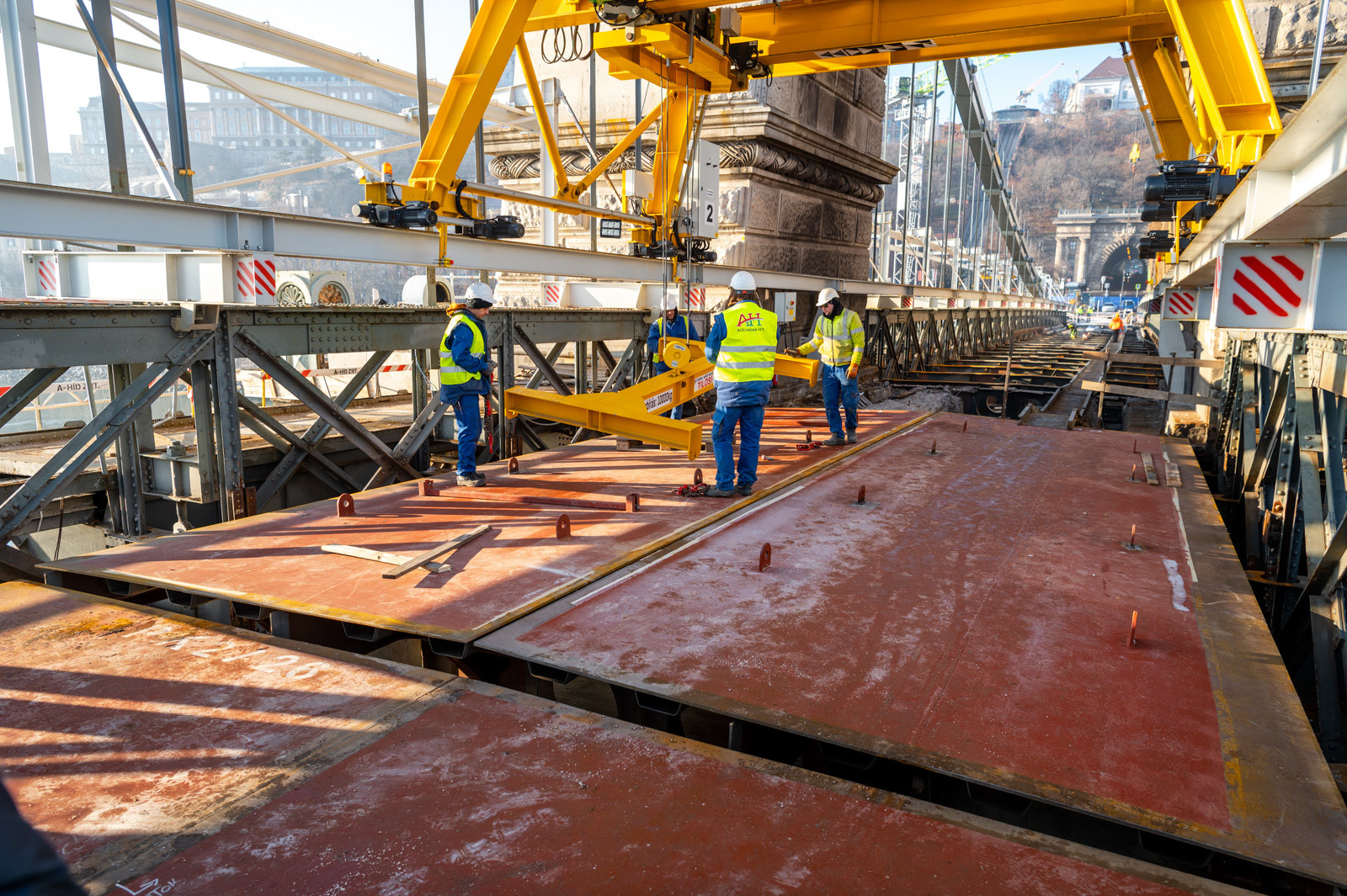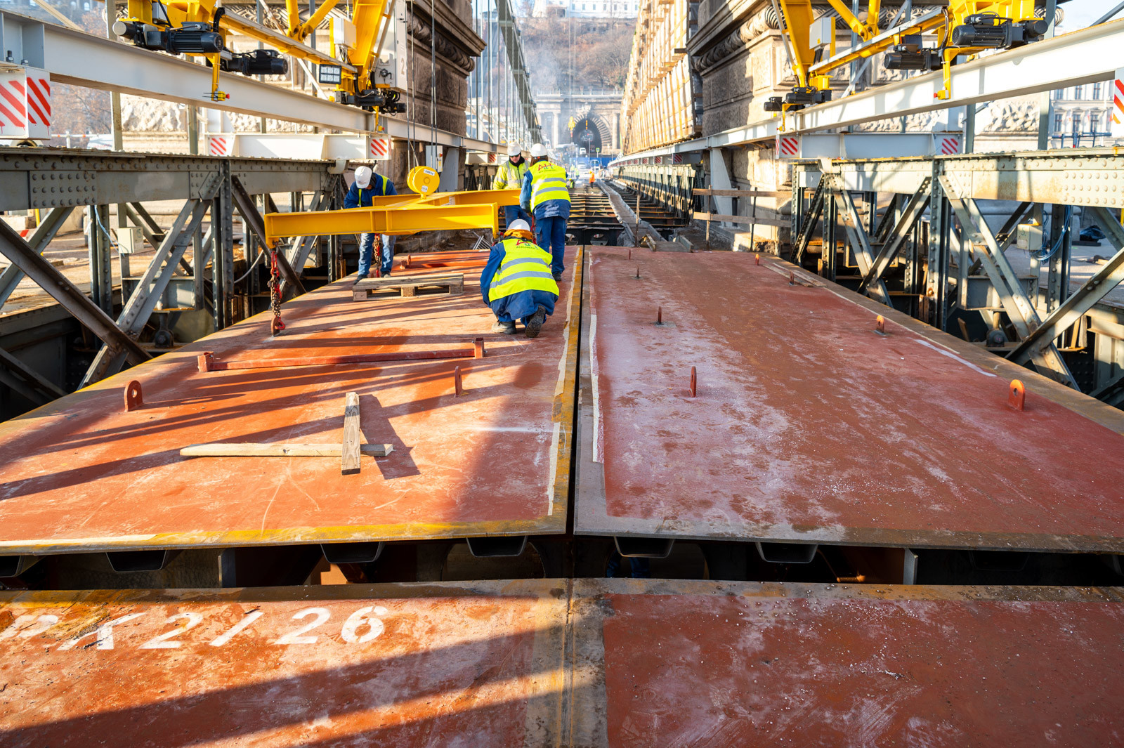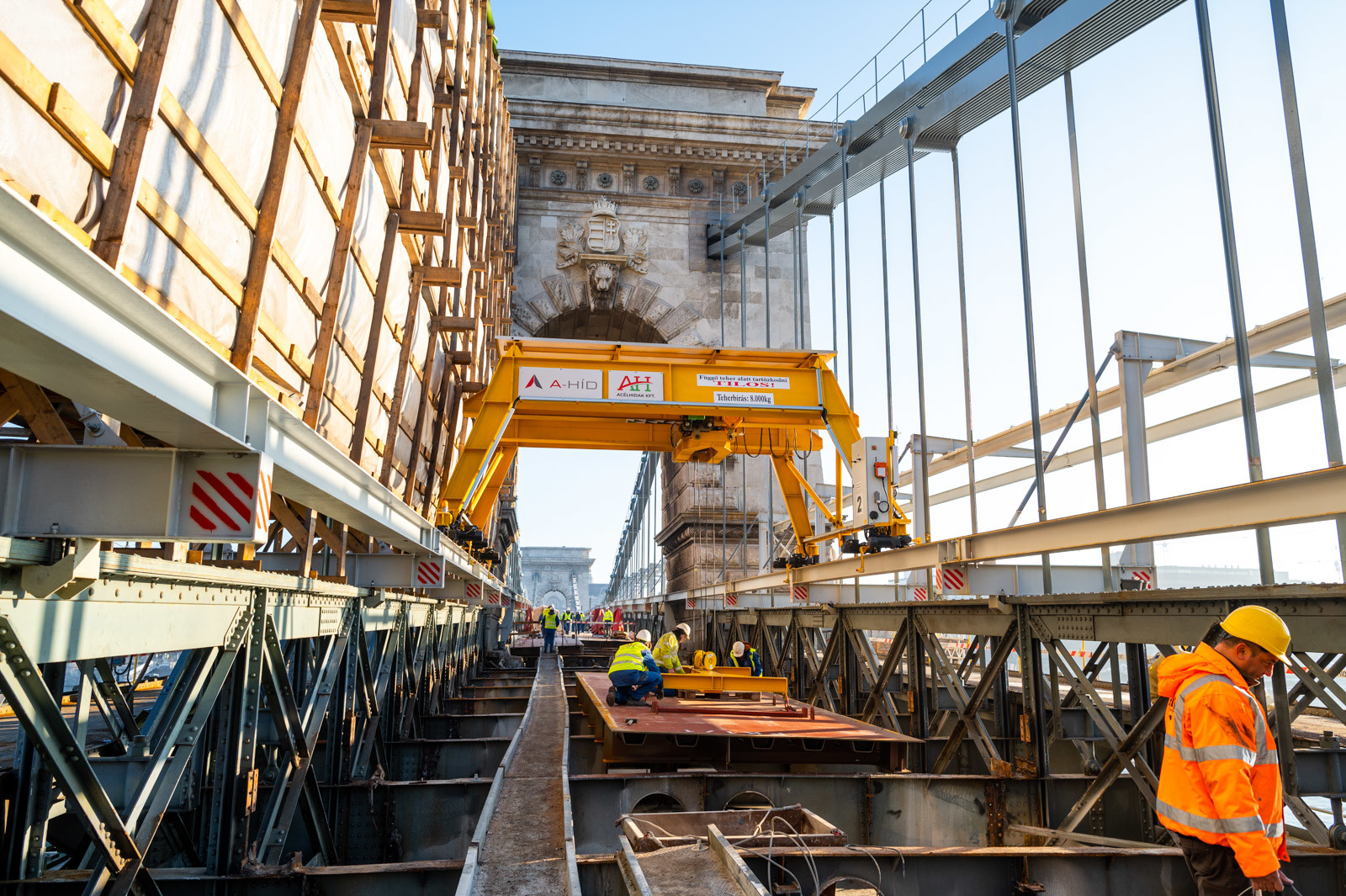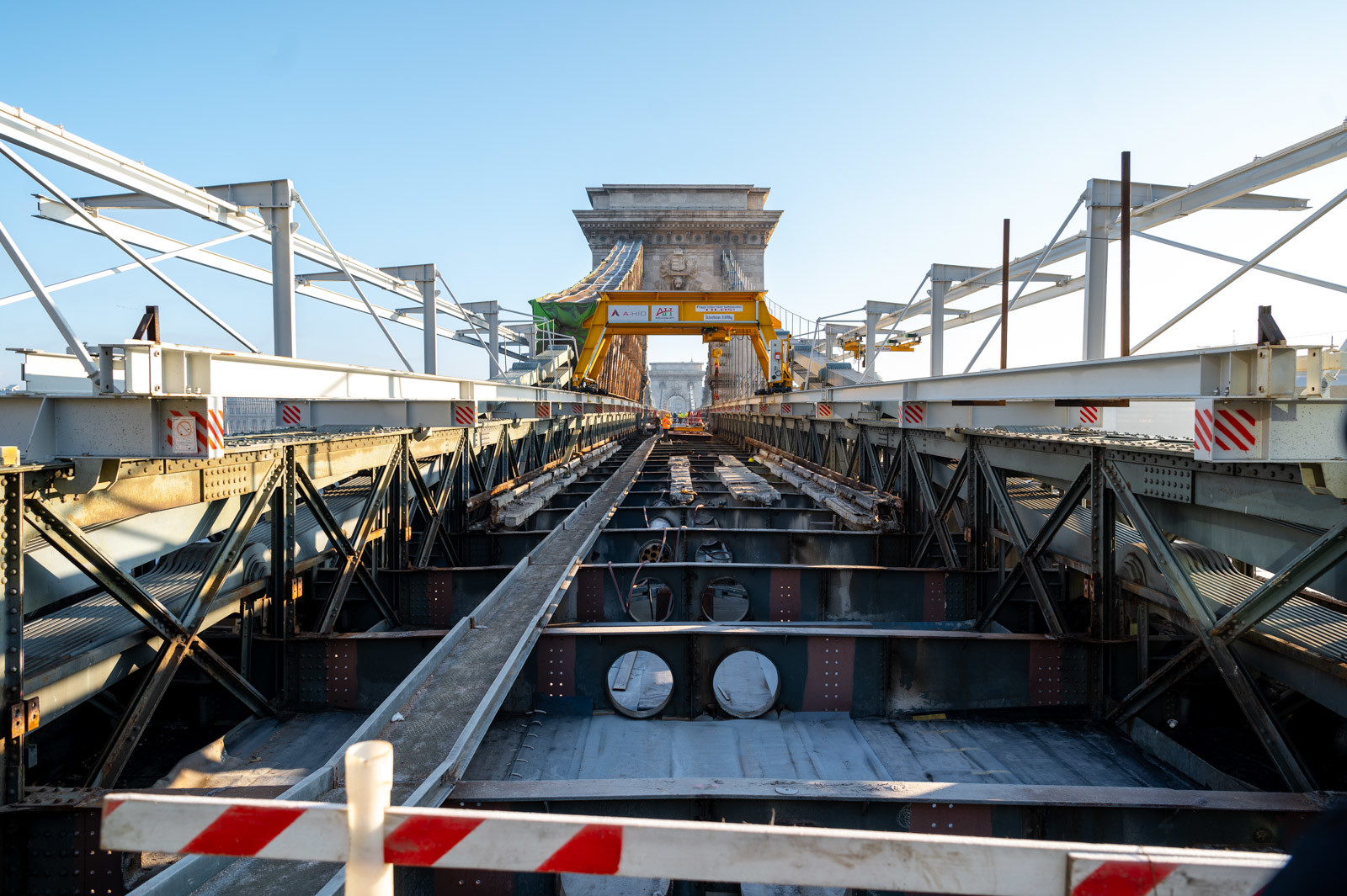Az elöregedett vasbetont váltó pályaszerkezet beépítése – a bontáshoz hasonlóan – a híd közepétől kezdődött - írja a BKK közleménye. Az első új acéltáblát még július végén szállították a helyszínre, és toronydaruval emelték a hídra, majd augusztusban helyezték be a Lánchídba.