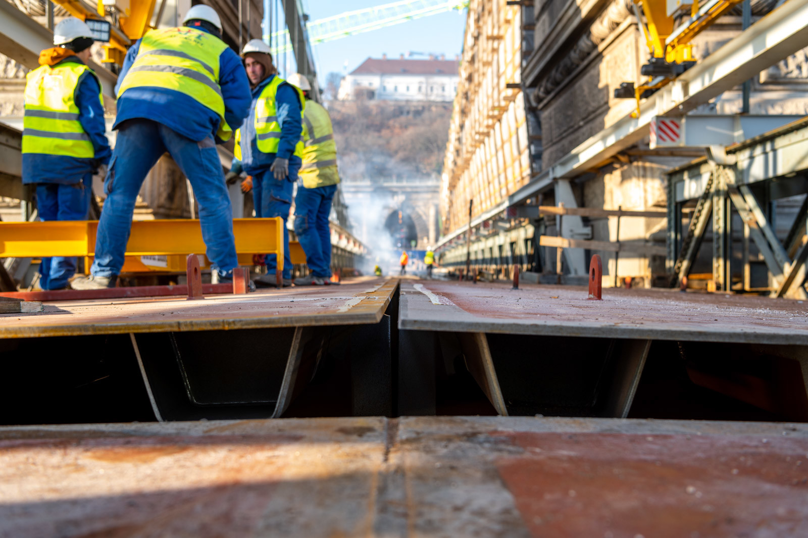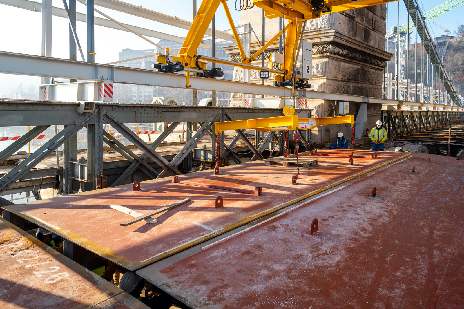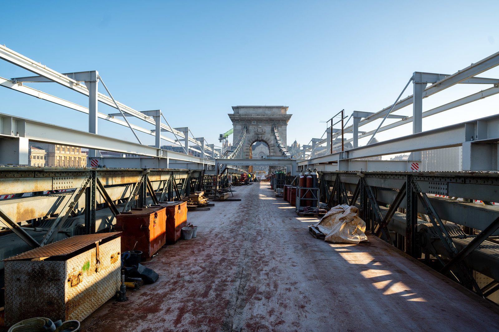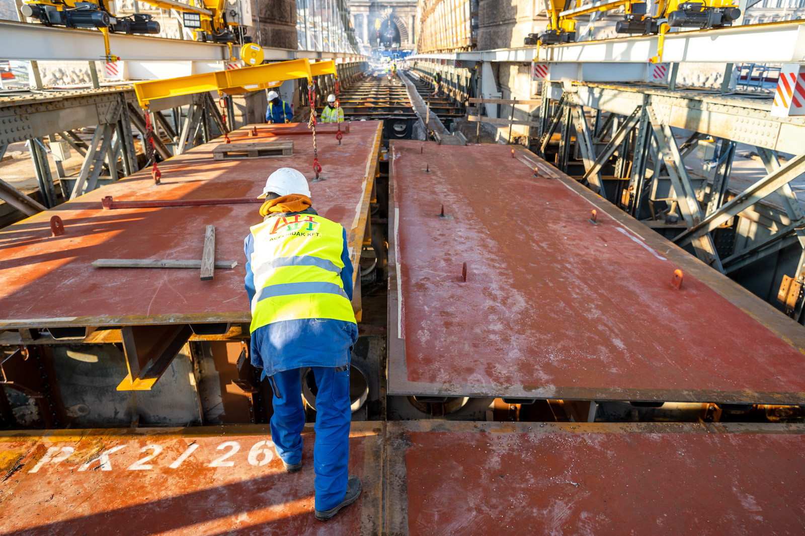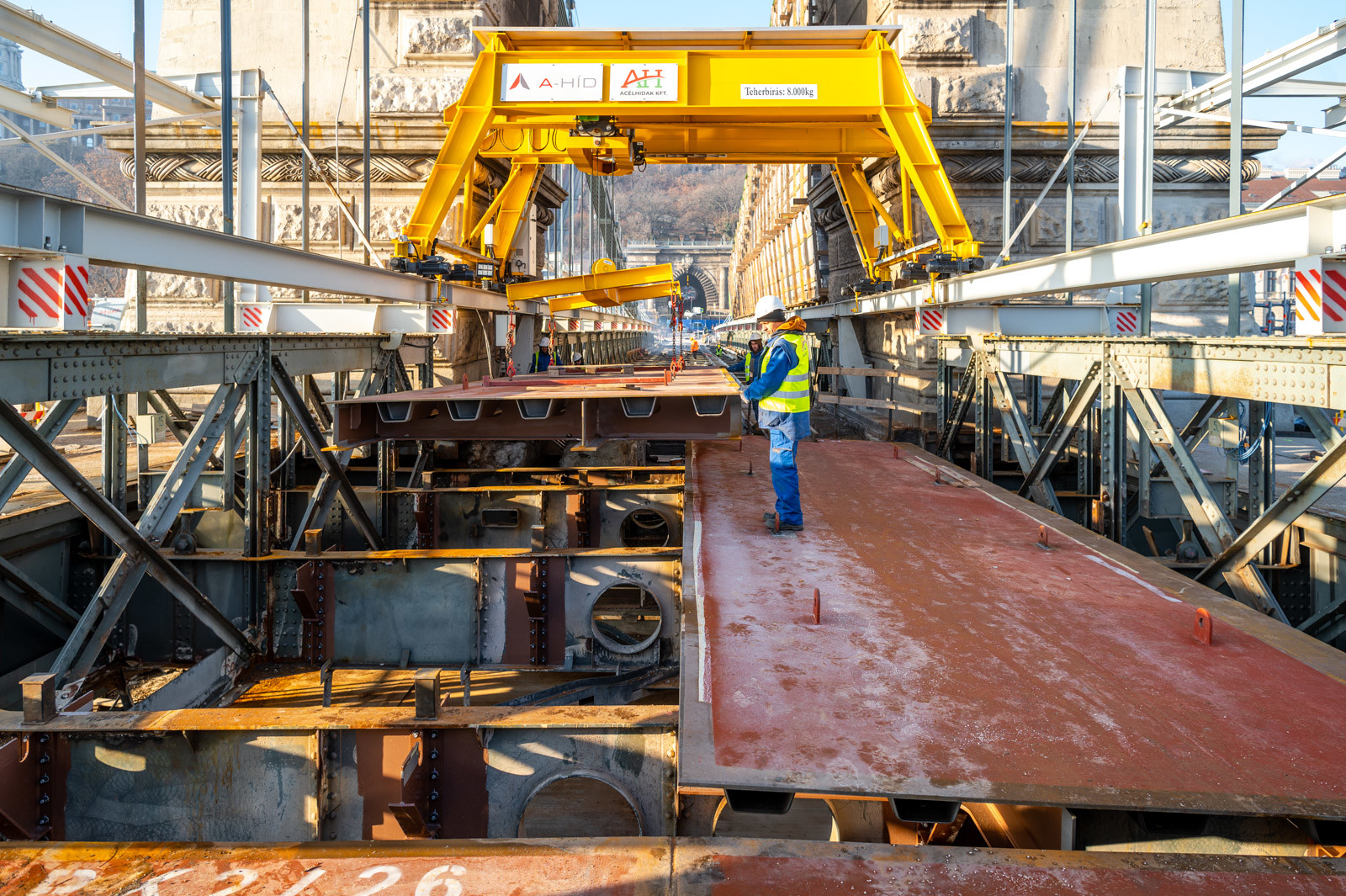 Az elöregedett vasbetont váltó pályaszerkezet beépítése – a bontáshoz hasonlóan – a híd közepétől kezdődött - írja a BKK közleménye. Az első új acéltáblát még július végén szállították a helyszínre, és toronydaruval emelték a hídra, majd augusztusban helyezték be a Lánchídba.