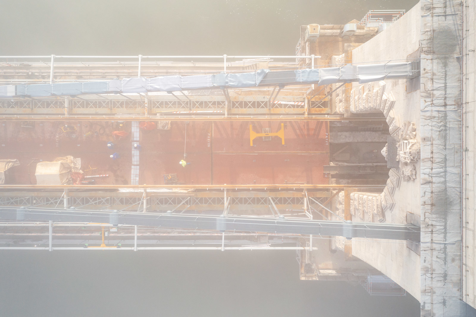 Az örökségvédelmi feladatok részeként a pilon körül egy hajóról bontják a mellvédeket és a konzolokat. Nem csak a munkaterületen, valamint az acélszerkezeteket készítő és festő gyárakban folytatódnak a munkák, a kő- és fémrestaurátorok is dolgoznak a műhelyekben az oroszlánszobrok, vagy például a kandeláberek és a korlátok felújításán.