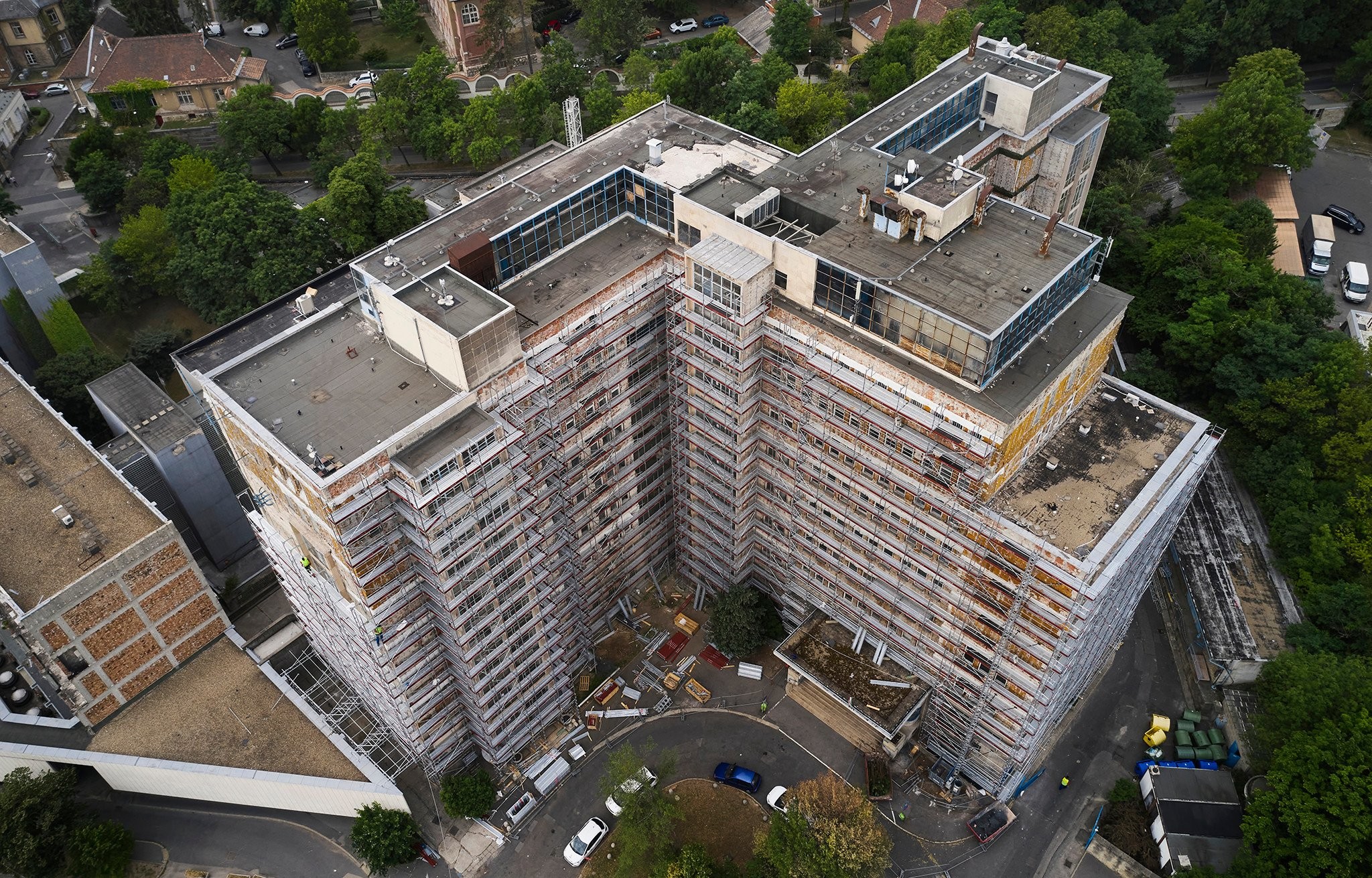 A budapesti Kútvölgyi Kórház leromlott állapotú épületeinek és toronyépületének korszerűsítése már nyáron elkezdődött. Erről korábban lapunk is beszámolt. Most homlokzatcsere zajlik 11 ezer négyzetméteren, 11 milliárd forintból. A 34 méter magas homlokzati állvány tervezését a kivitelező szakemberek a Layher Kft. mérnökeinek segítségével valósították meg.