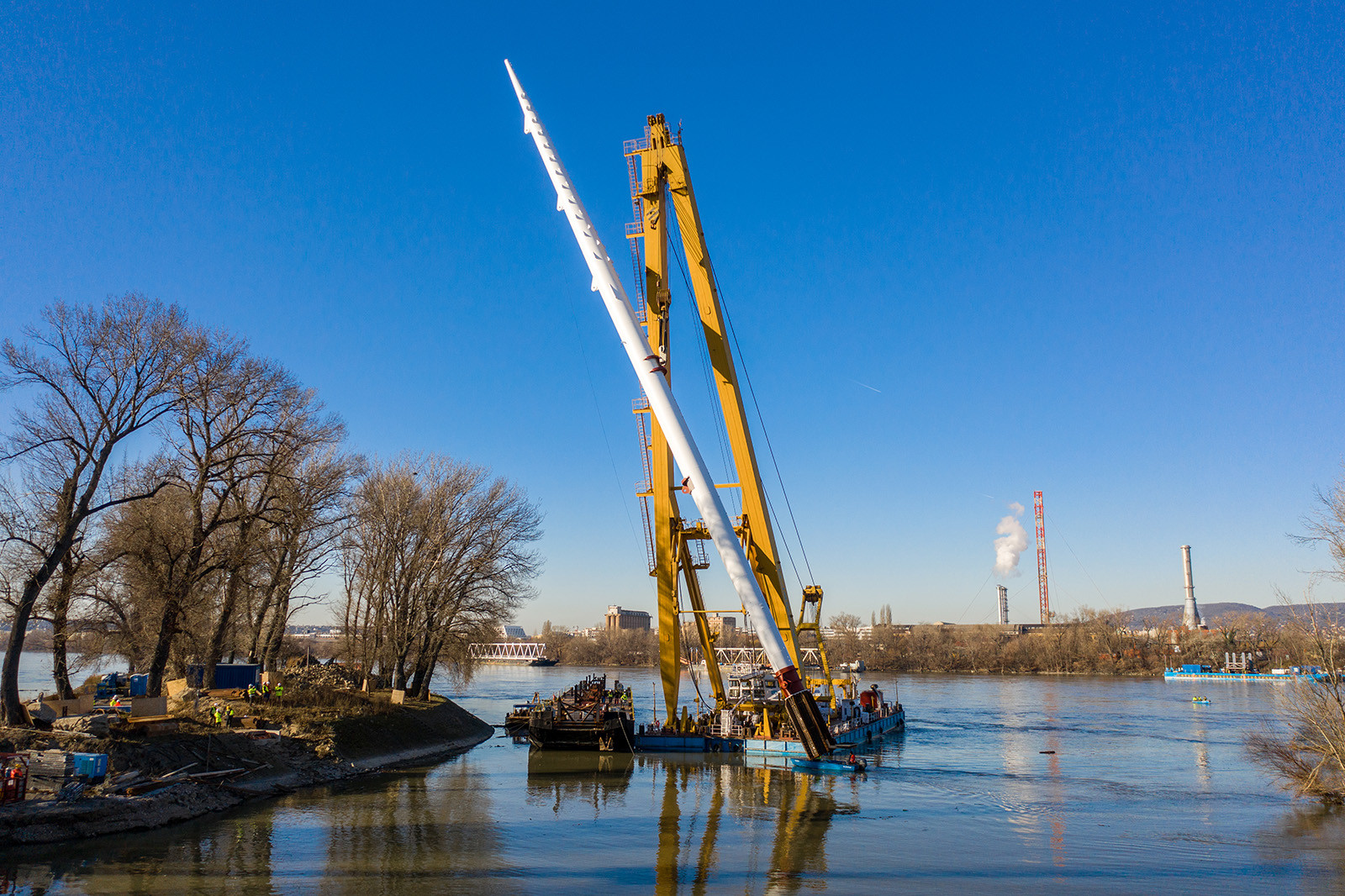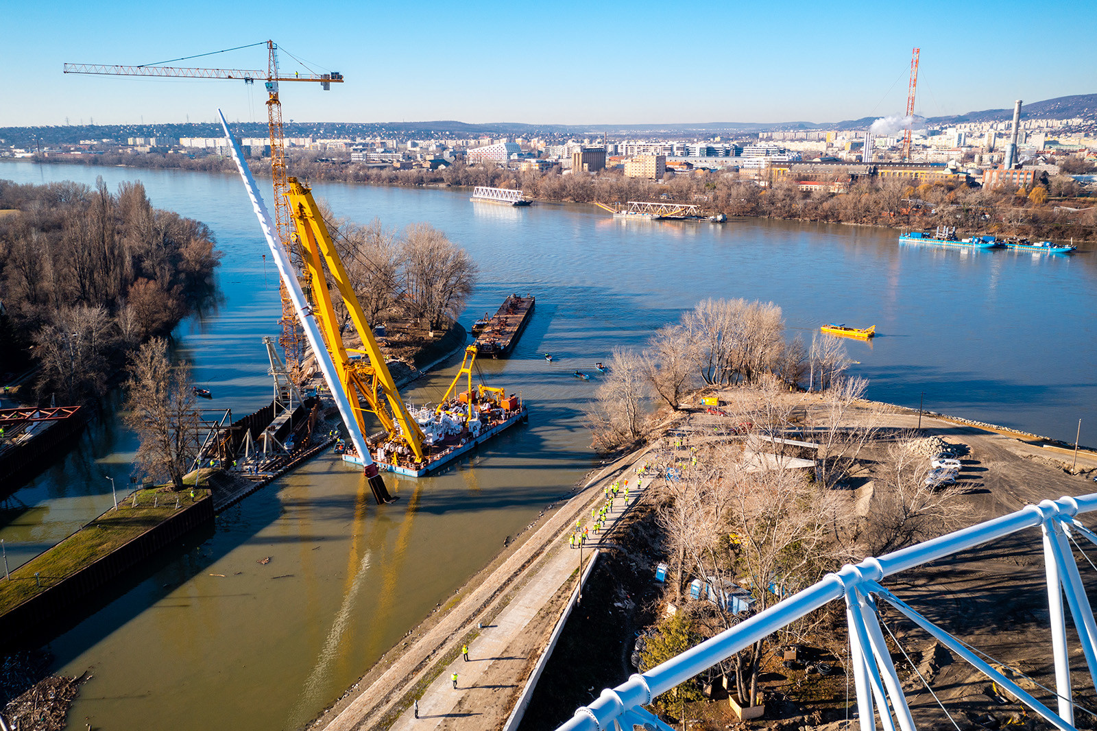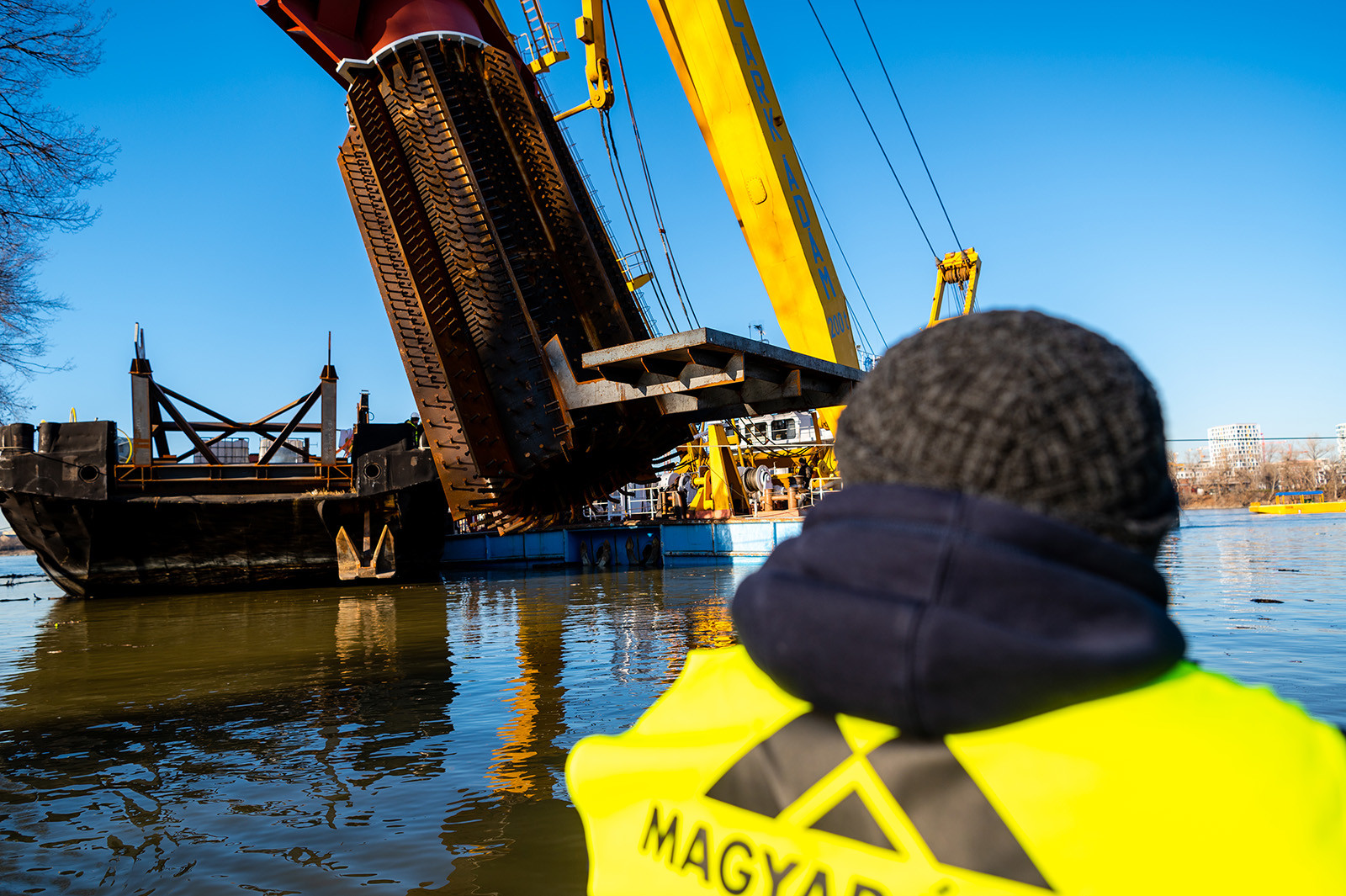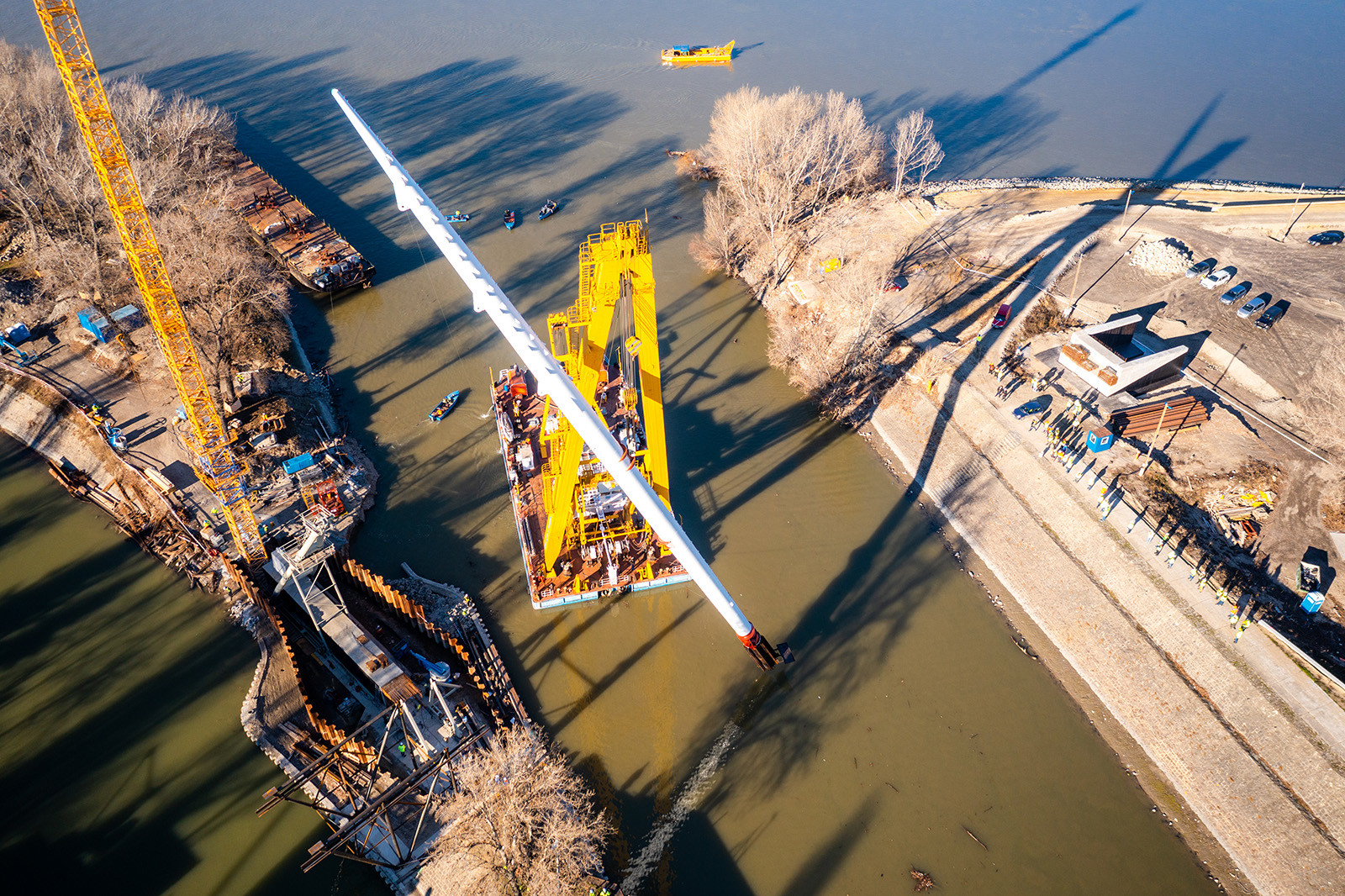 A 70 méter hosszú, közel 200 tonnás acélelem behelyezése a Clark Ádám úszódaru segítségével valósult meg mindössze néhány óra leforgása alatt.