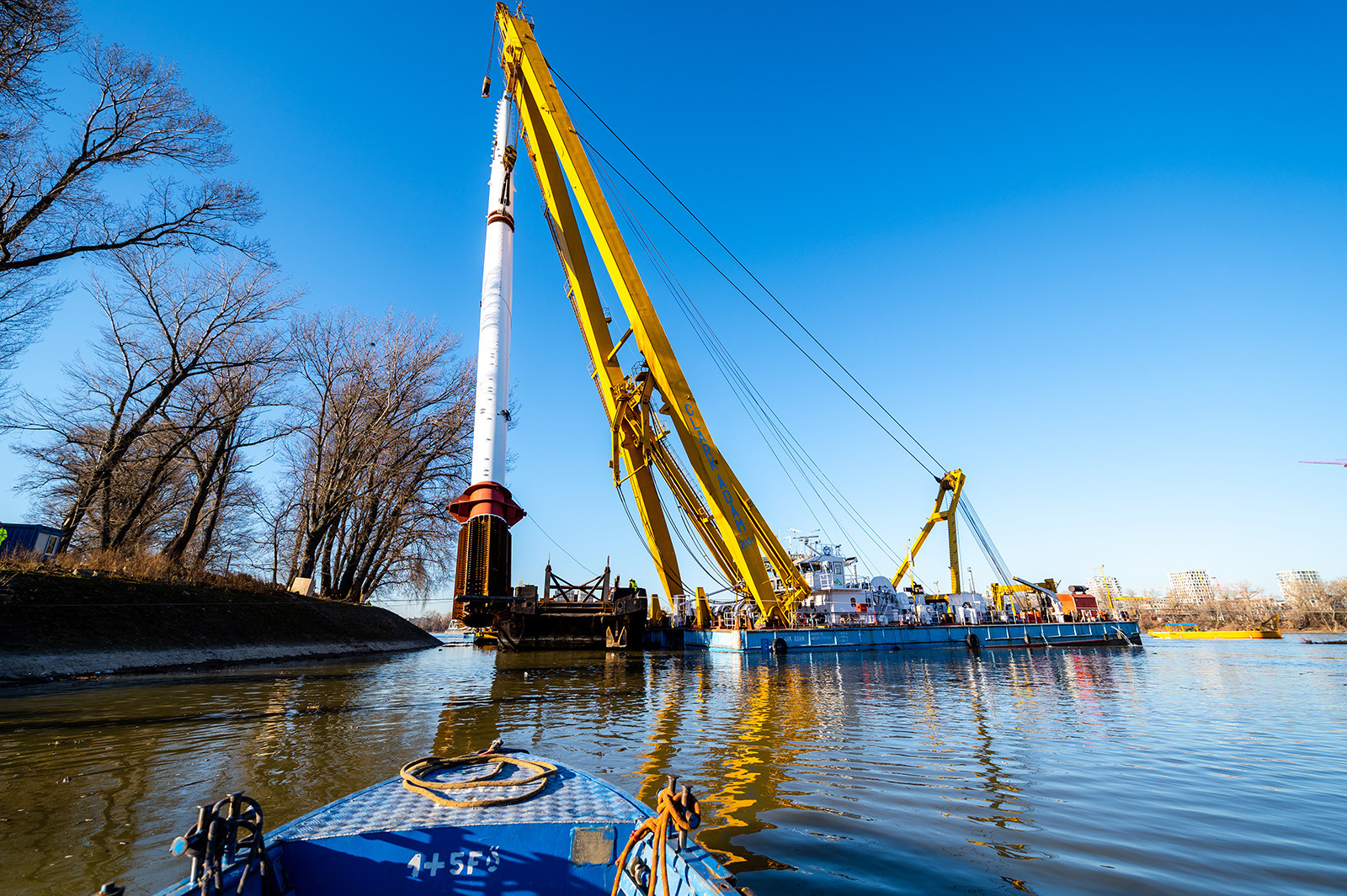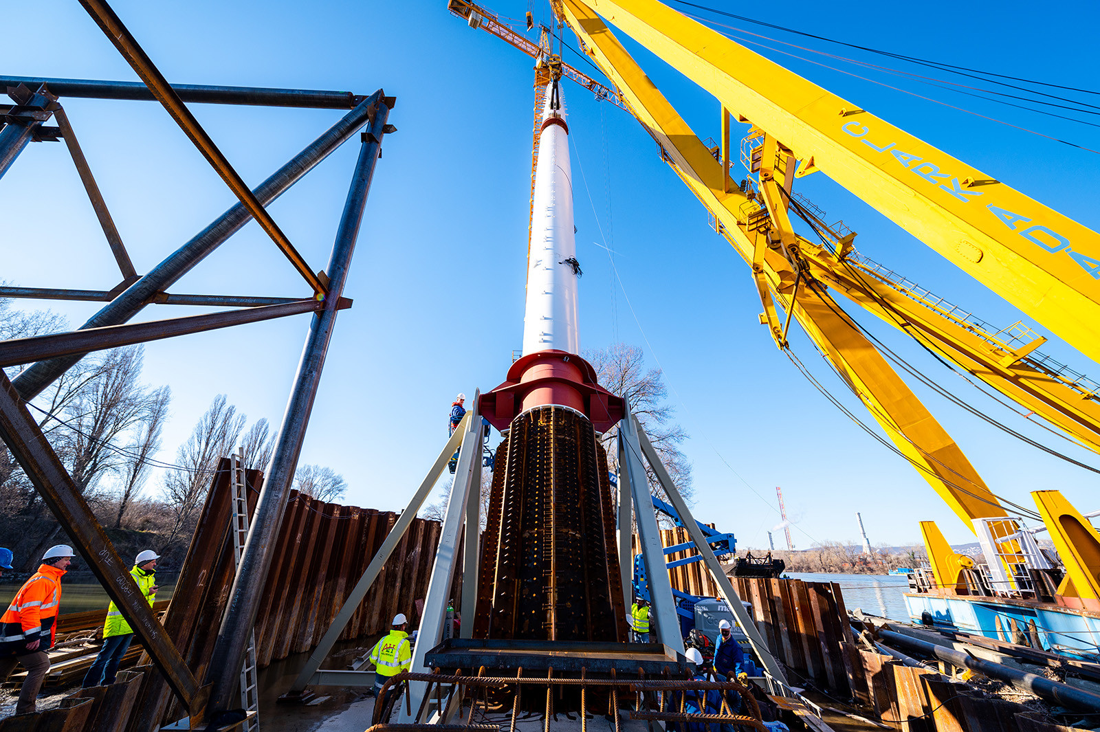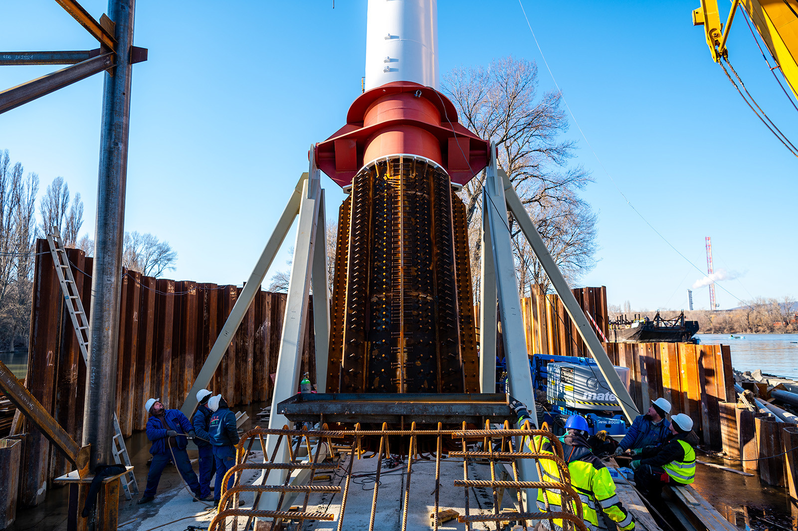 A 70 méter hosszú - segédszerkezetekkel és behelyezett betonacélokkal együtt közel 200 tonnás - acélelem behelyezése a Clark Ádám úszódaru teljes emelési kapacitásának kihasználásával bizonyult lehetségesnek. A daruról a pilont egy forgató állványra helyezték, és acél-segédszerkezetekkel forgatták végleges helyzetébe.