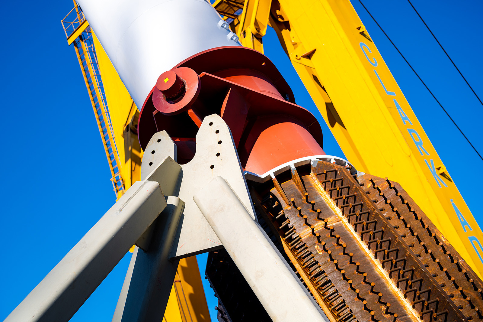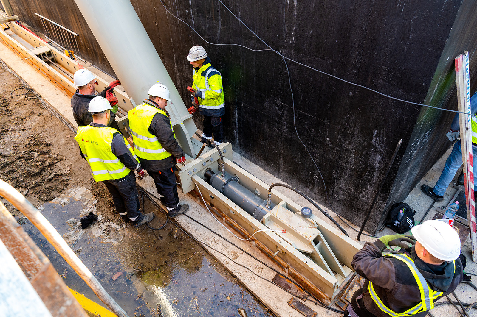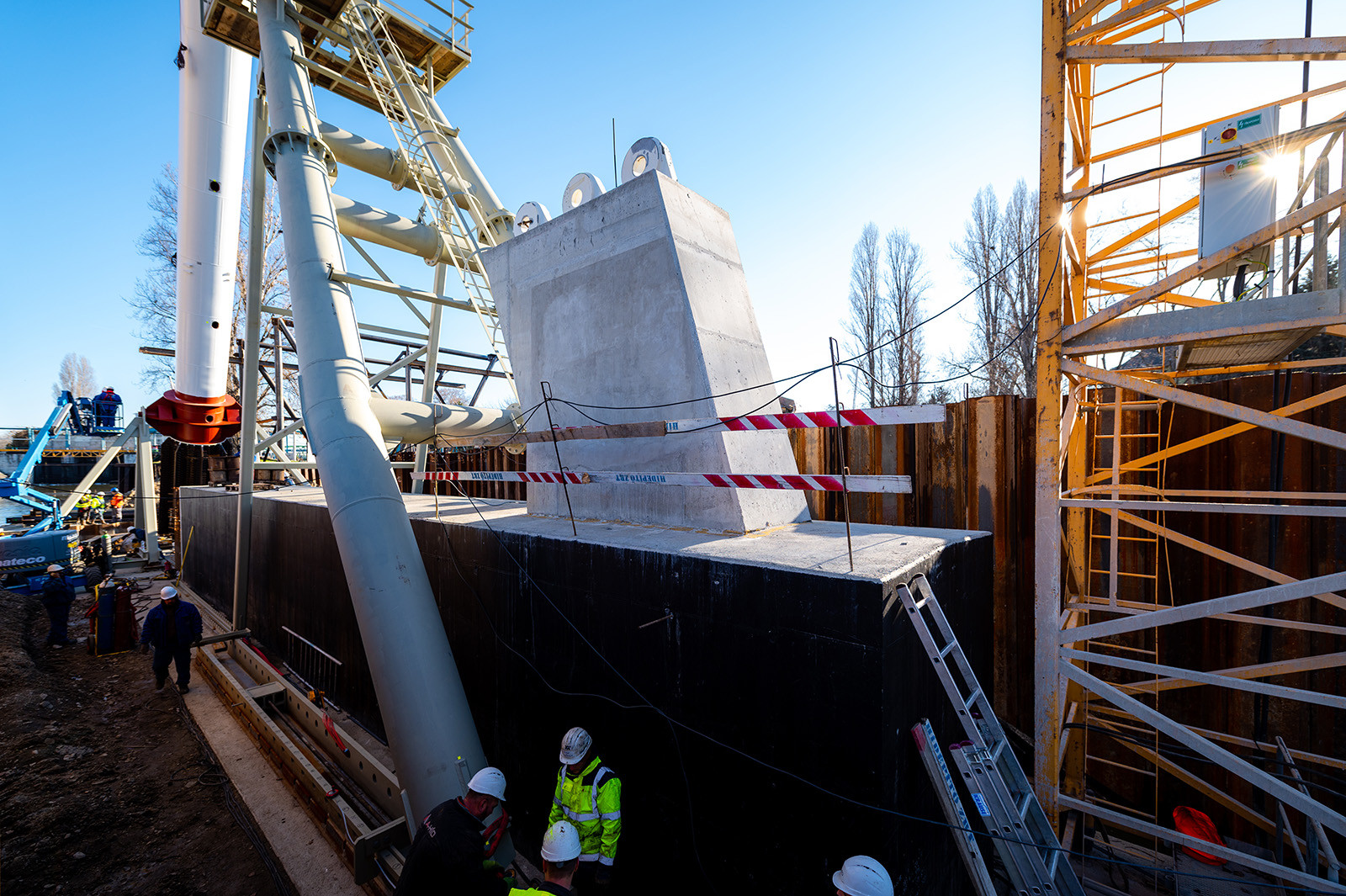 A 70 méter hosszú - segédszerkezetekkel és behelyezett betonacélokkal együtt közel 200 tonnás - acélelem behelyezése a Clark Ádám úszódaru teljes emelési kapacitásának kihasználásával bizonyult lehetségesnek. A daruról a pilont egy forgató állványra helyezték, és acél-segédszerkezetekkel forgatták végleges helyzetébe.
