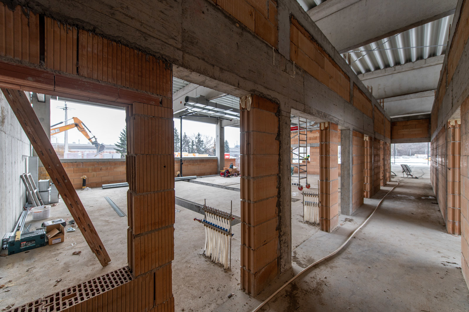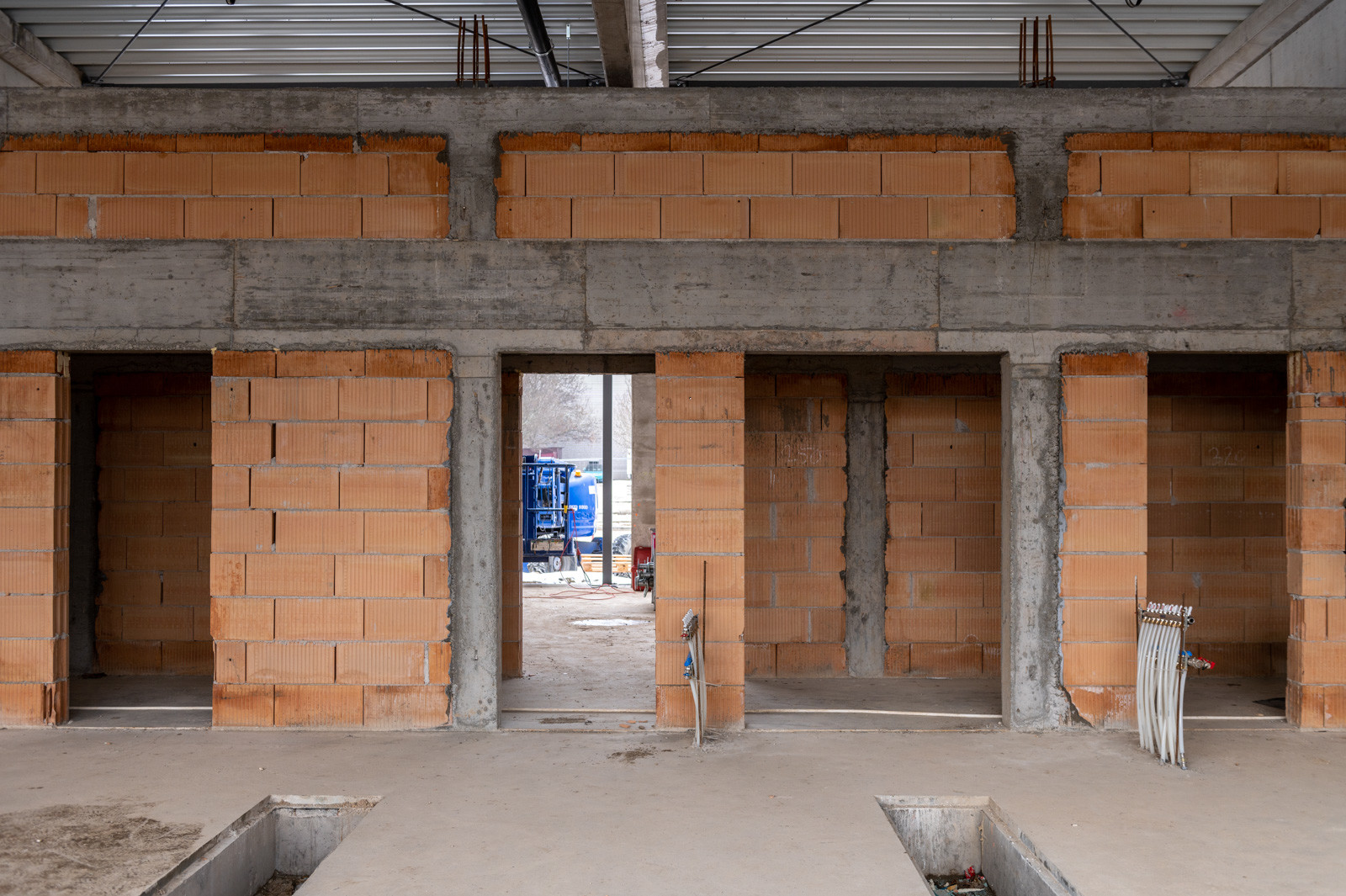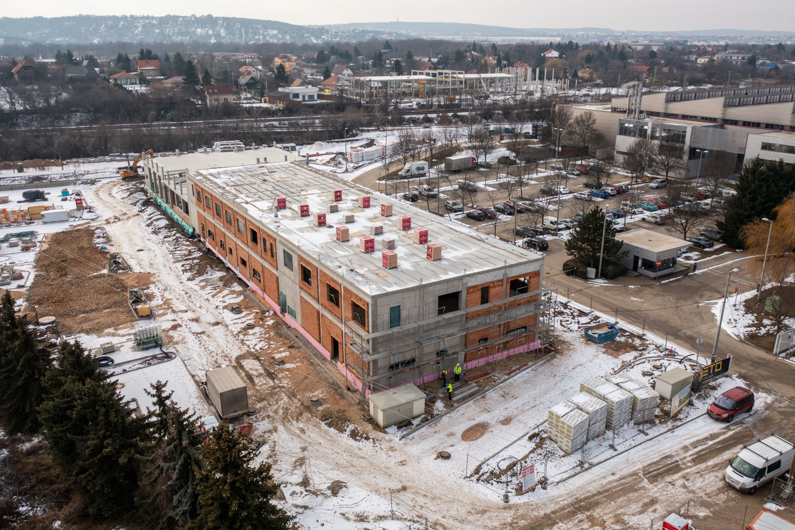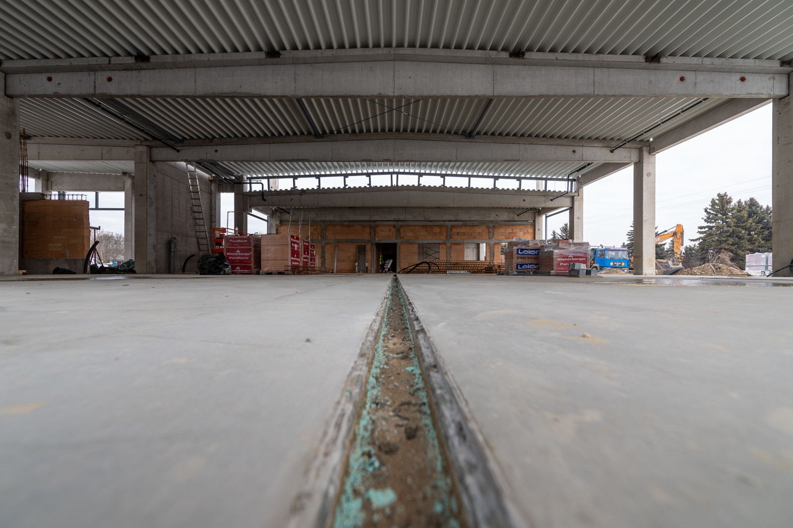 „Az északi szárny kétszintes, itt az osztó- és a zárófödém is körüreges födémpallókkal készül, míg a déli, egyszintes szárnyon feszített vasbeton gerendák hidalják át a közel harminc méteres szabad nyílásközt, melyekre magasbordás acél trapézlemez zárófödém készül” – árulta el a szakember.
