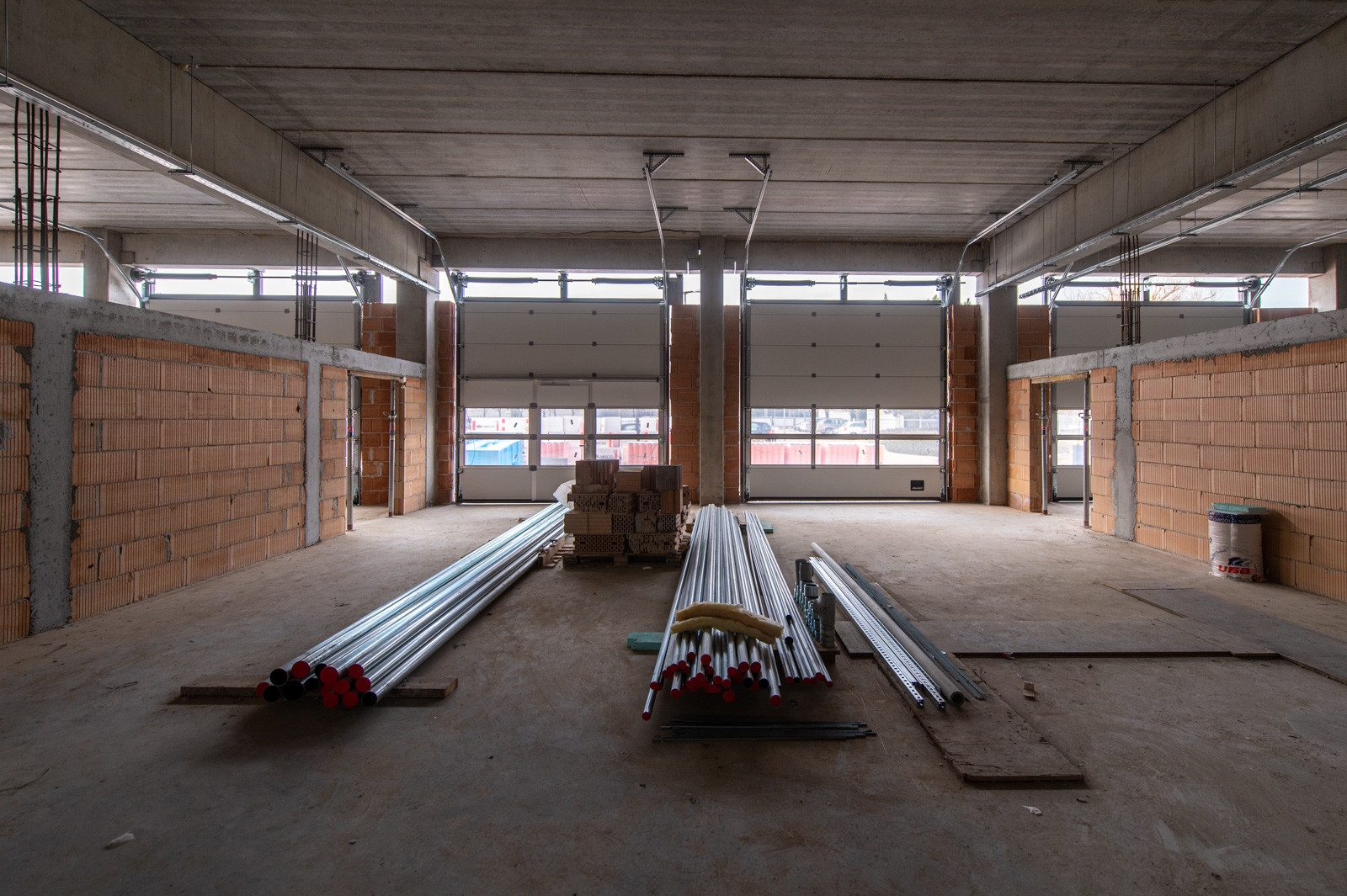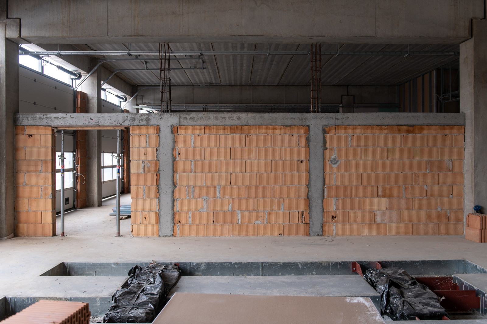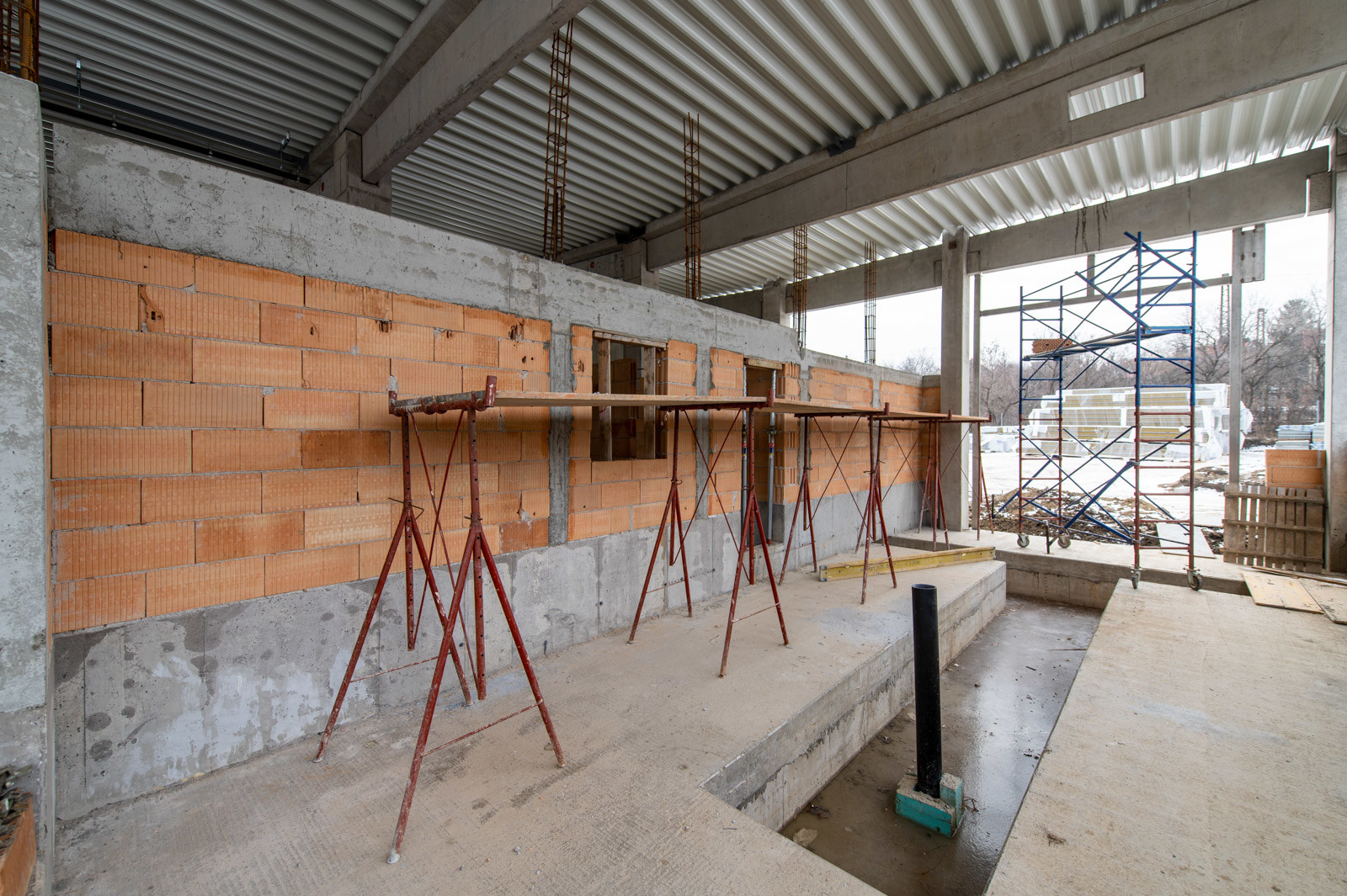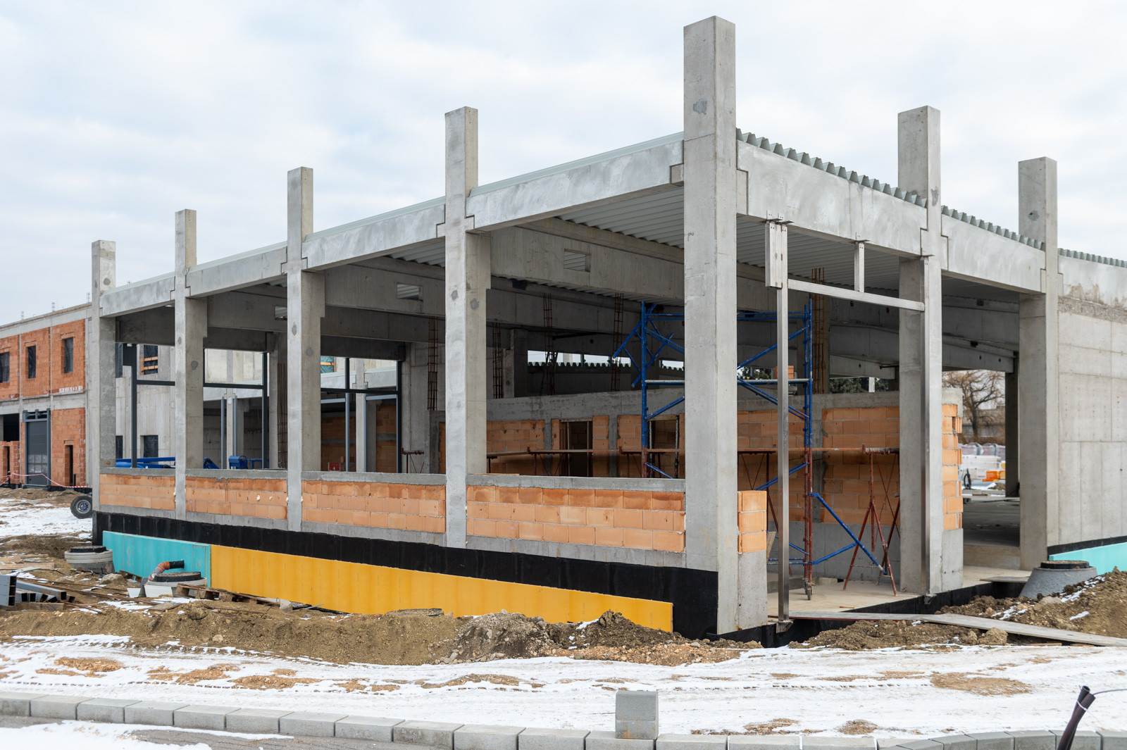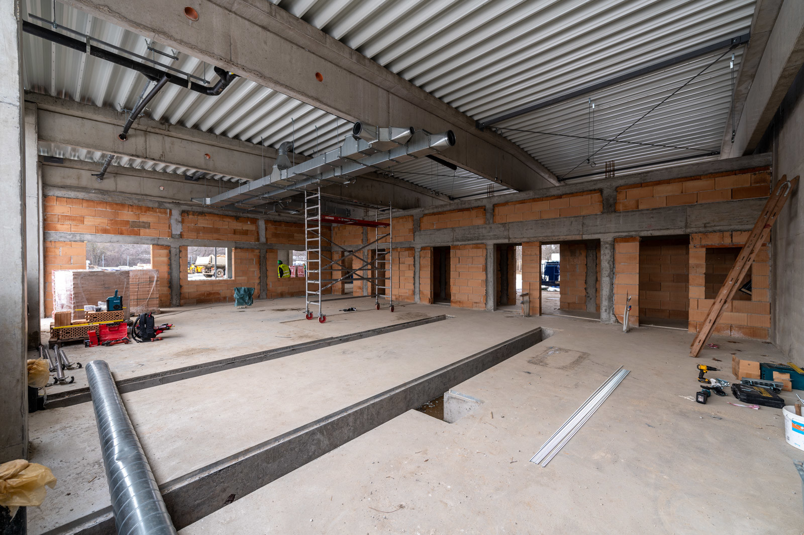 „Az északi szárny kétszintes, itt az osztó- és a zárófödém is körüreges födémpallókkal készül, míg a déli, egyszintes szárnyon feszített vasbeton gerendák hidalják át a közel harminc méteres szabad nyílásközt, melyekre magasbordás acél trapézlemez zárófödém készül” – árulta el a szakember.