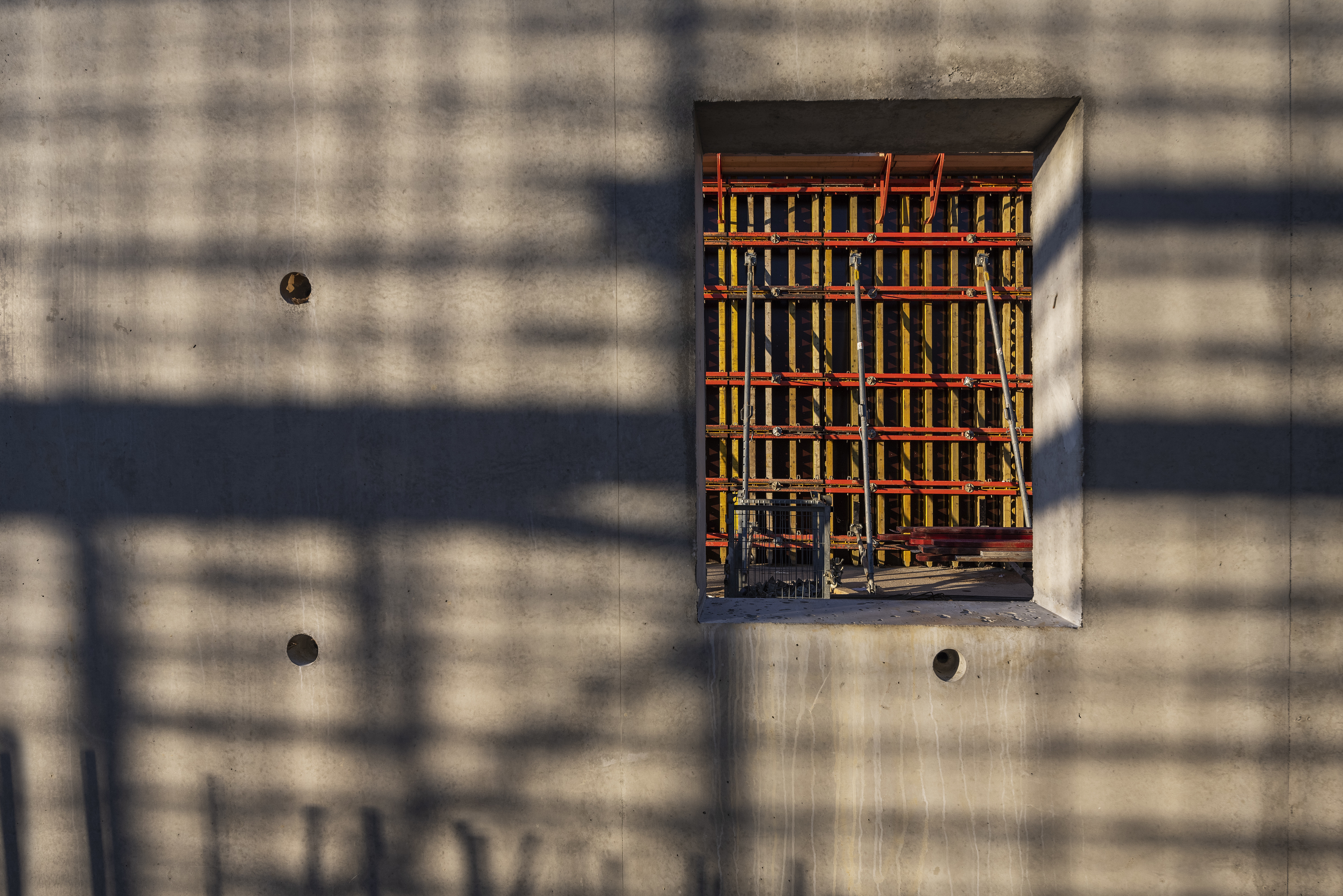 A látszóbeton falak kivitelezésének kritikus pontja a betonozási ütemhatárokon a munkahézagok kialakítása, ezért a falszakaszok végzárásánál „árnyékfuga” alkalmazásával biztosították az egyenletes kiosztású megjelenést.