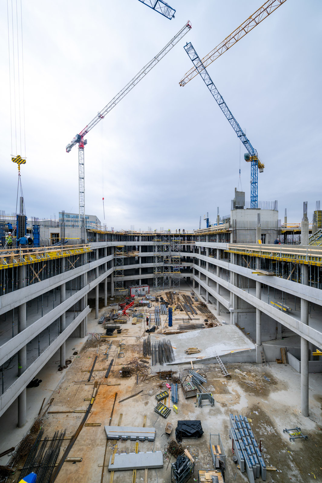Az 5. emeletnél járnak a kivitelezők, majd a következő időszakban elkészülnek a hátralevő szintek szerkezetei is, végül a tetőtéri acélszerkezetek.