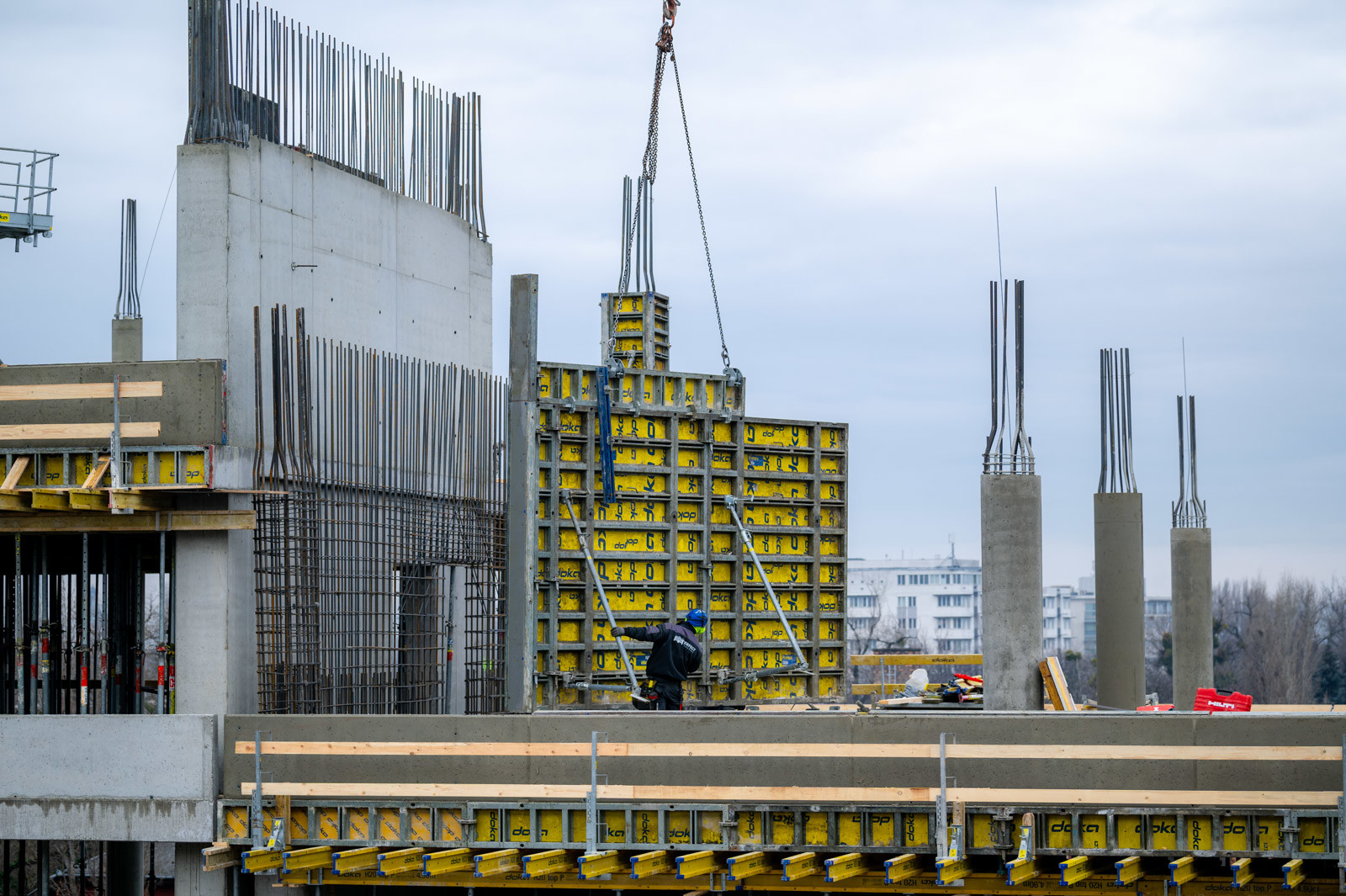 Cserneczky Zsolt kifejtette, folyamatosan készítik a monolit vasbeton szerkezeteket, - pilléreket, falakat, gerendákat és födémeket – valamint az előregyártott vasbeton lépcsőket és homlokzati díszpárkányokat. A kivitelezés jelenleg a 4-5. emeleti szerkezetek építésénél tart.