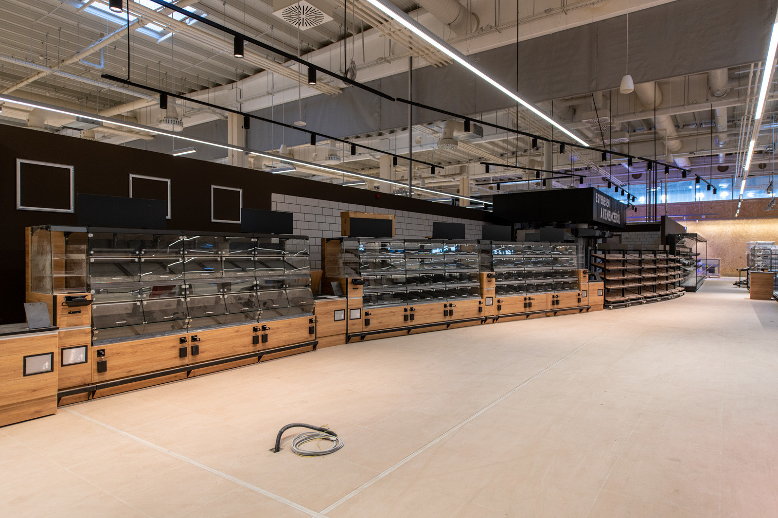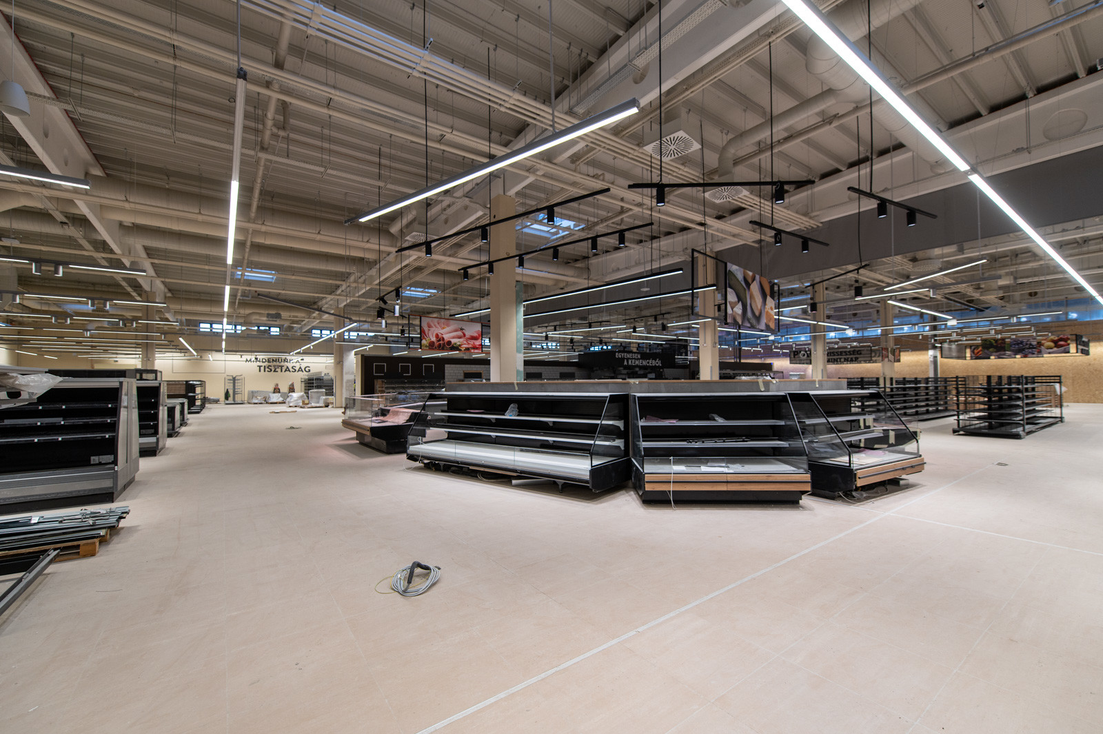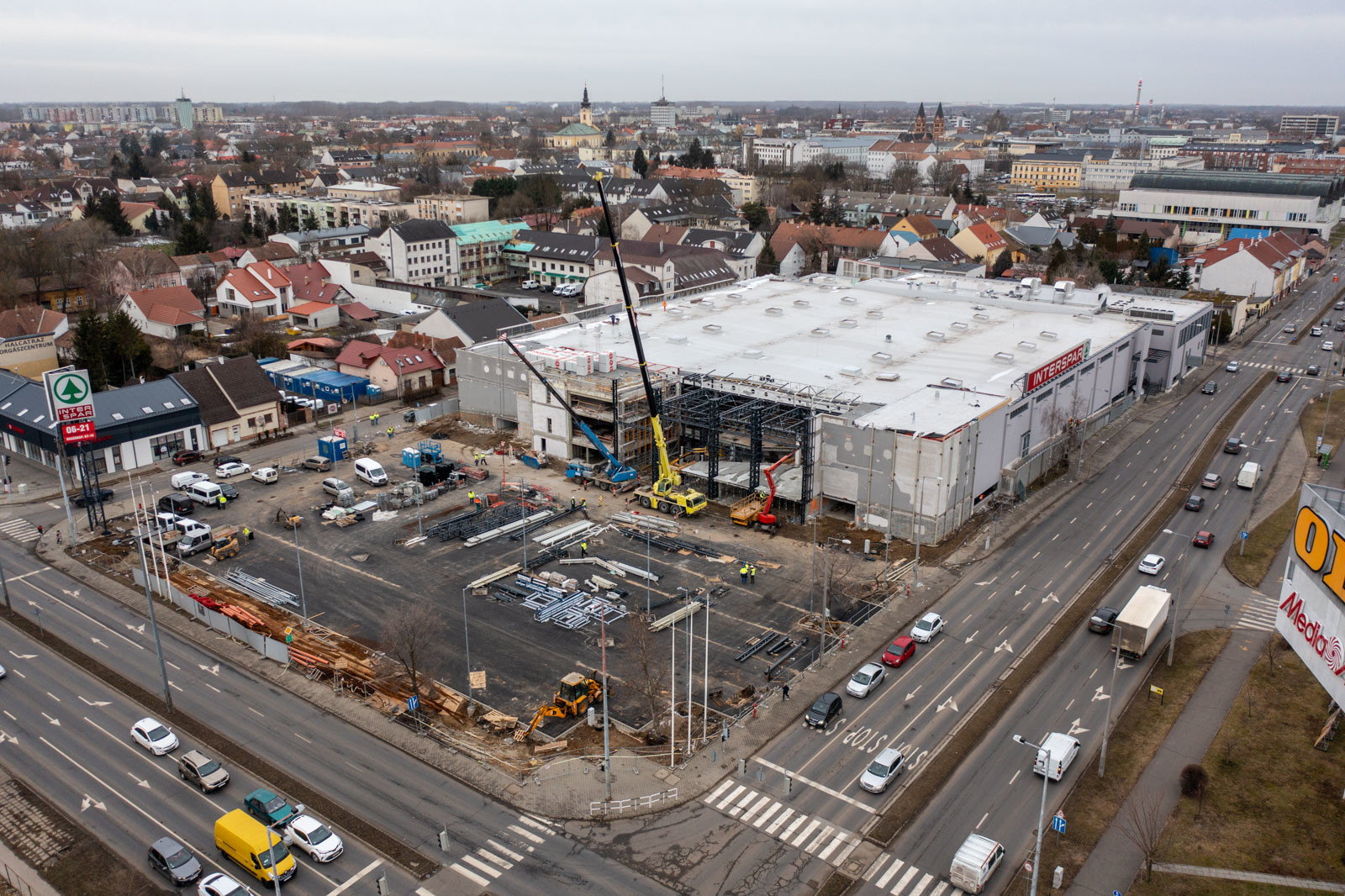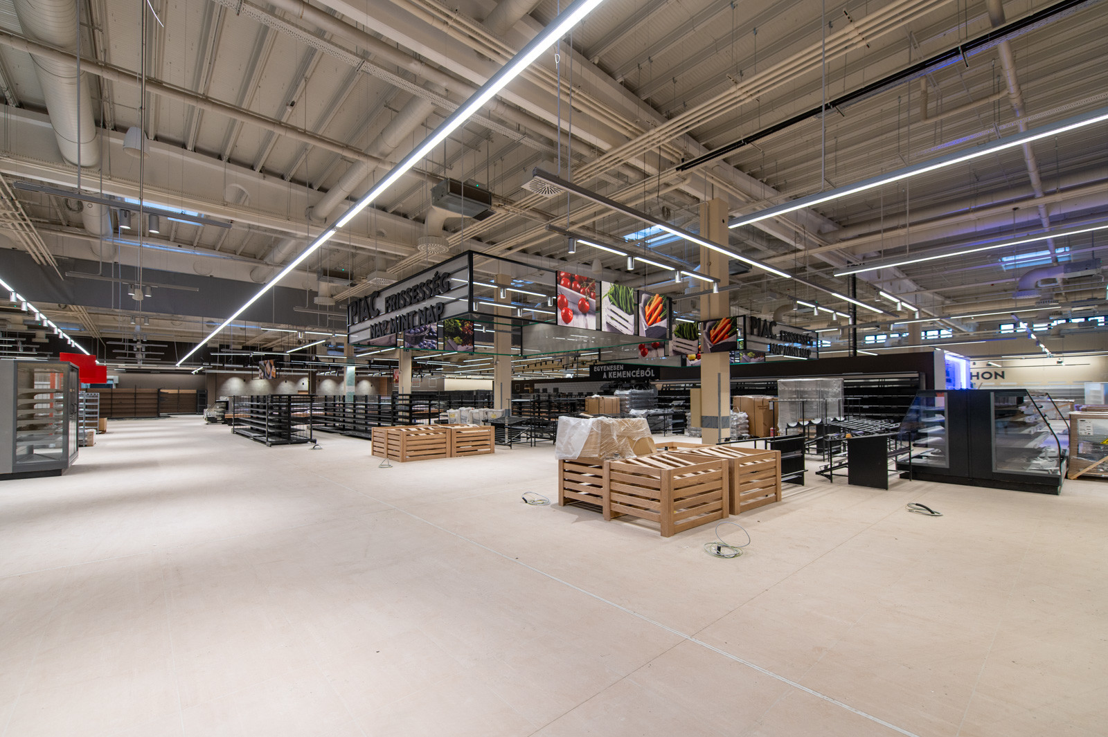 Jelenleg a fejépületen tetőszerkezeti, függönyfal, lépcső és belső szerkezetépítési és építészeti munkák zajlanak, míg a belső vásárlótéri szinten a polcokat, hűtőket, regálokat, design elemeket szerelnek.