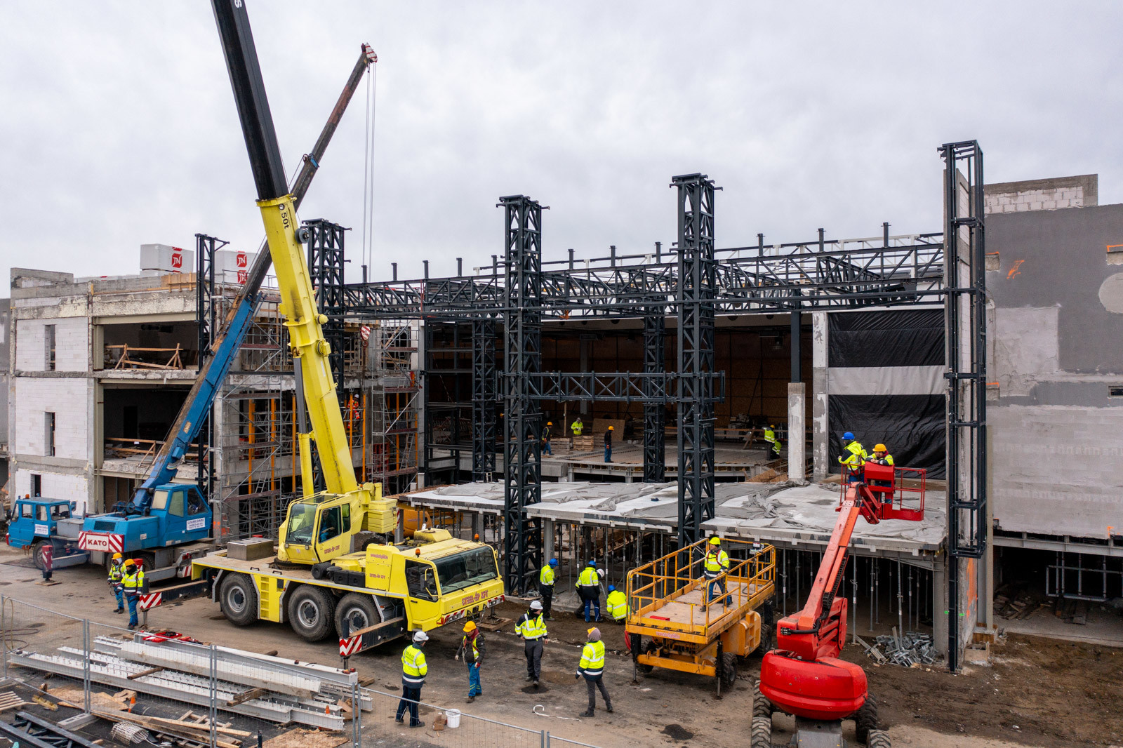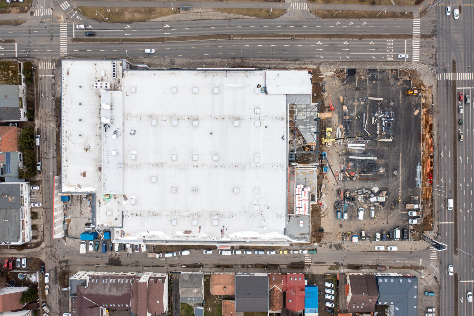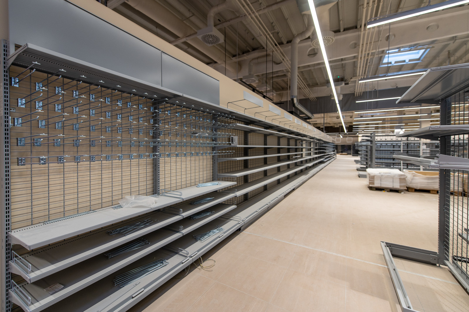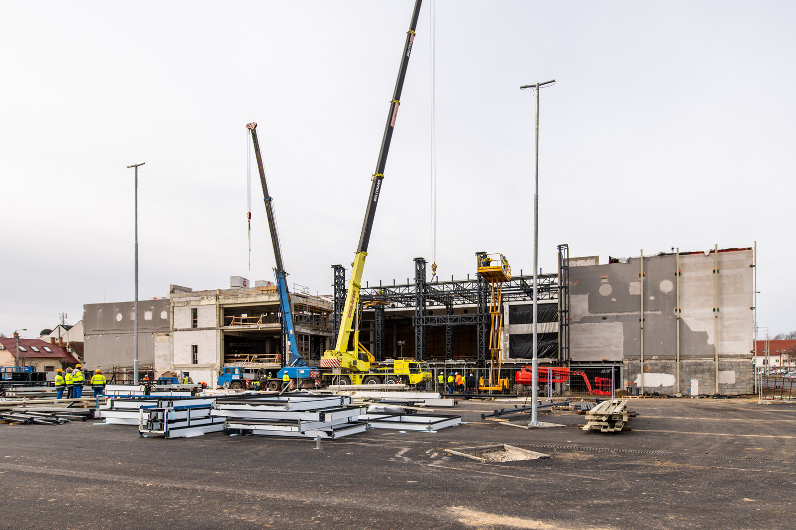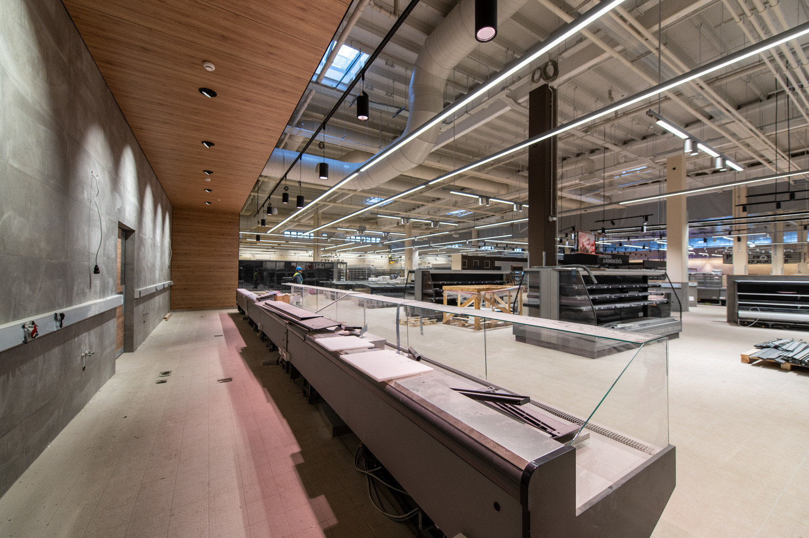 Jelenleg a fejépületen tetőszerkezeti, függönyfal, lépcső és belső szerkezetépítési és építészeti munkák zajlanak, míg a belső vásárlótéri szinten a polcokat, hűtőket, regálokat, design elemeket szerelnek.