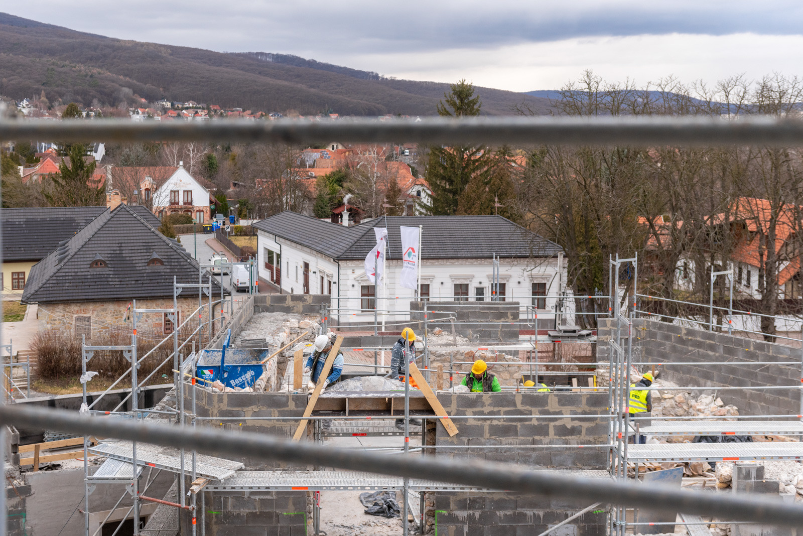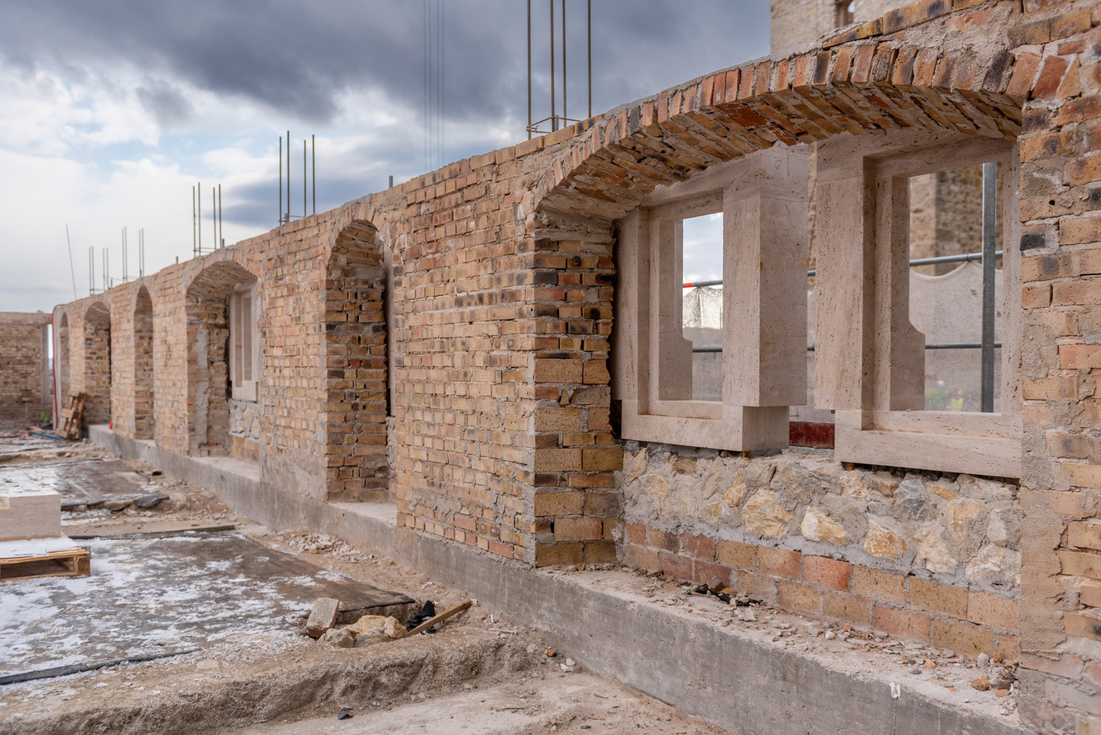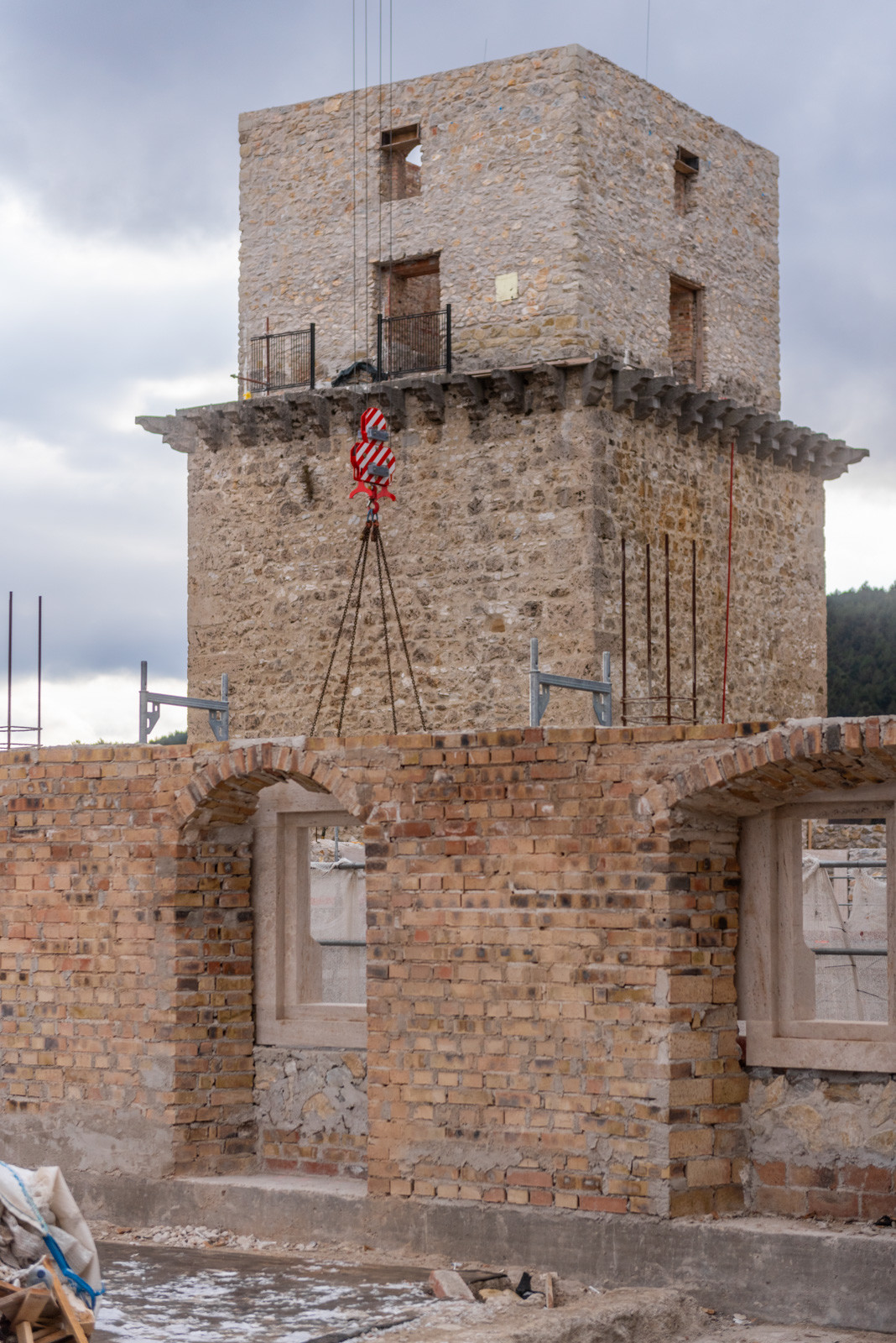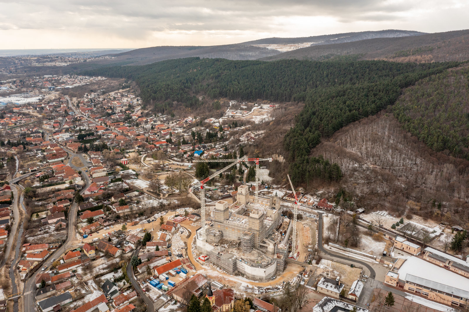 Itt szintén haladtak az utóbbi időben a kivitelezők a feladatokkal, melyek közül többek között az ikertonyok kőbordákkal erősített keresztboltozatainak falazásáról tájékoztatták lapunkat az Épkar szakemberei. Érdekességképpen itt azt emelték ki, hogy ezt a munkát több, fából készült keresztboltozati szerkezet felhasználásával végzik el, melyeket a gyártmánytervek alapján egy professzionális ács csapat készített el.