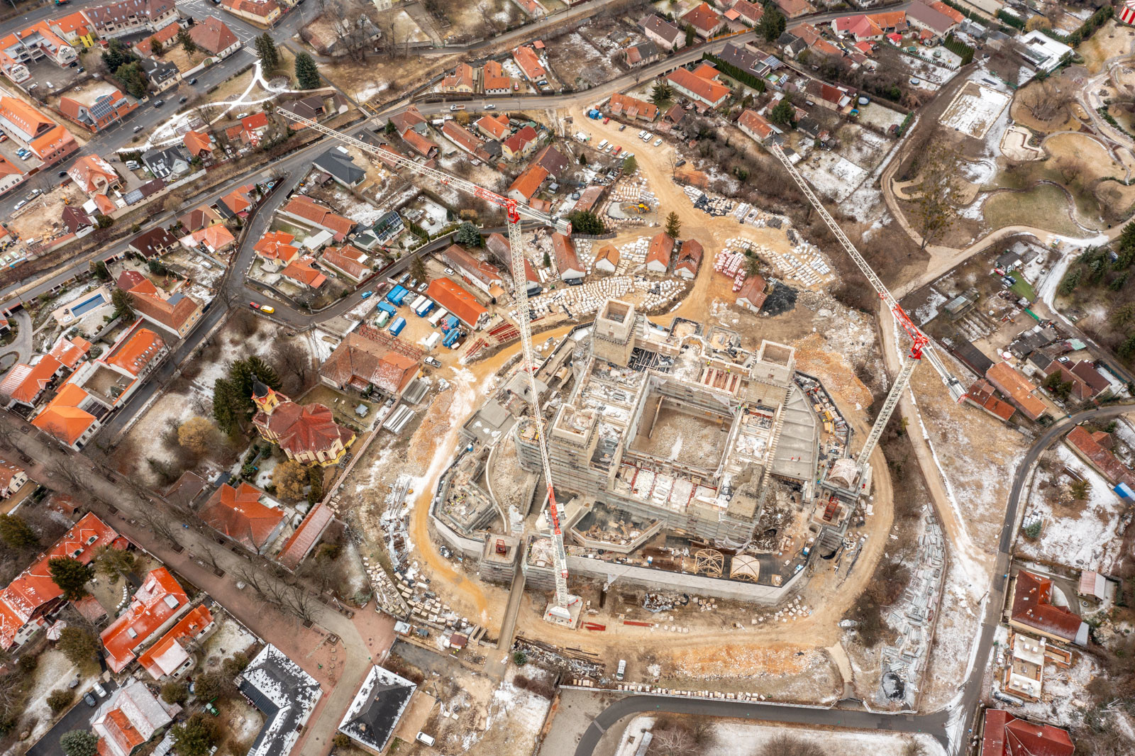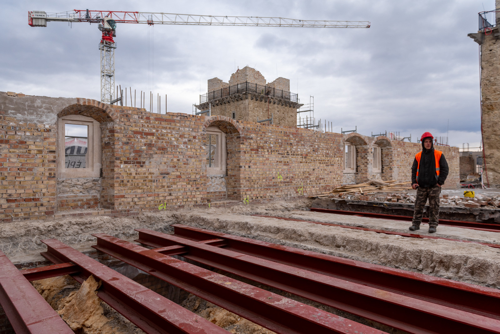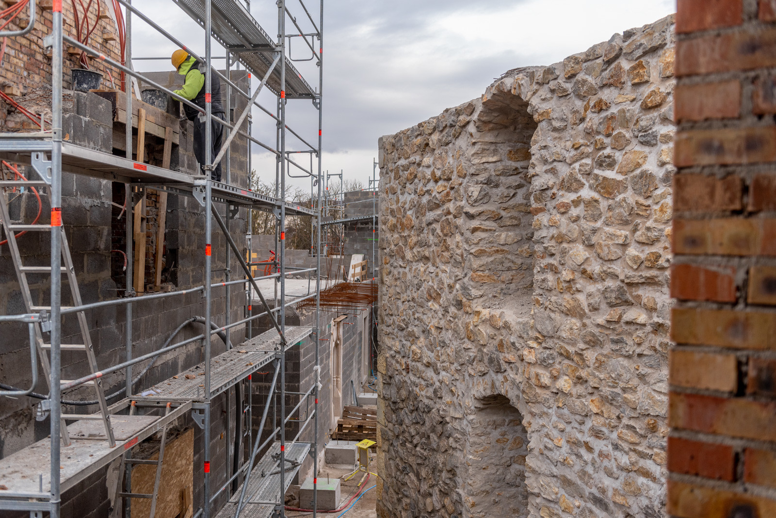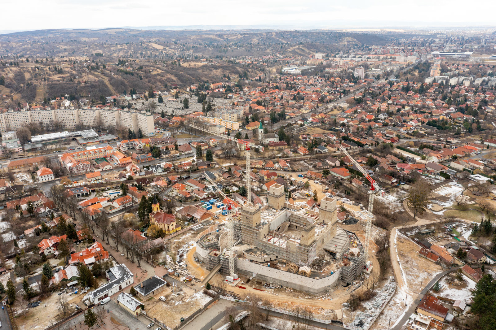 Itt szintén haladtak az utóbbi időben a kivitelezők a feladatokkal, melyek közül többek között az ikertonyok kőbordákkal erősített keresztboltozatainak falazásáról tájékoztatták lapunkat az Épkar szakemberei. Érdekességképpen itt azt emelték ki, hogy ezt a munkát több, fából készült keresztboltozati szerkezet felhasználásával végzik el, melyeket a gyártmánytervek alapján egy professzionális ács csapat készített el.