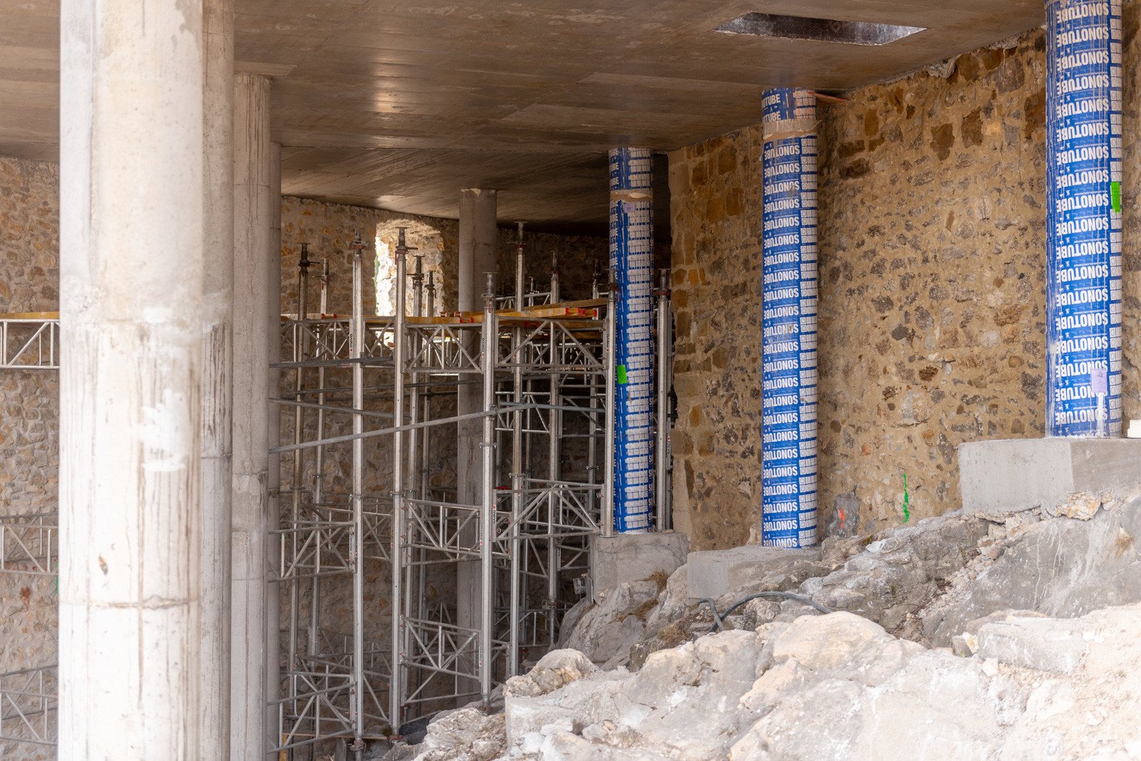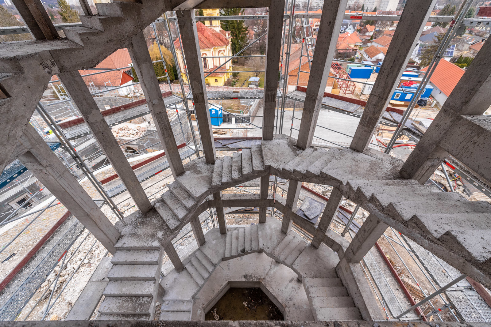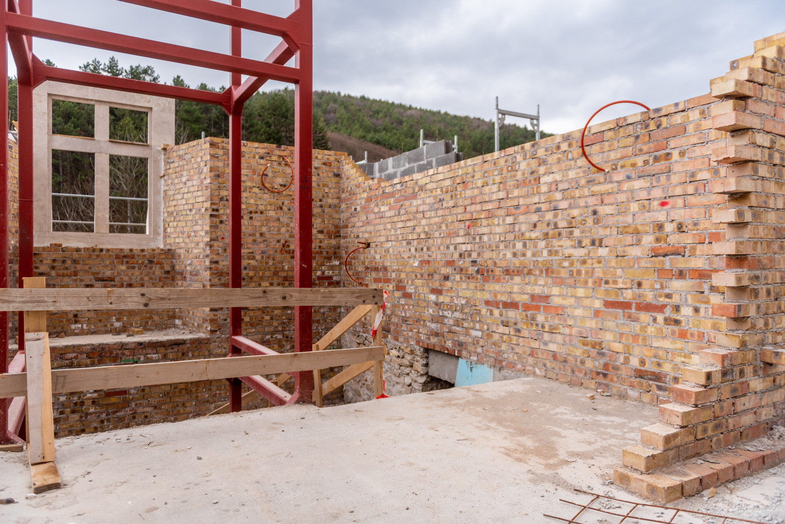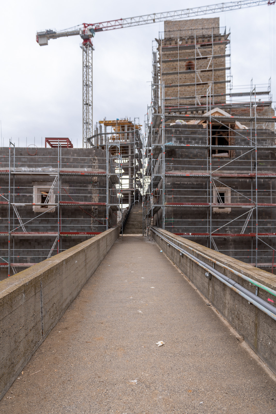 Itt szintén haladtak az utóbbi időben a kivitelezők a feladatokkal, melyek közül többek között az ikertonyok kőbordákkal erősített keresztboltozatainak falazásáról tájékoztatták lapunkat az Épkar szakemberei. Érdekességképpen itt azt emelték ki, hogy ezt a munkát több, fából készült keresztboltozati szerkezet felhasználásával végzik el, melyeket a gyártmánytervek alapján egy professzionális ács csapat készített el.