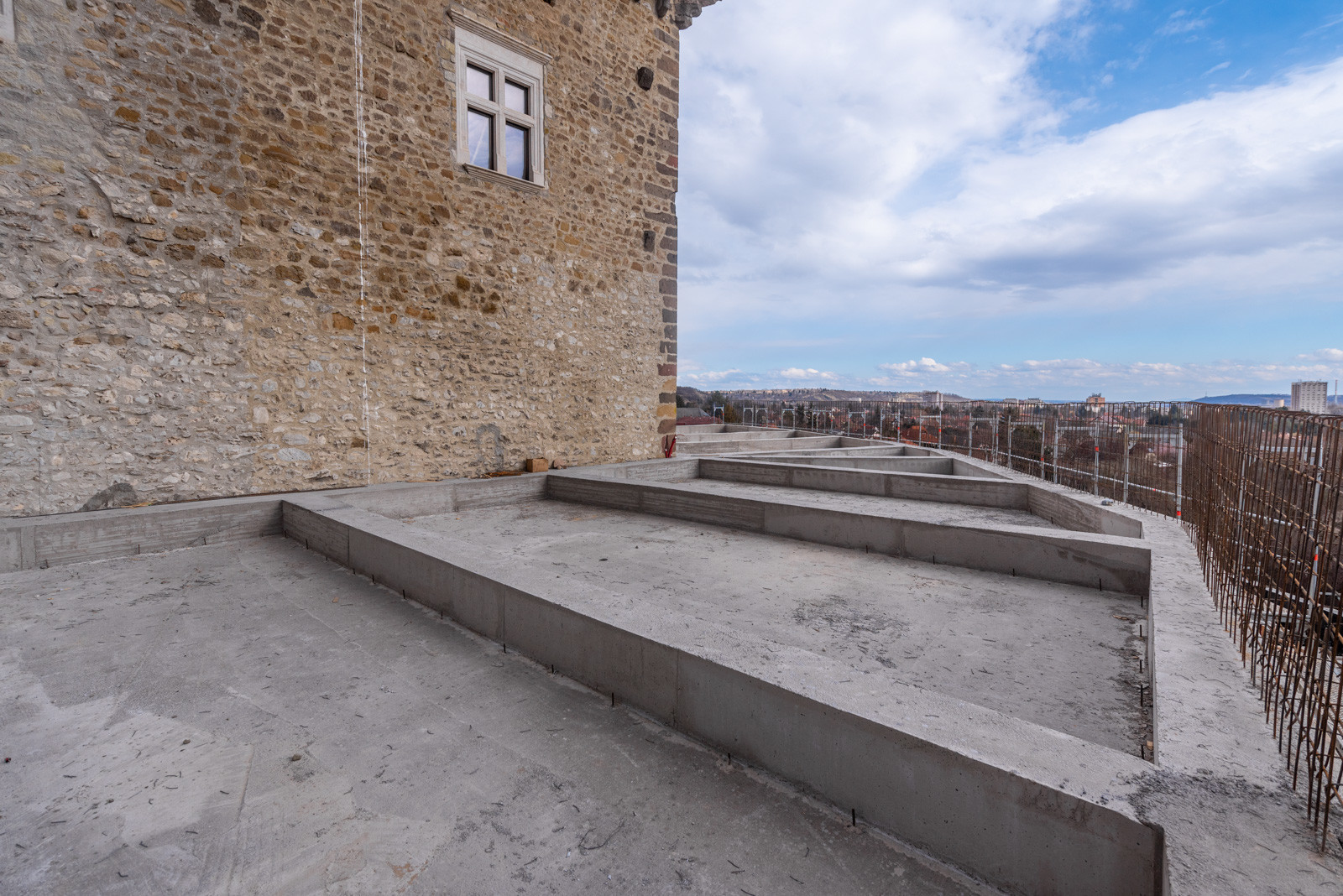 Szintén a külső várban jelentős mértékű szerkezetépítési munkák is folynak: dolgoznak a belső várba vezető hatszögletű lépcsőházi torony és az ezt körülölelő rámpák kialakításán (ezeknek a vár akadálymentes megközelítésében lesznek szerepük).