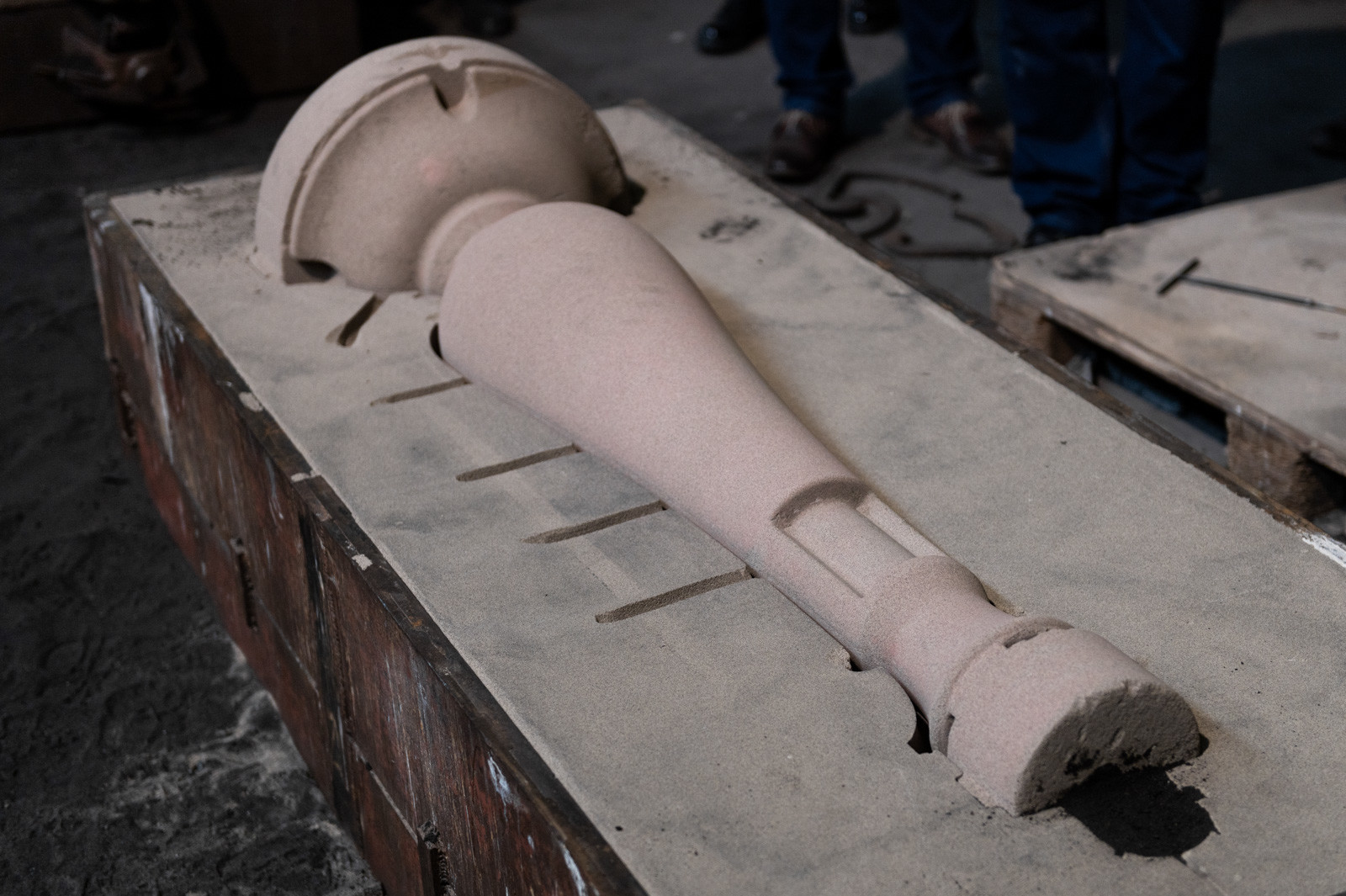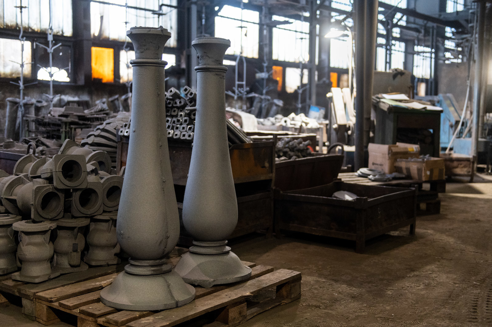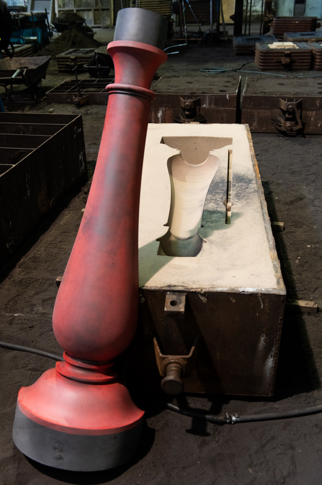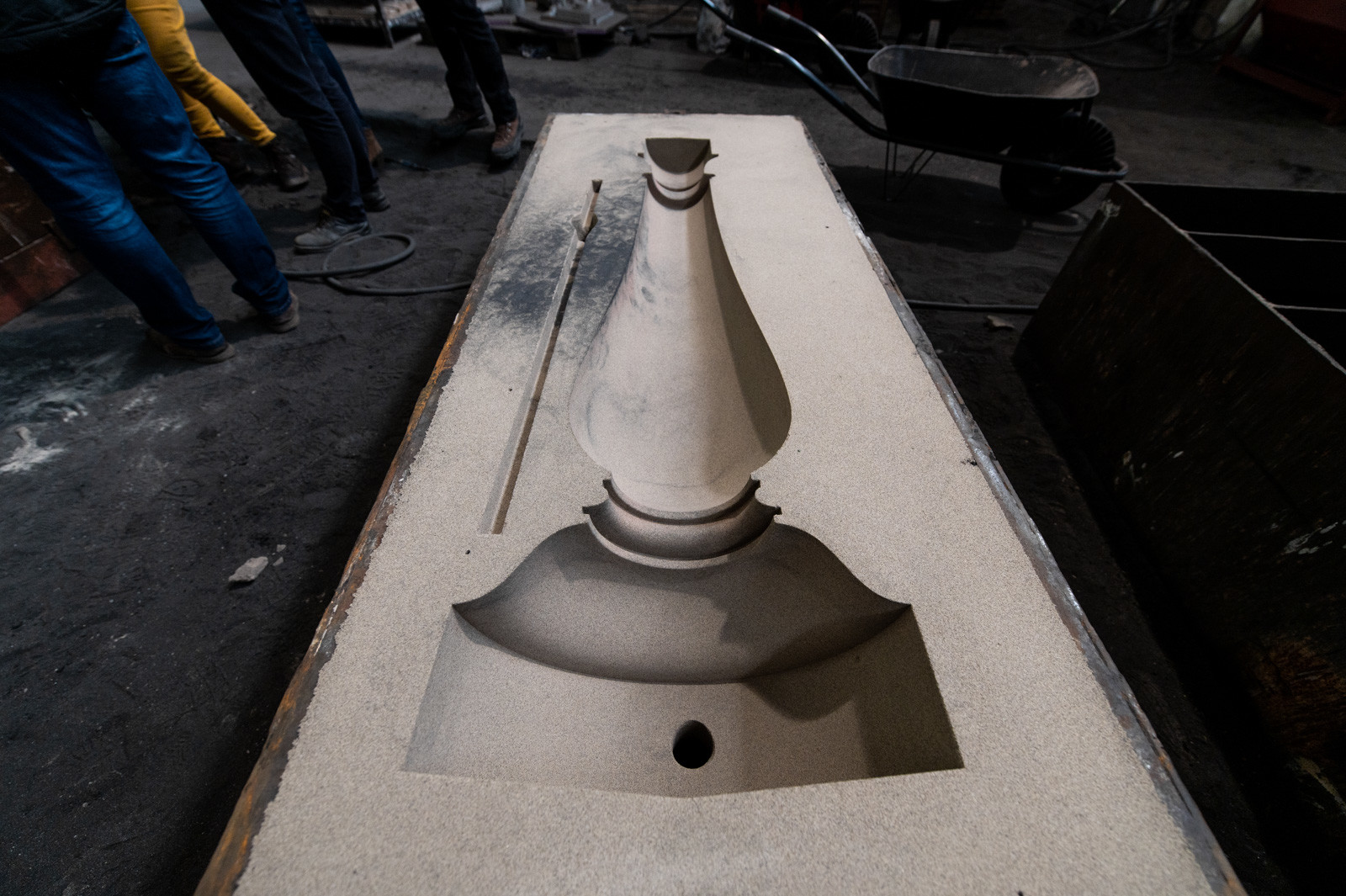 Úgynevezett homokszekrényekben először az öntőminták segítségével a kandeláberelemek negatív formáját hozzák létre, ezt követően homokból készült magminta behelyezésével alakítják ki a belső üregeket is. Az öntvényhez szükséges alapanyagot indukciós kemencékben melegítik, és ha a minősége megfelelő, 1400 fok körüli hőmérsékleten lecsapolják és üstökbe töltik az olvadékot. Innen öntik át a vasat a homokszekrényekbe, majd miután azok lehűlnek, kiveszik a kész vasöntvényeket, amelyek még egy gondos felülettisztítást követően kerülnek elszállításra az üzemből.