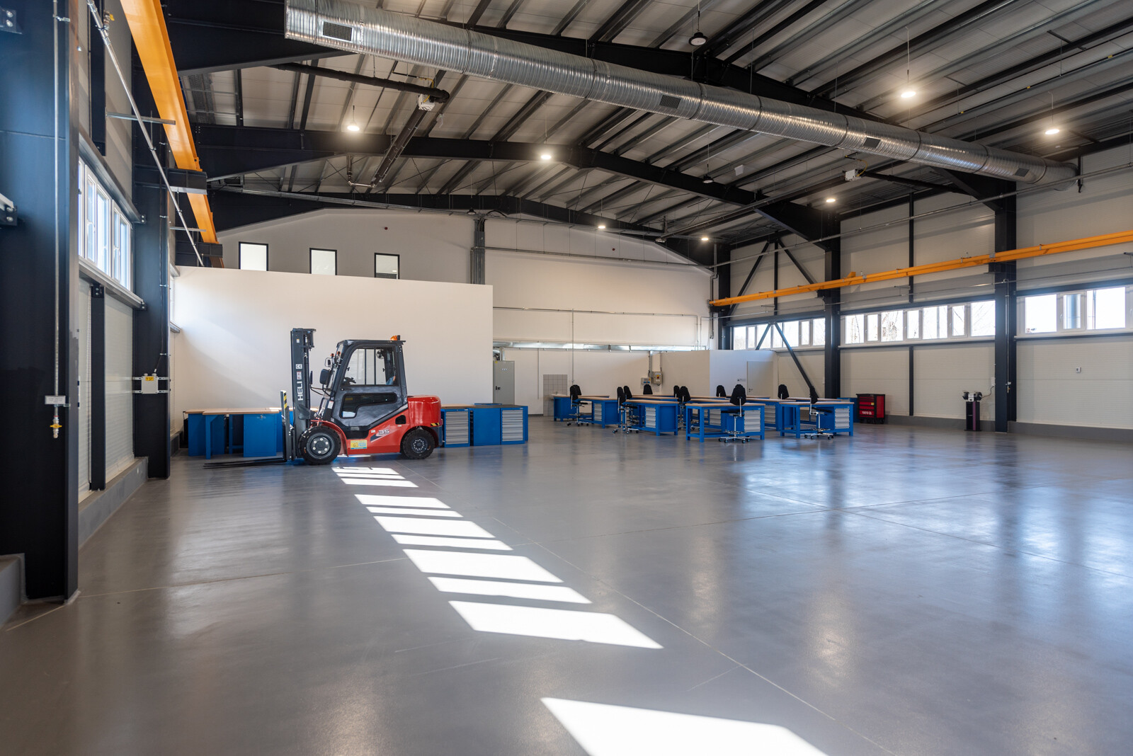 Az acélváz rendszerű, nagy belmagasságú csarnokrészben található az oktatócsarnok, továbbá egy kisebb mérőlabor is, amely a legmodernebb felszerelések befogadására is alkalmas. Az épület homlokzatát, illetve alacsony hajlású nyeregtetőjét korszerű kialakítású, fém fegyverzetű hőszigetelő szendvicspanel burkolattal látták el.