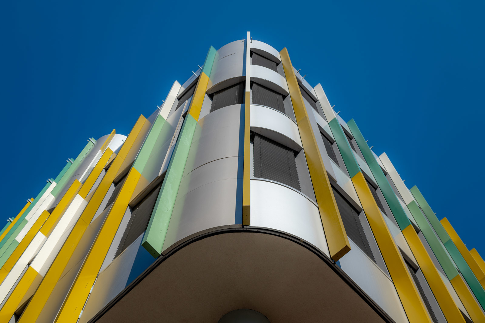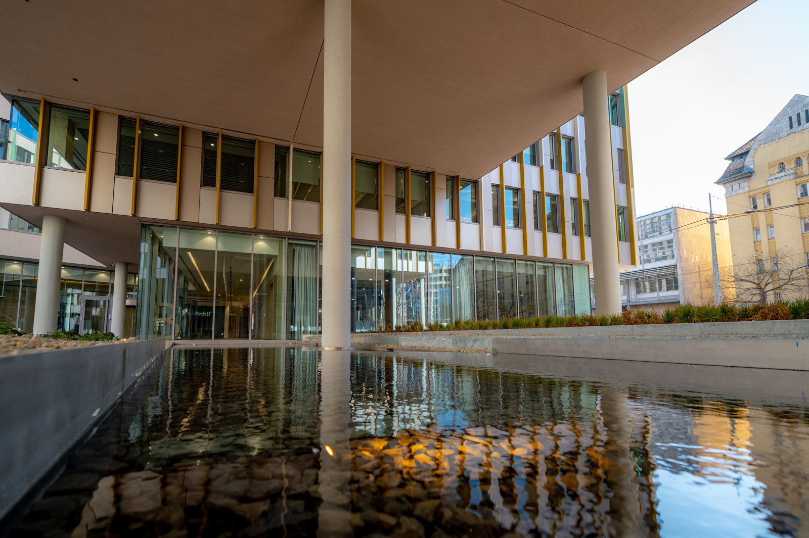 A tervezők ezt többféle építészeti megoldással, az épület mozgalmas megformálásával, a homlokzat visszahúzásával, árkádok, téröblök és a belső zöld udvar utcai felnyitásával érték el.