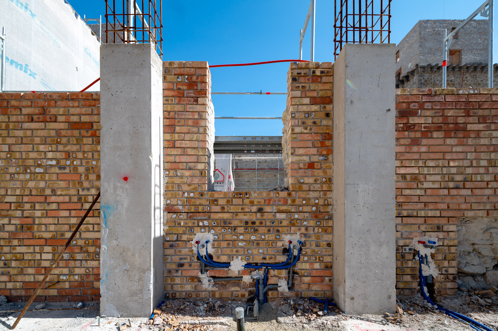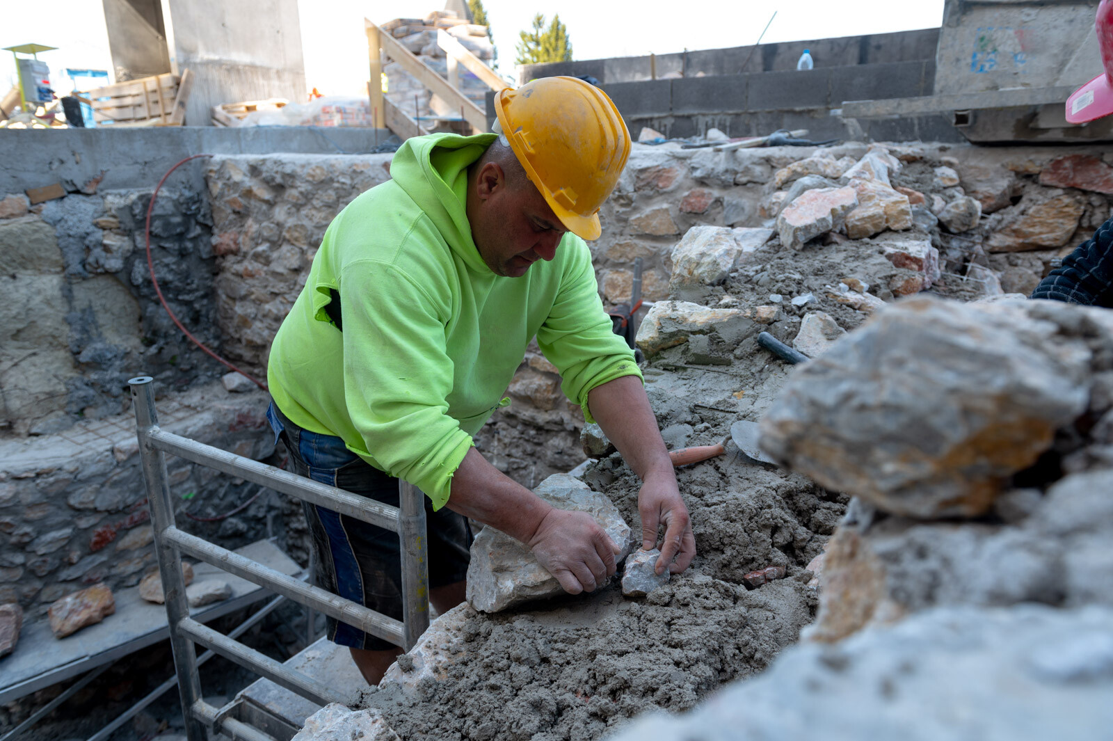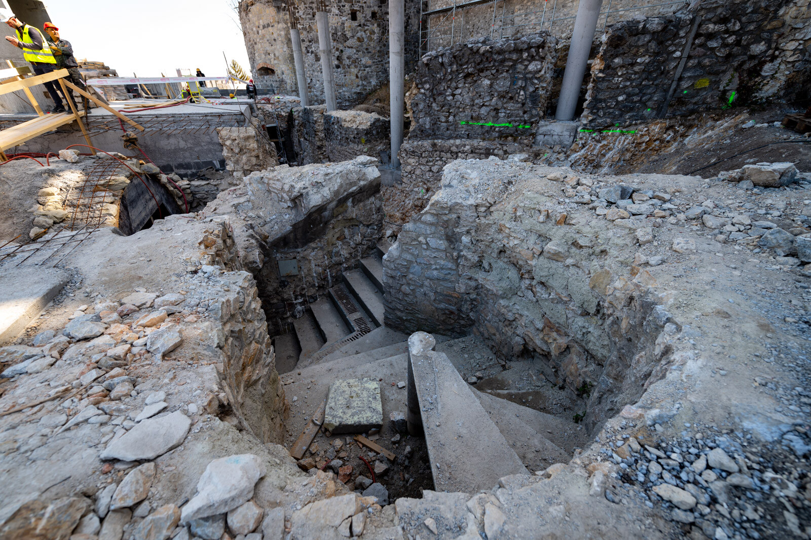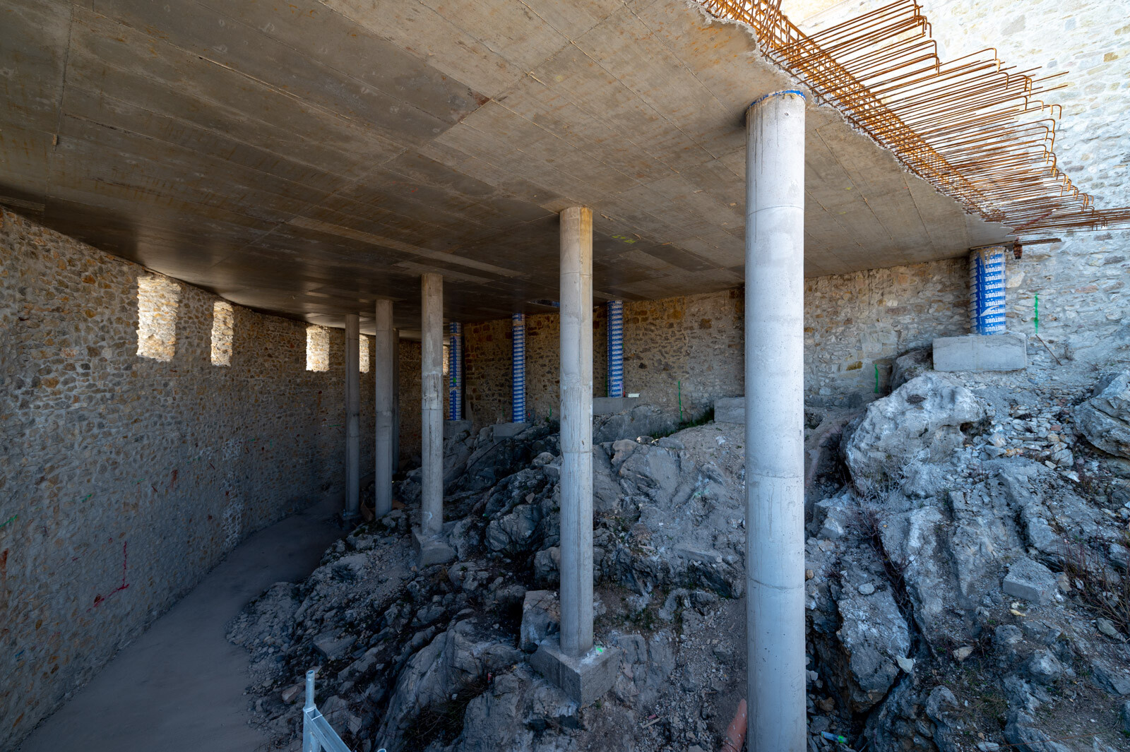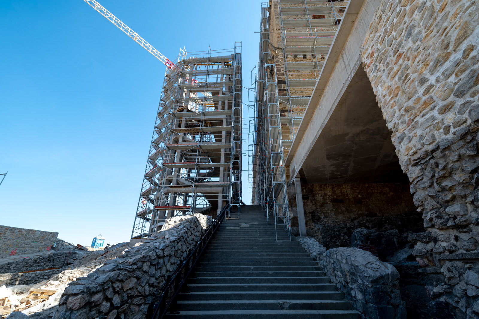 Itt a nyugati oldalon egy étterem várja majd a turistákat, ezt hatalmas tartópillérek támasztják alá: a kivitelezők az elmúlt időszakban ezeken a pilléreken dolgoztak, illetve hamarosan kőburkolattal is ellátják őket.
