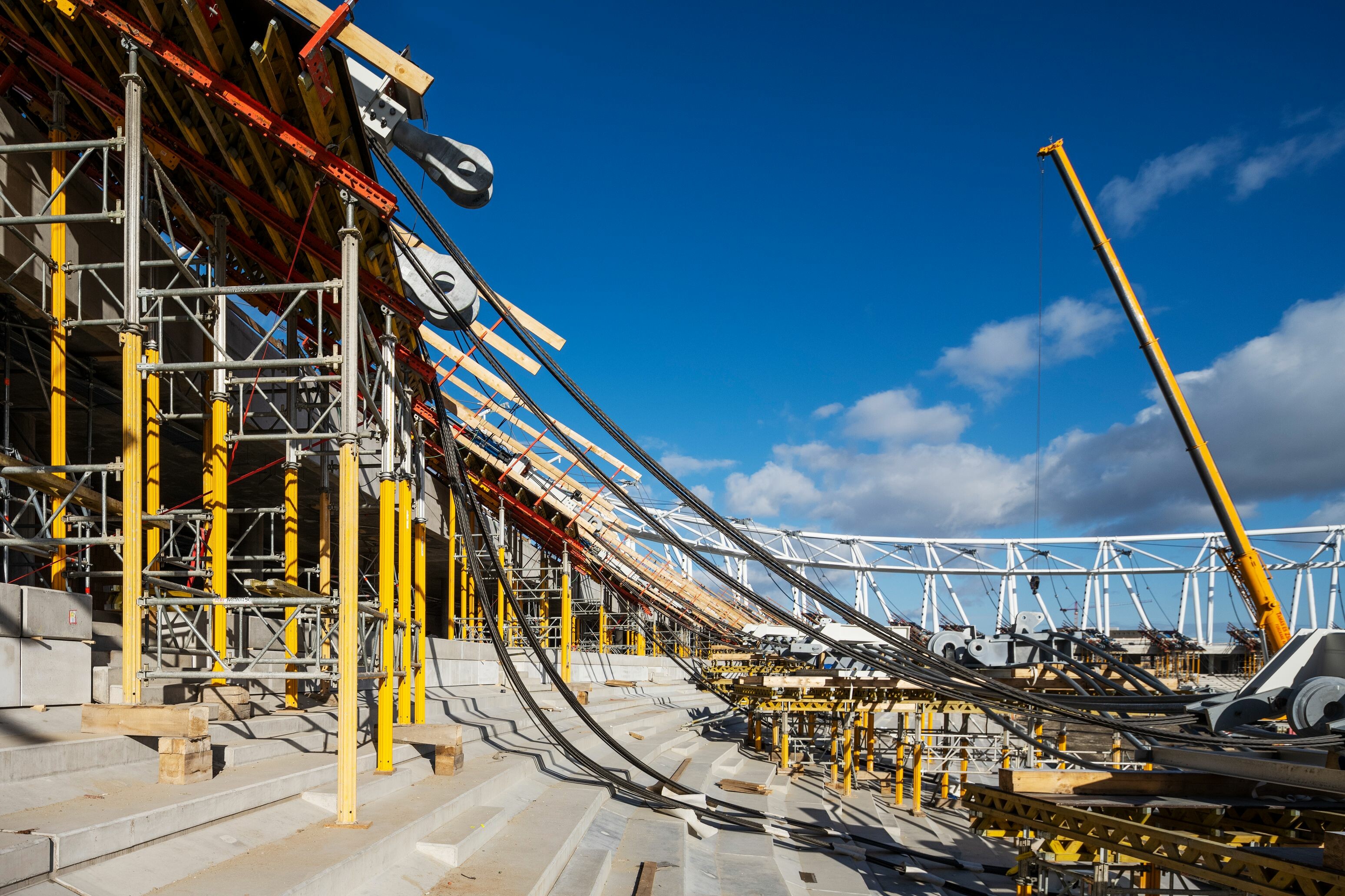 Külön kihívást jelentett, hogy egy szakaszon statikai okokból nem lehetett a lelátó elemeire közvetlenül átadni a tetőszerkezet emeléséből adódó terheket.