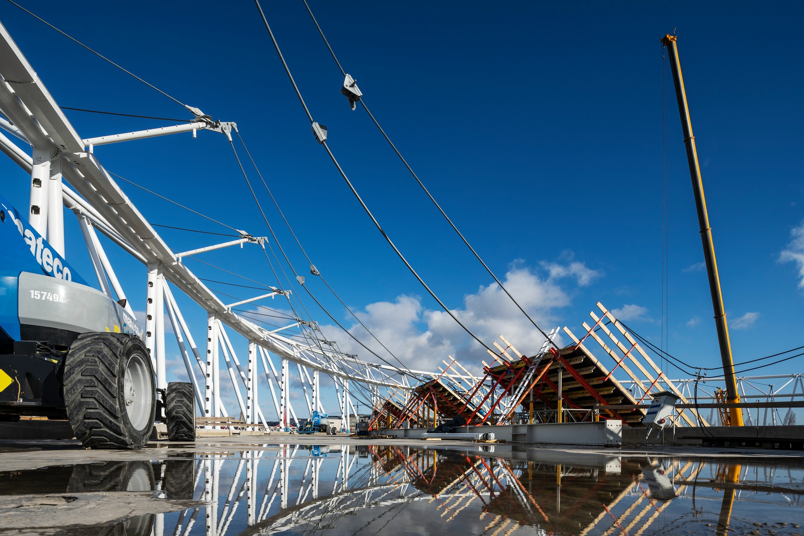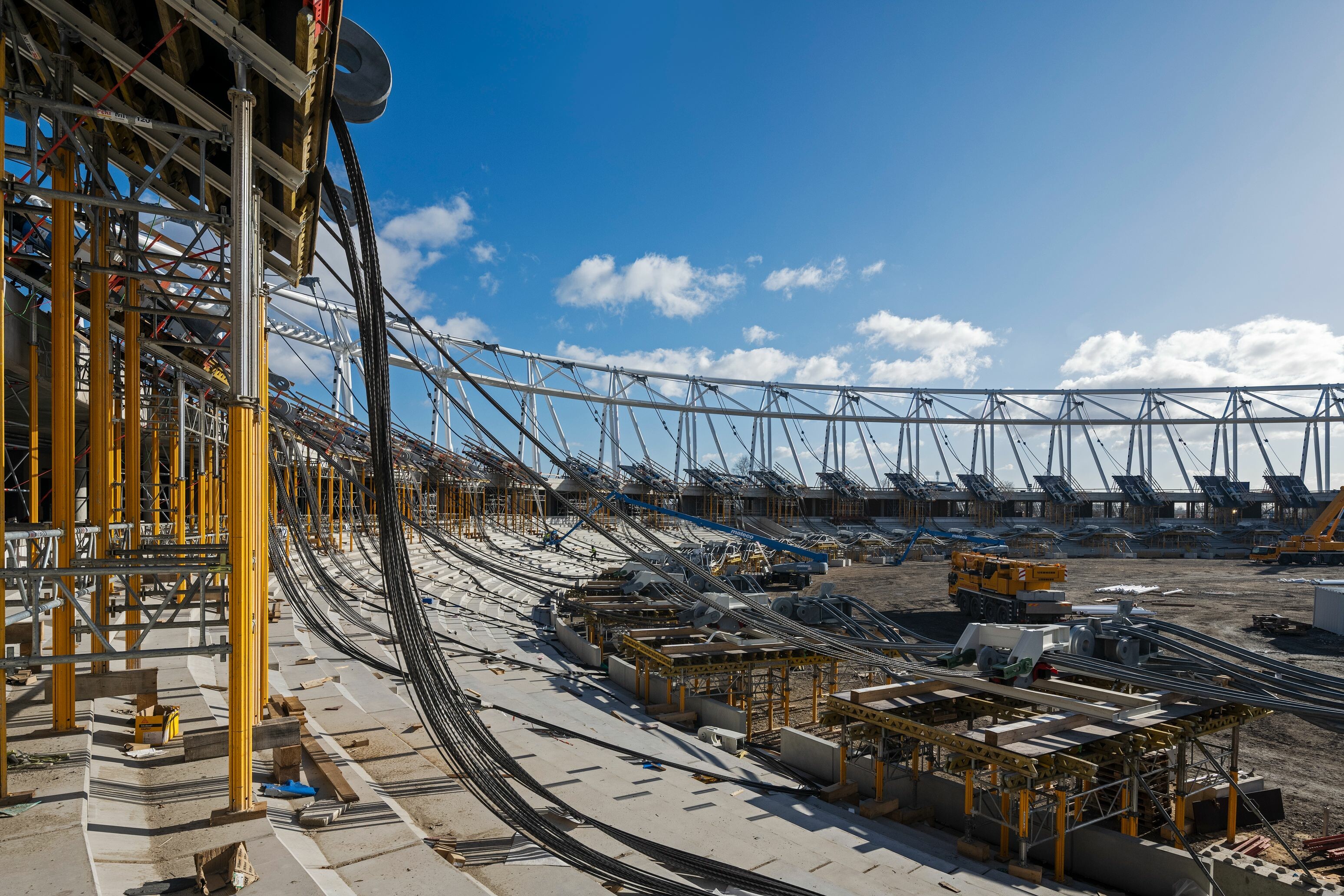 Az összesen 48 darab gyémánt alakú acélelem beemelése után a kábeltető szerkezetének szerelésével és emelésével folytatódtak a munkálatok. Összesen 96 darab állvány támasztotta alá ideiglenesen a kábeltető csomópontjait: 48 darab a húzott gyűrűk acélelemeit és 48 darab a T-gerendákat, melyhez a PERI MULTIPROP teherhordó állványzatát választották a kivitelezők.