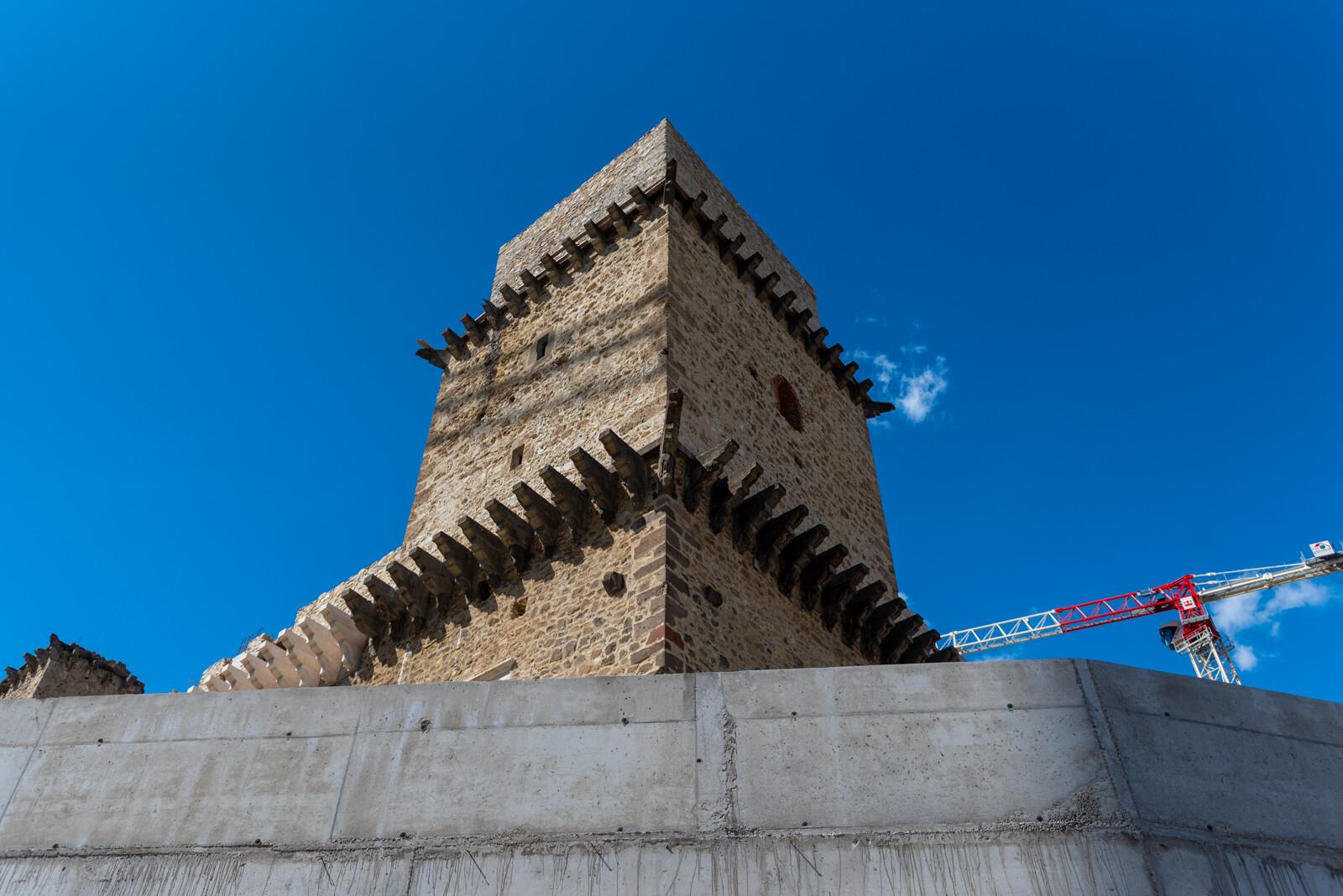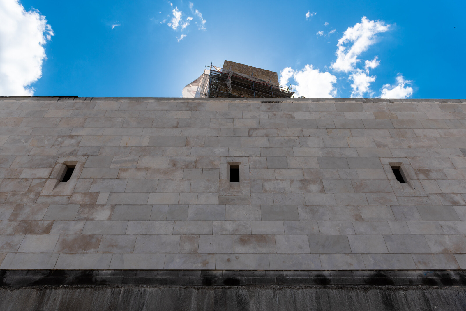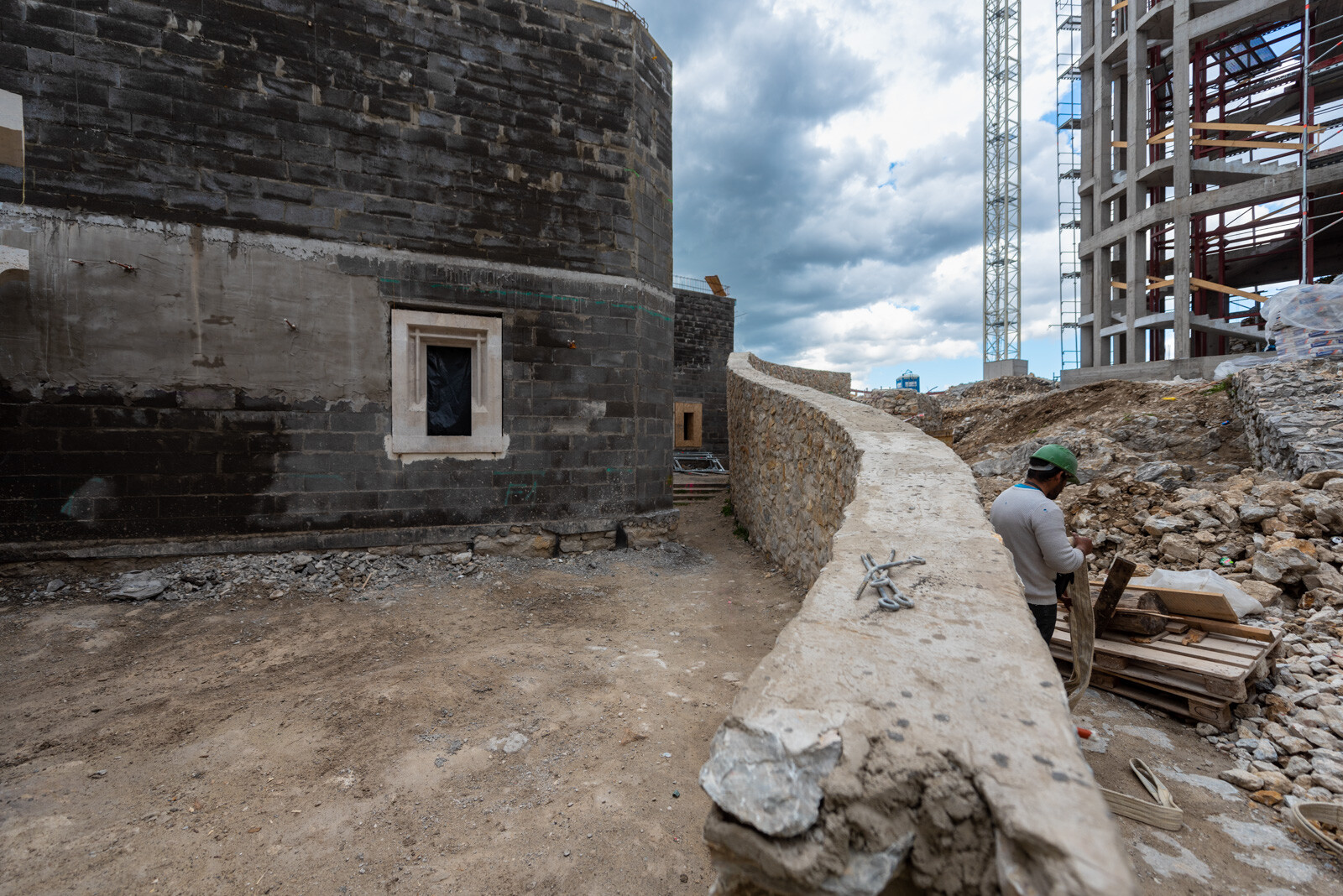 A hónapban megkezdődött a külső várfal ikertornyainak burkolása is. Csehes Réka rámutatott: mivel a bástyák sarkai ívesek, így ezen részeken külön speciálisan erre a célra elkészített kőtömbökből készül a falburkolat.