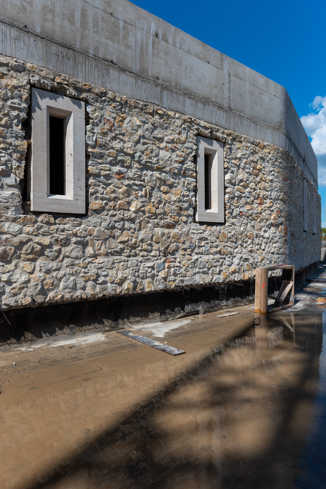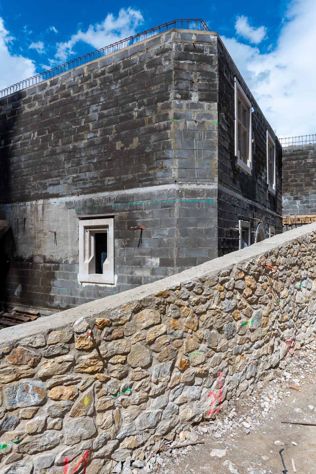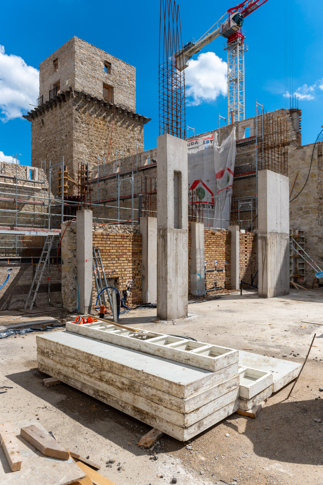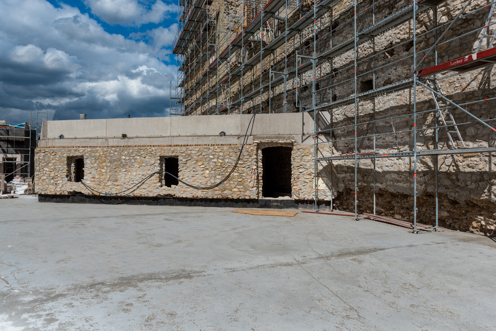 Mint kiderült, a kazamataszinten oszlopsort helyeztek el a nyugati toronypár és a konyhaépület előtt. A teraszszint délkeleti oldalán áprilisban beépítették a kő ablakkereteket,