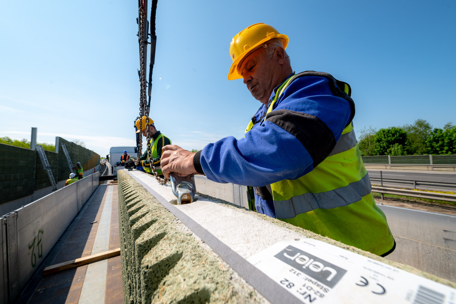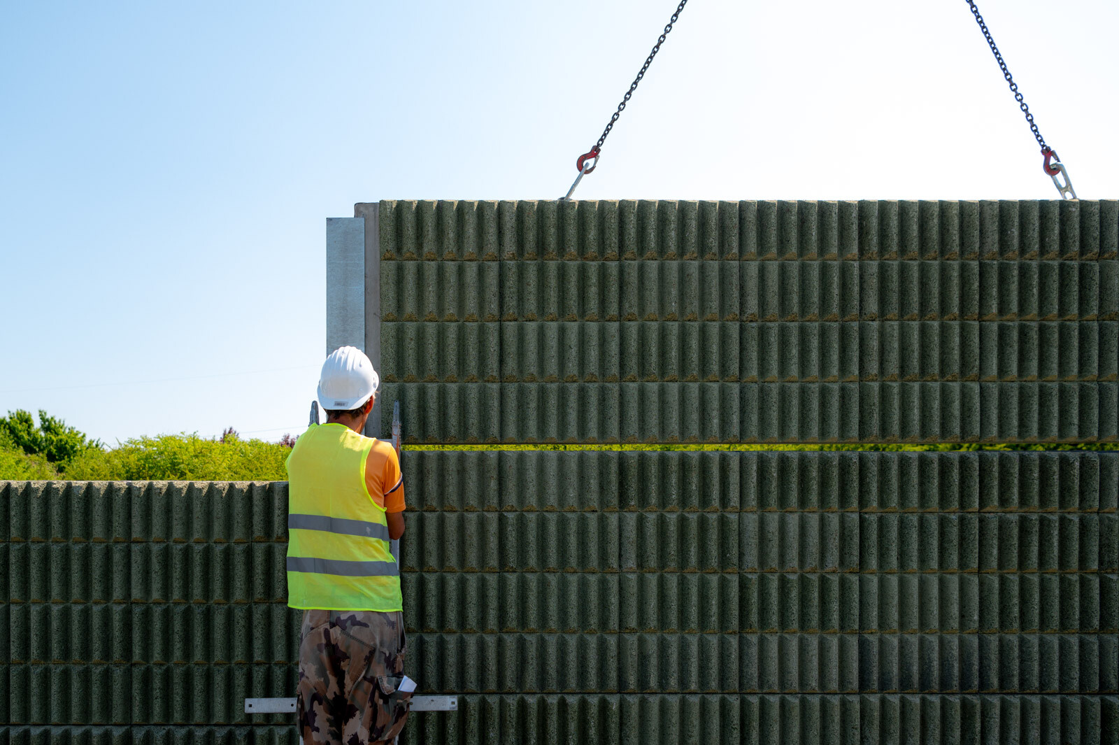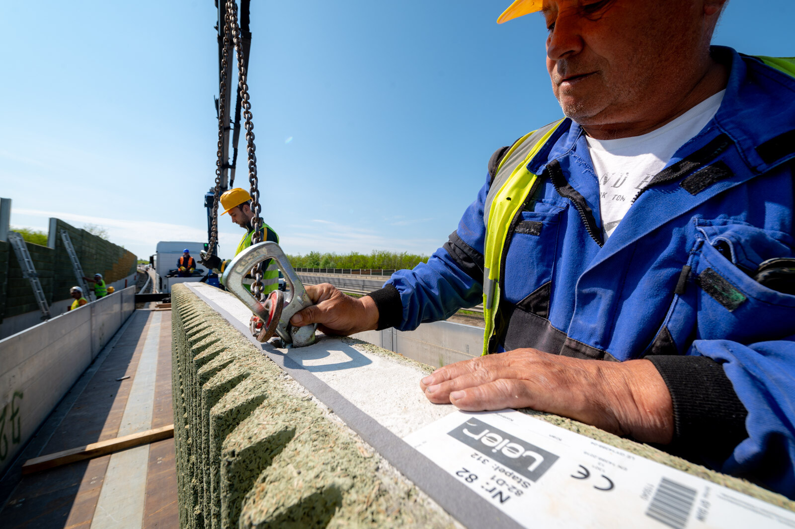 A Leier nemcsak gyártja és szállítja a falrendszer lábazati vasbeton elemeit és a zajárnyékoló paneleket, hanem az oszlopok közé történő beemelésben is közreműködik a panel szállítást végző cégek segítségével.