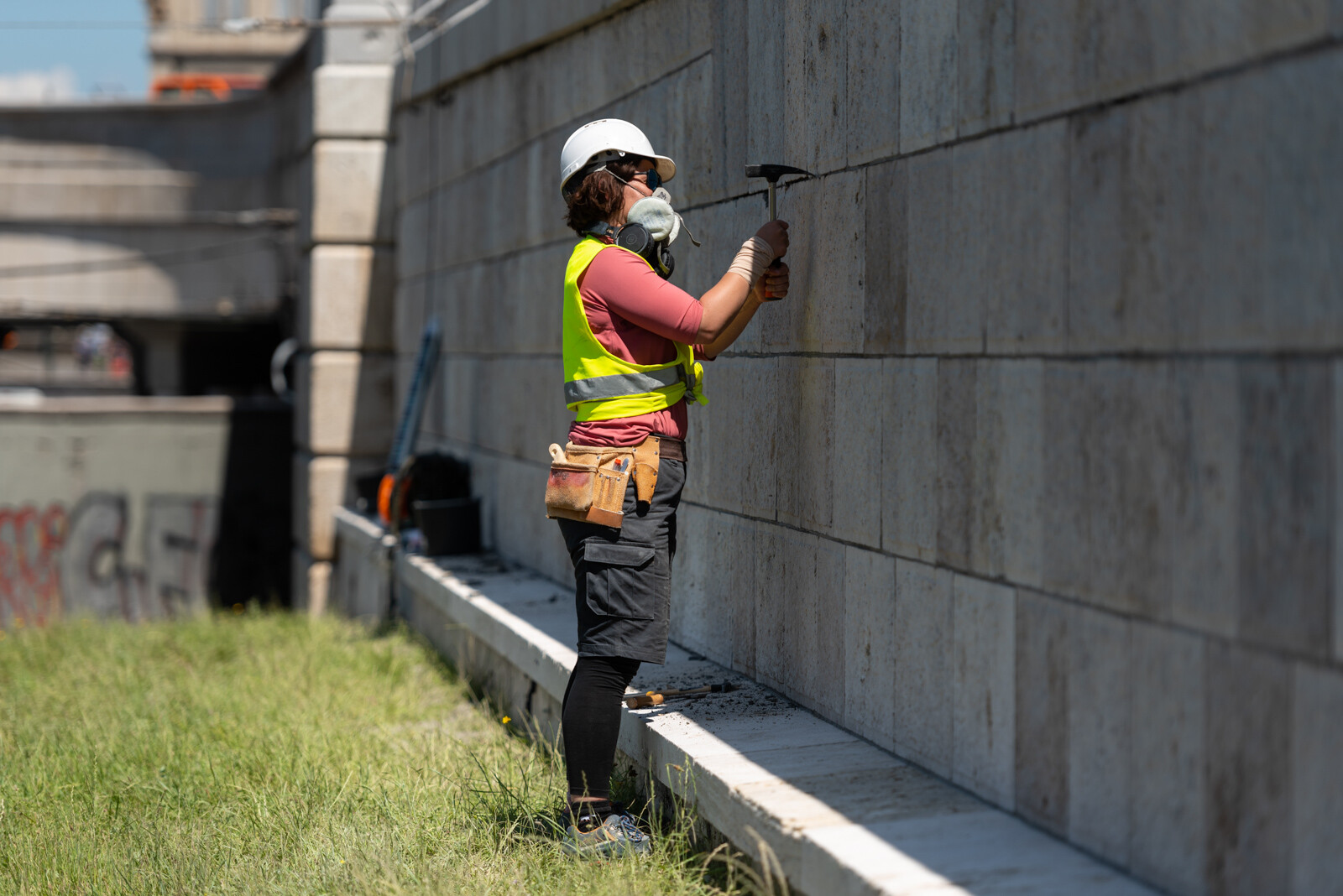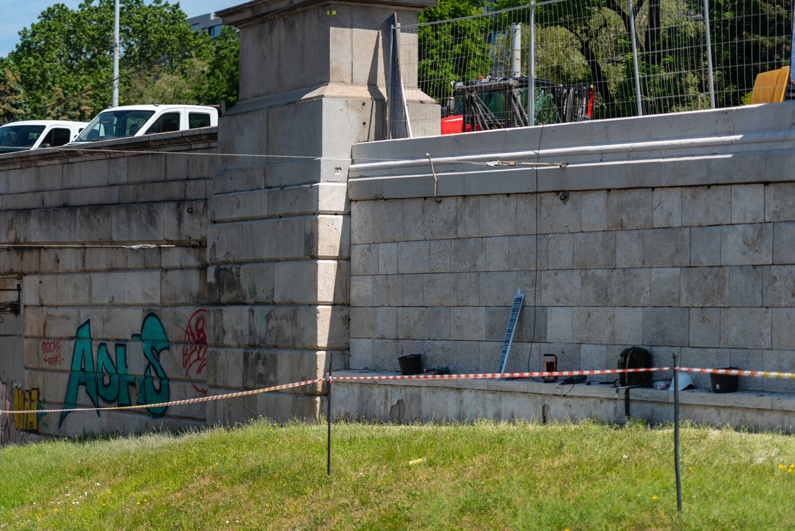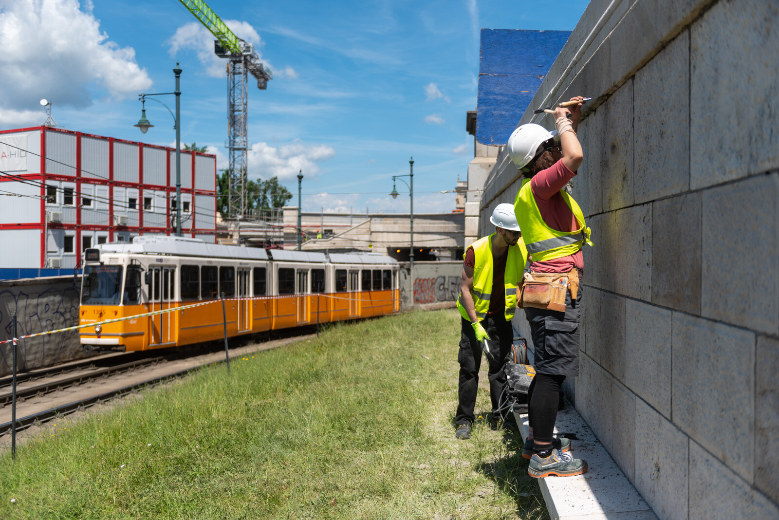 A héten megkezdték az A-Híd szakemberei a villamos melletti kőfelületek tisztítását és javítását.
