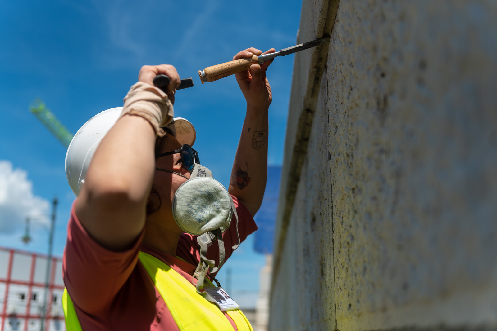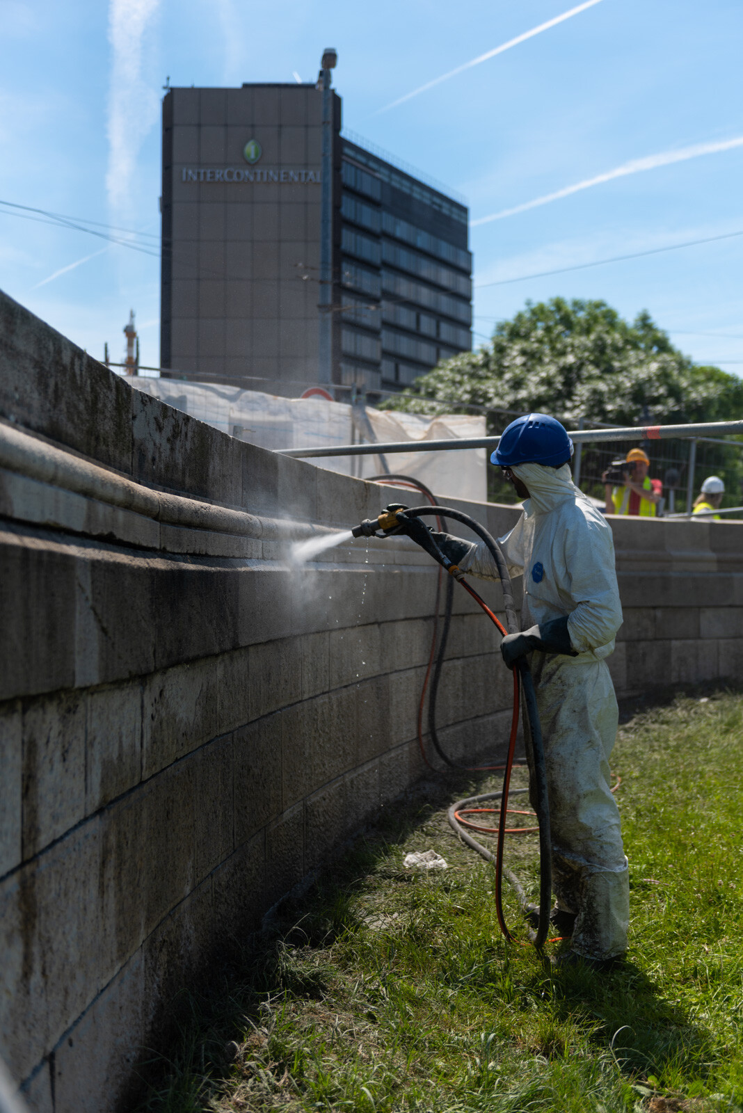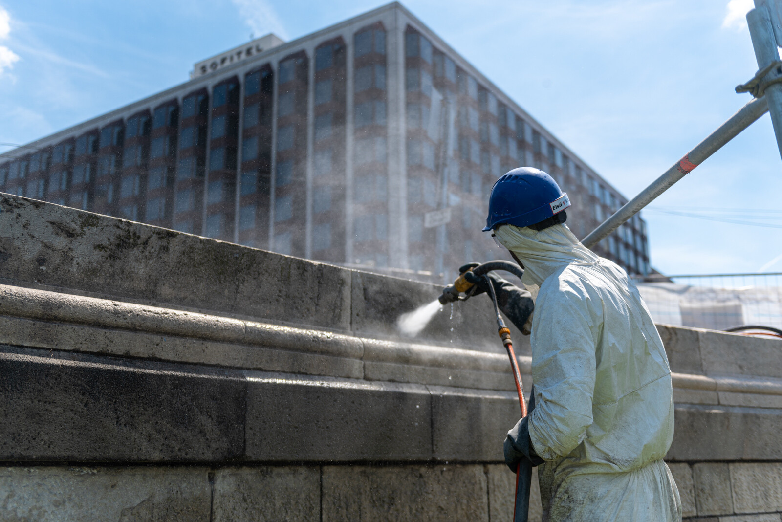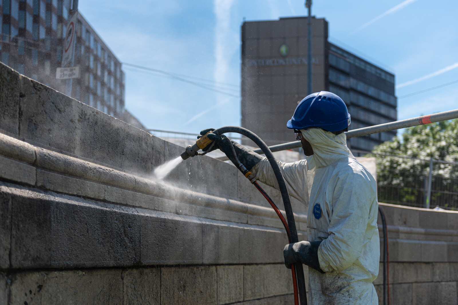A héten megkezdték az A-Híd szakemberei a villamos melletti kőfelületek tisztítását és javítását.