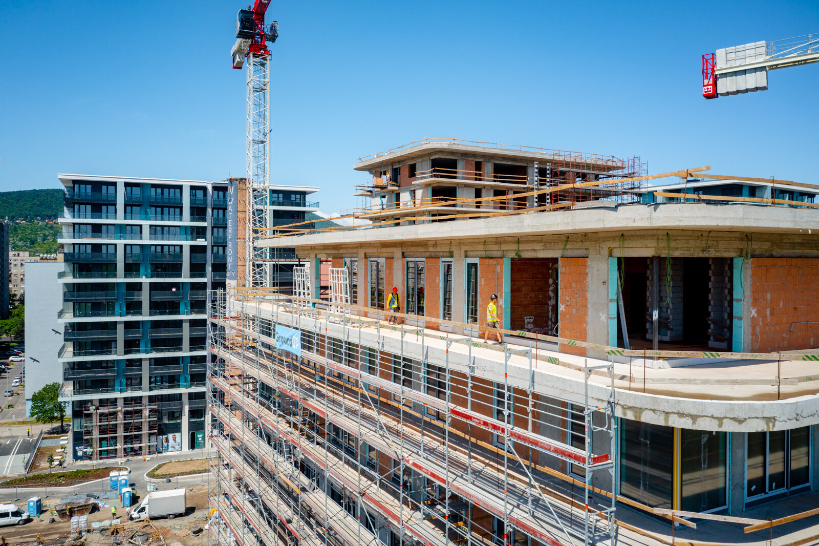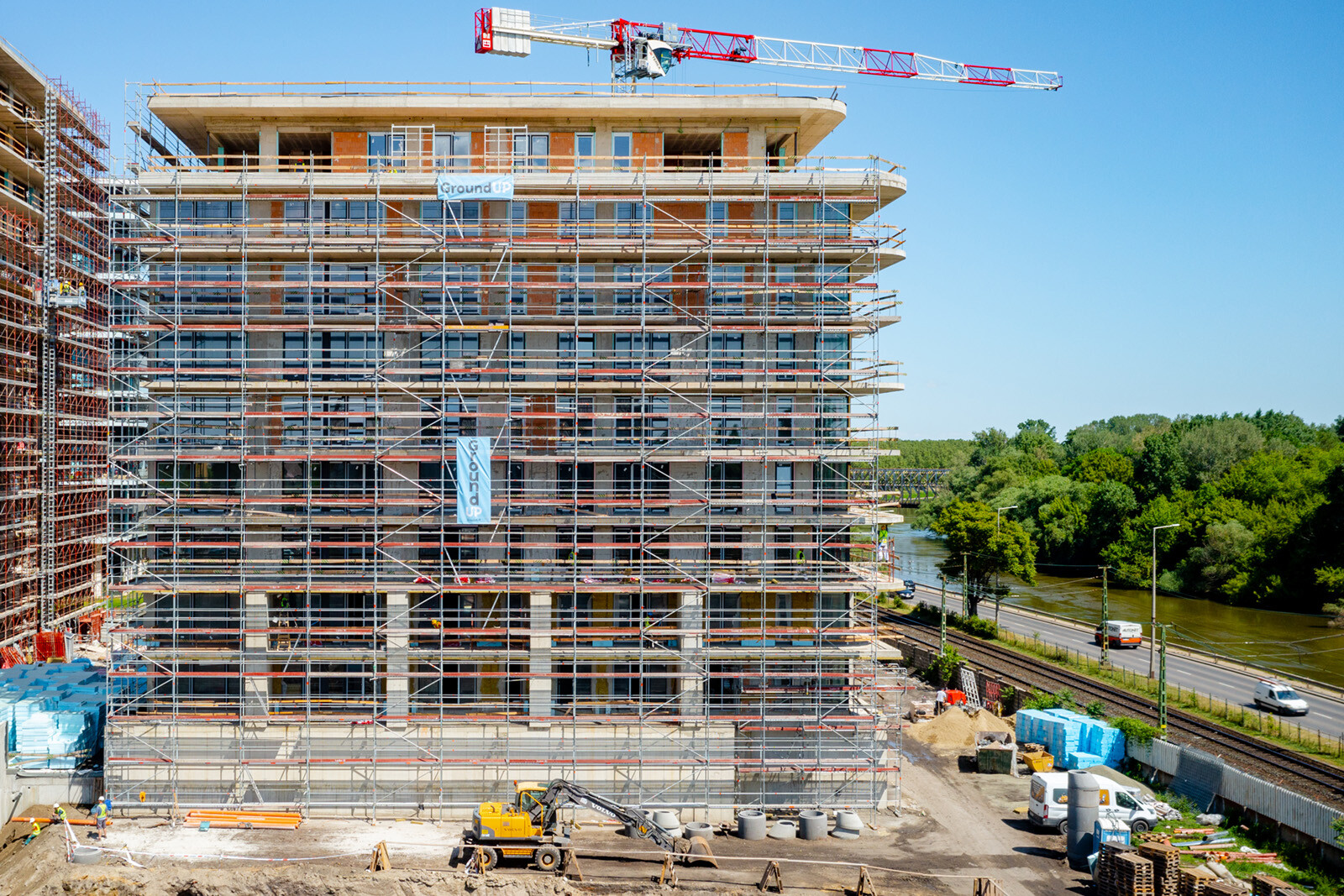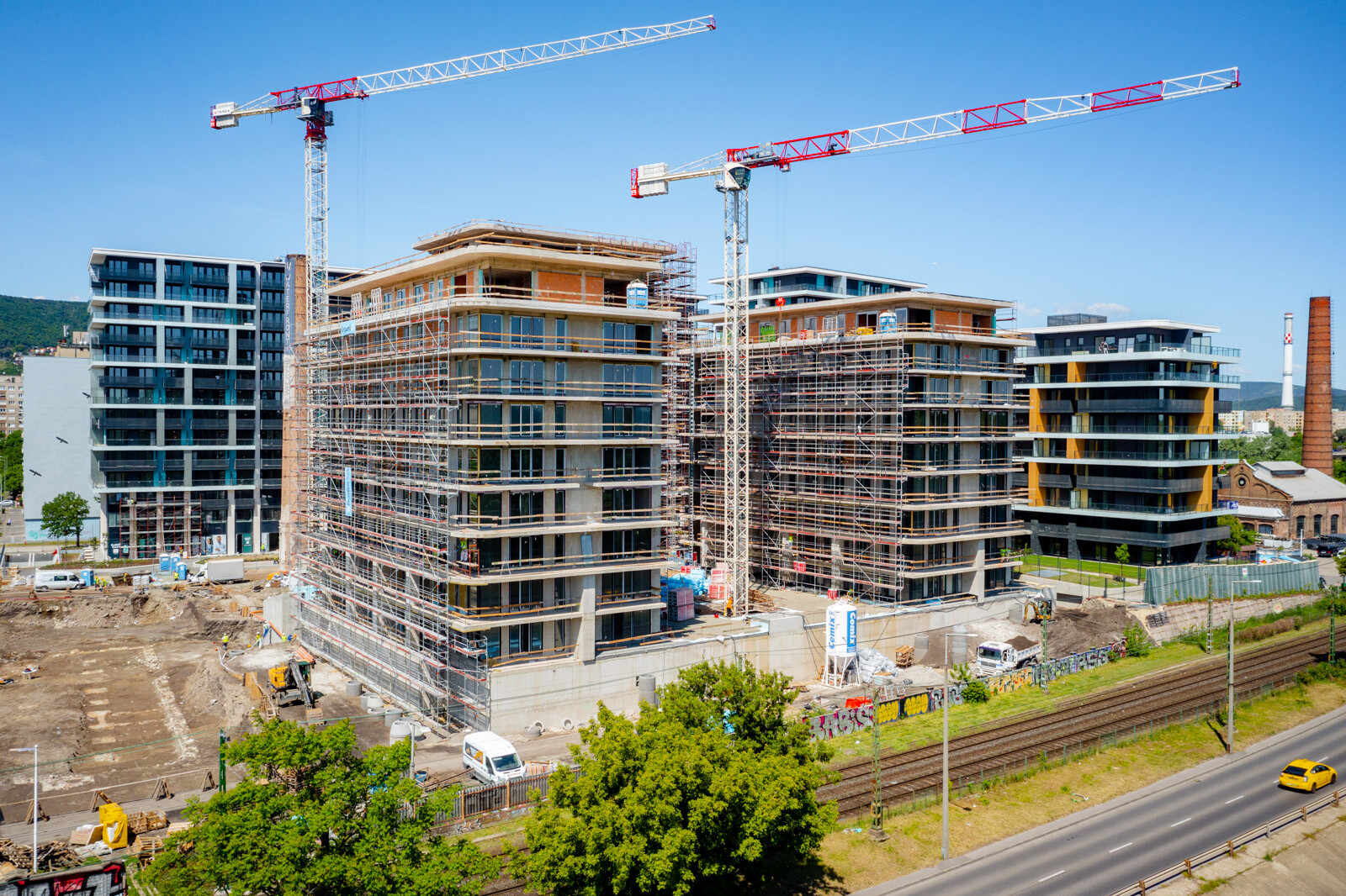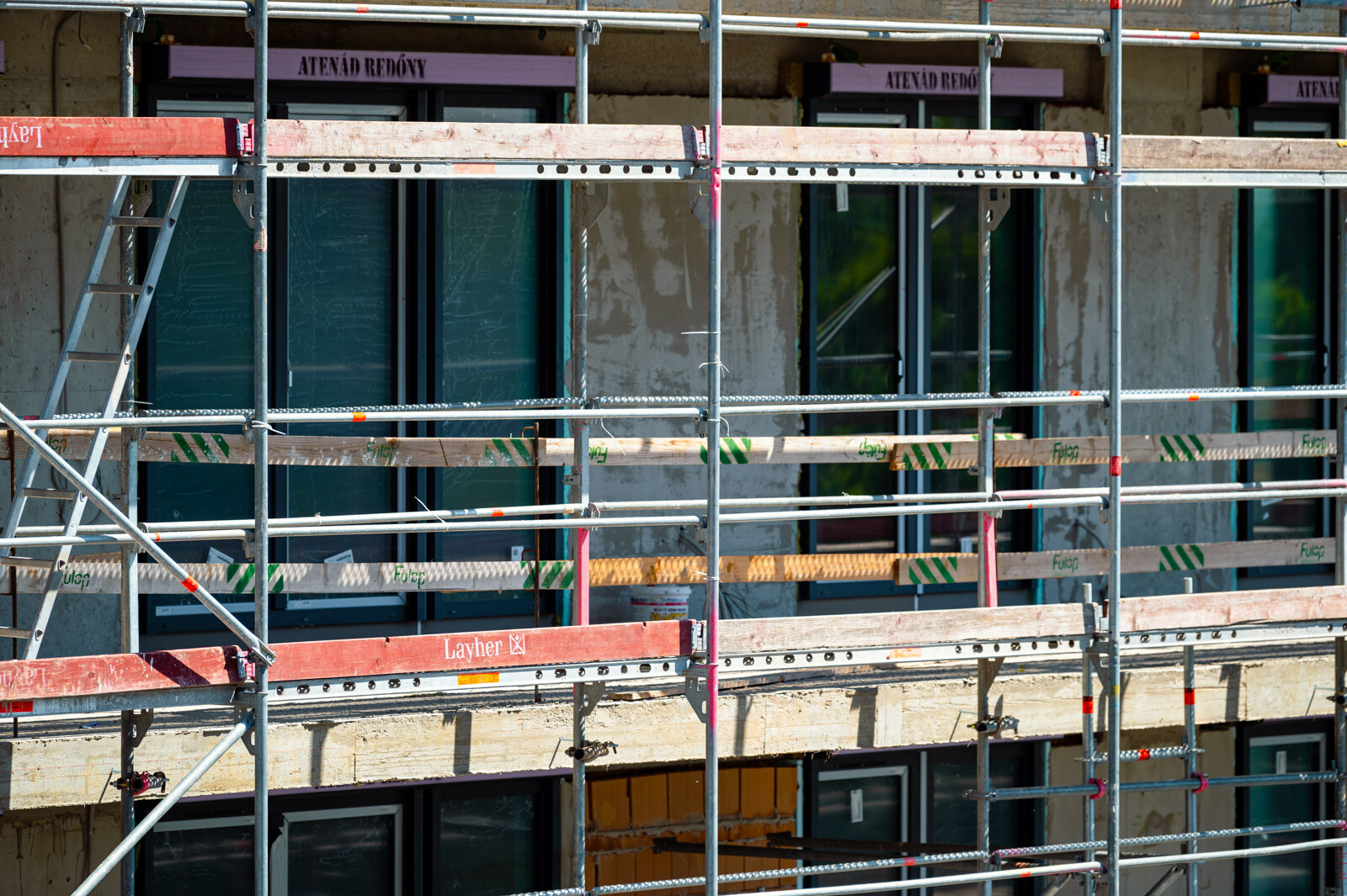 A III. kerületi lakópark építése során a homlokzati munkák támogatására - szigetelés, festés, valamint az erkélyek kiépítéséhez - alkalmazták a Layher állványzatot.
