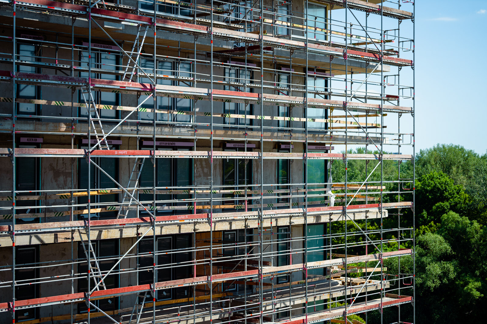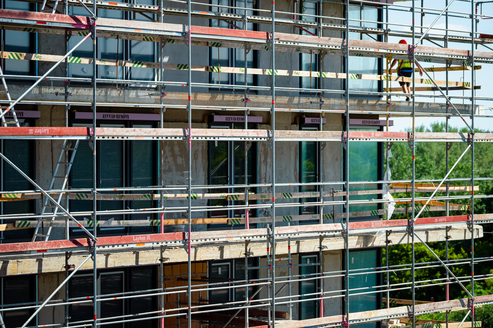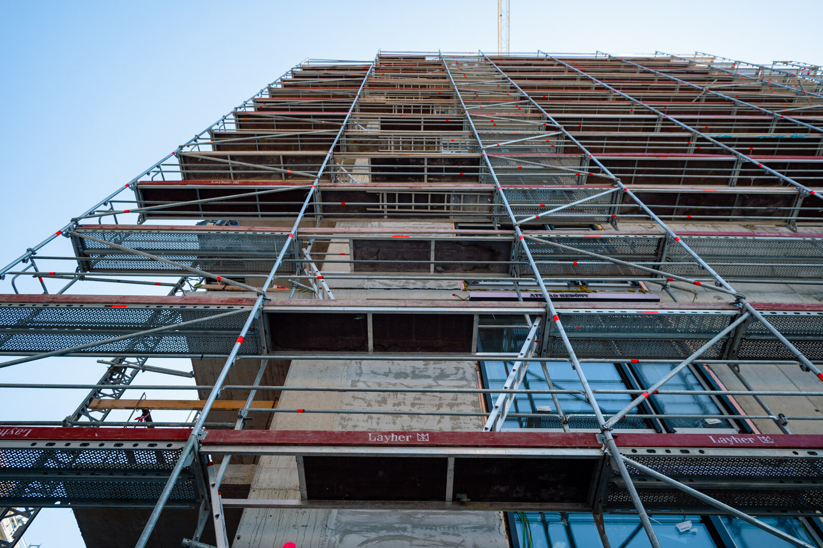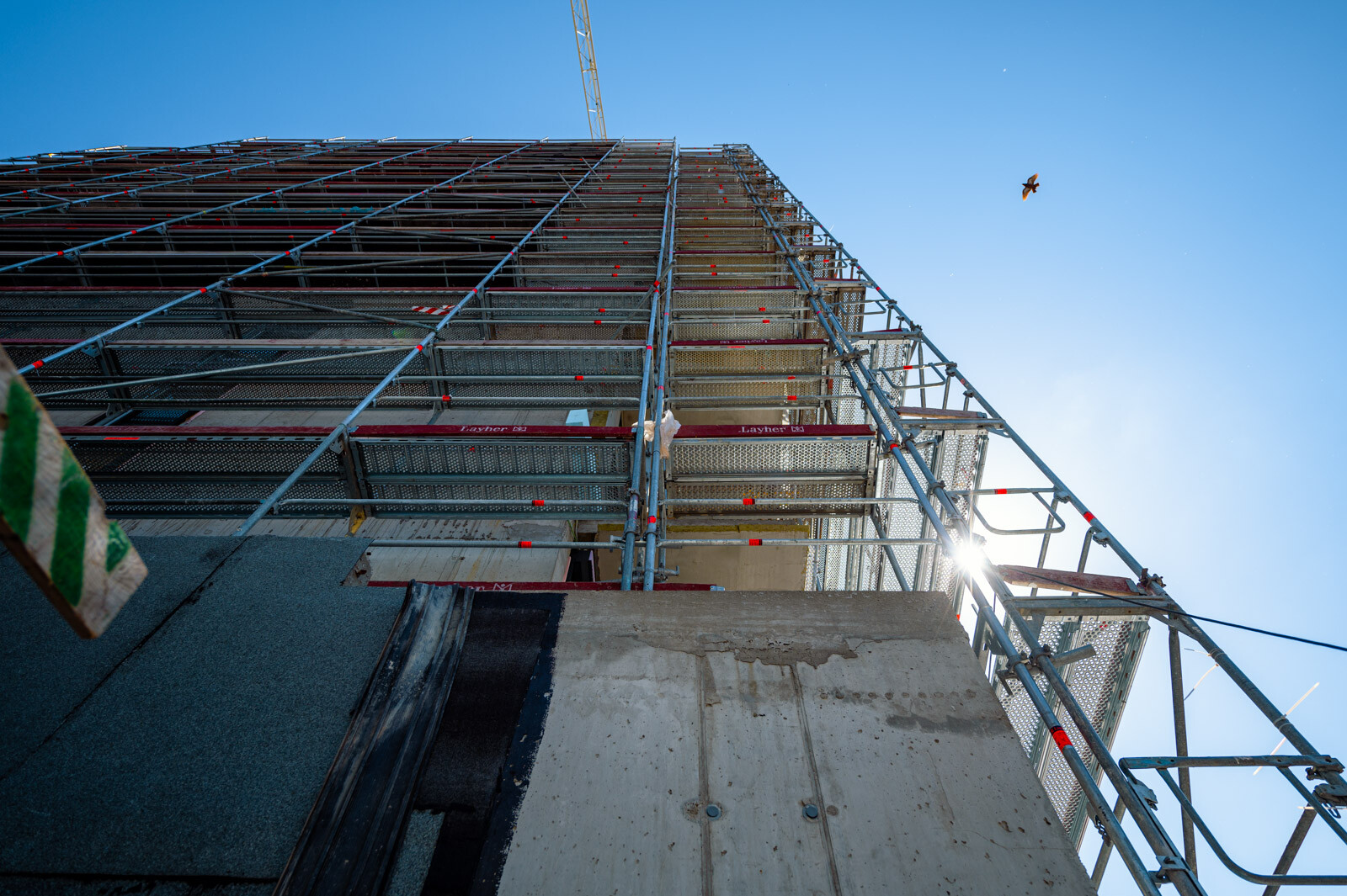 A III. kerületi lakópark építése során a homlokzati munkák támogatására - szigetelés, festés, valamint az erkélyek kiépítéséhez - alkalmazták a Layher állványzatot.