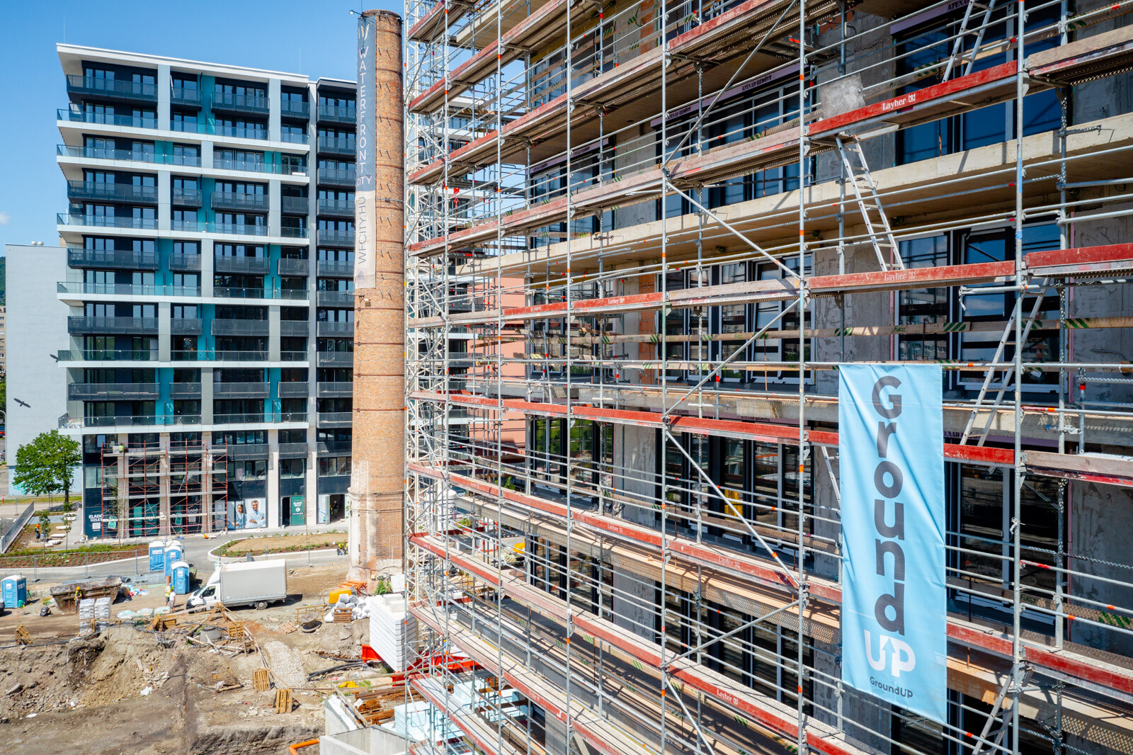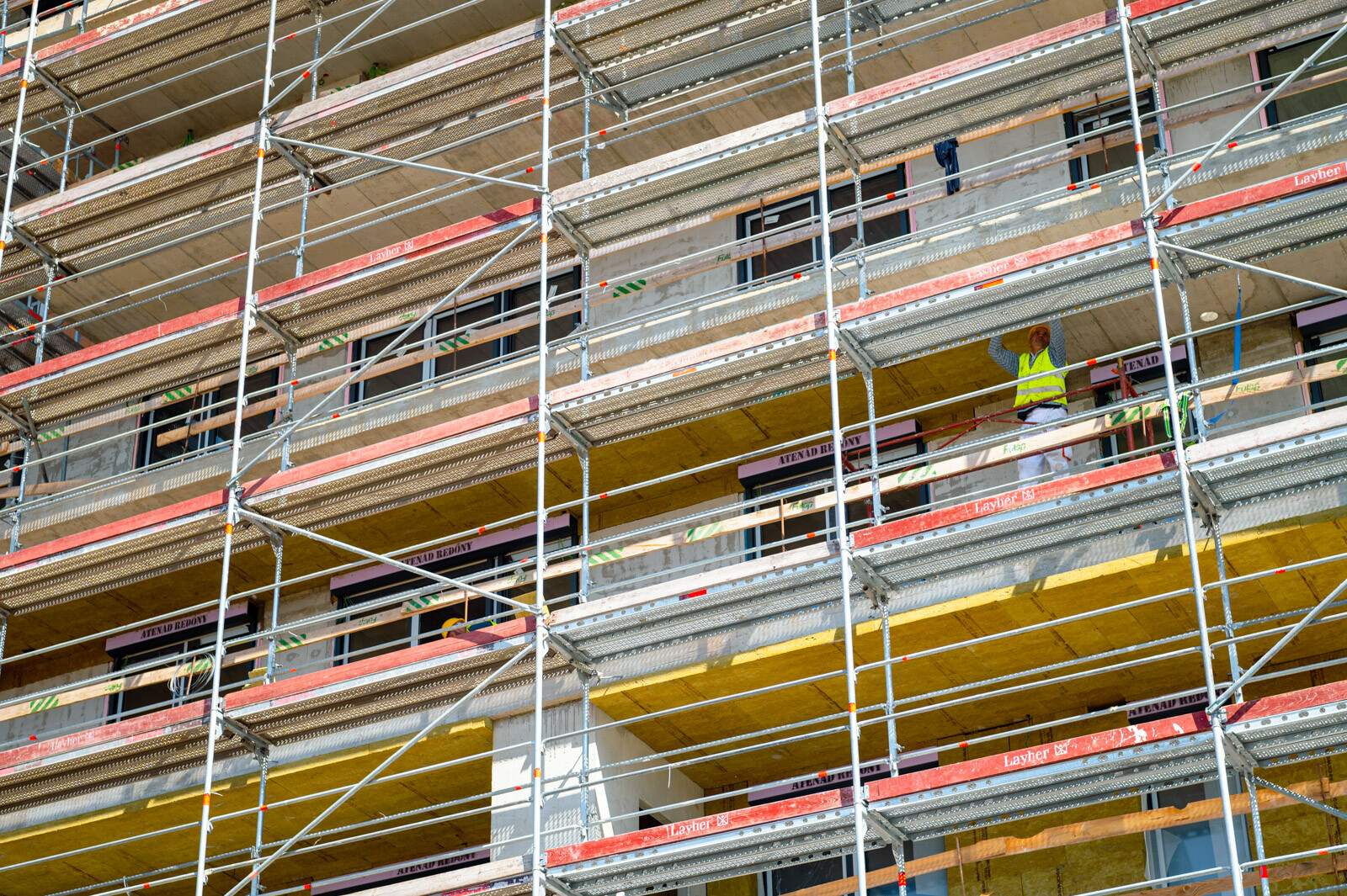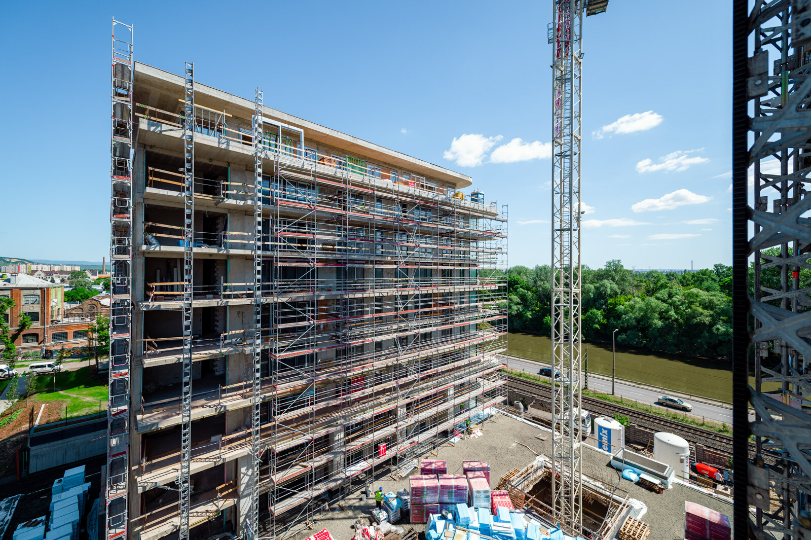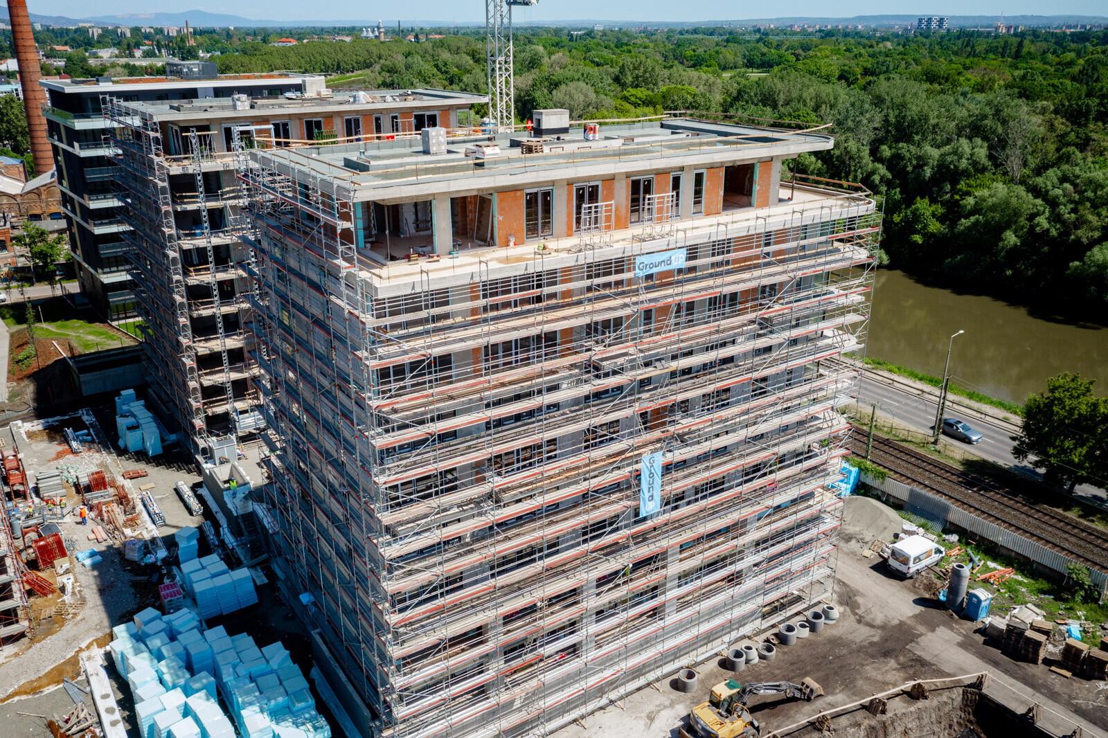 A III. kerületi lakópark építése során a homlokzati munkák támogatására - szigetelés, festés, valamint az erkélyek kiépítéséhez - alkalmazták a Layher állványzatot.