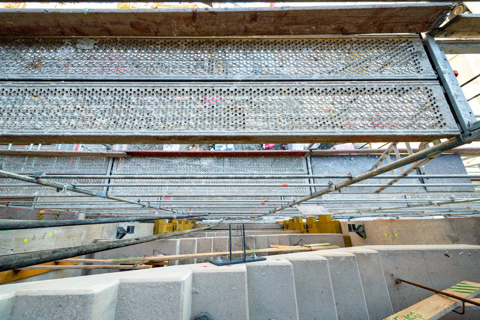 A feljárást és az állványon történő biztonságos közlekedést létrás feljárók biztosítják, a stabilitást pedig az acél járólapok segítik. Az állványzatot a megszokott módon háromsoros oldalvédelemmel látták el, ezzel is növelve a biztonságot.