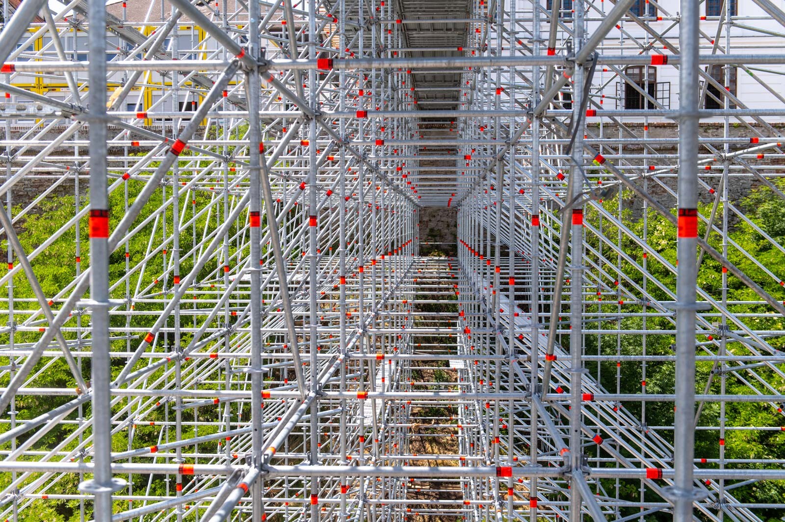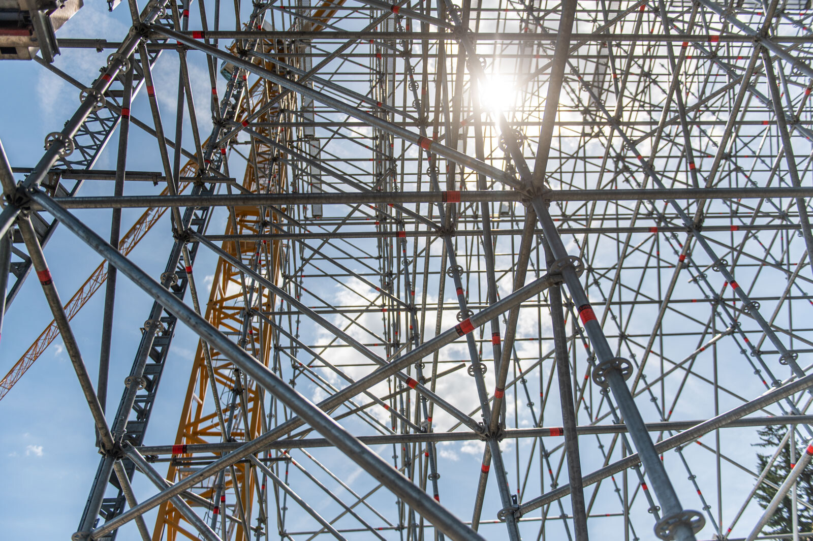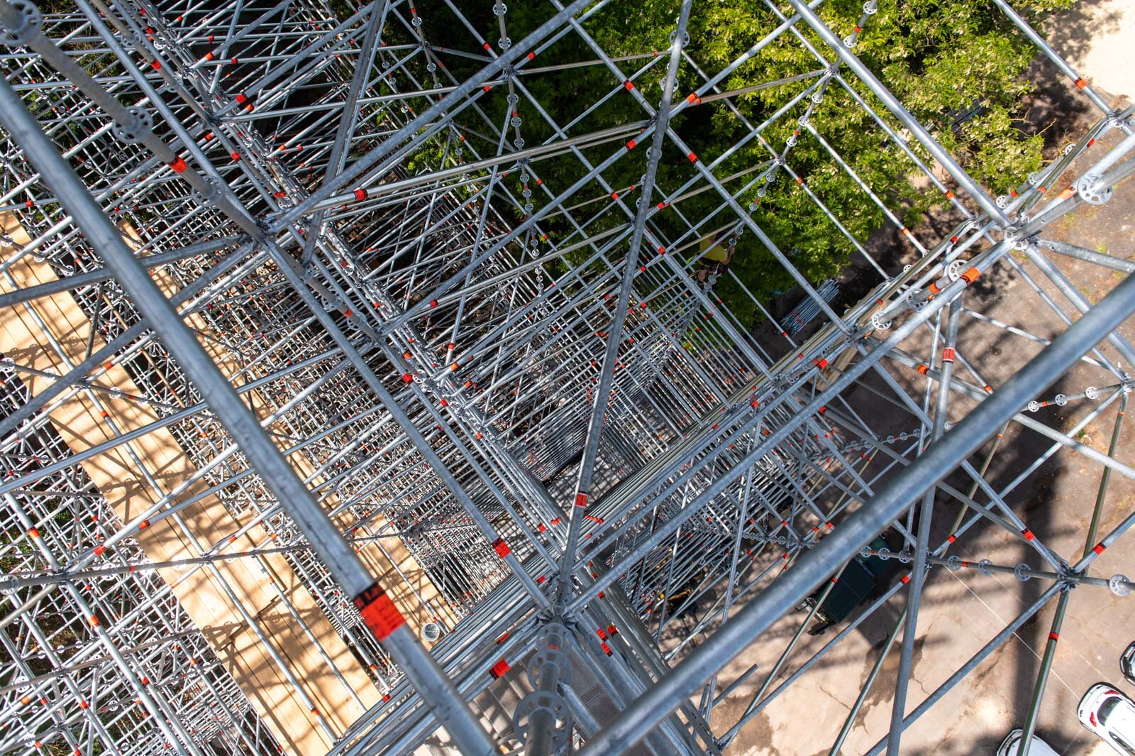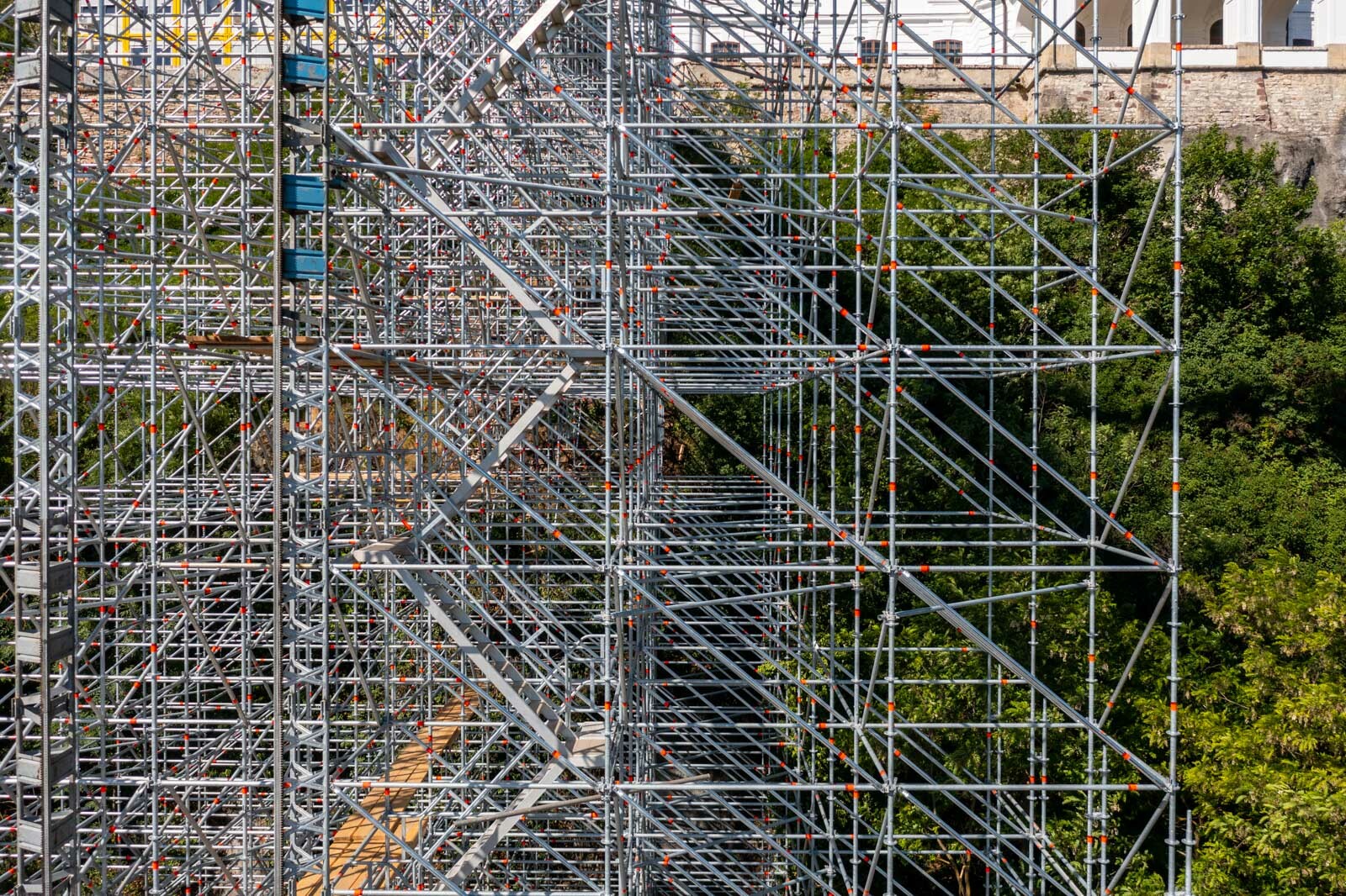 Mindezt a Layher Allround moduláris állványrendszer alkalmazásával elkészült, hozzávetőlegesen 80 tonna súlyú térállvány biztosítja, amelyhez két Geda Z/ZP 1500-as felvonót rögzítettek a teher és személyi forgalom lebonyolítására. A két Geda felvonó egyenként 1500 kilogramm teherbírásúak. A felvonók az építési anyagok felhordására és a személyek feljutásának támogatására szolgálnak, és egyenként 15-15 fő szállítására alkalmasak.