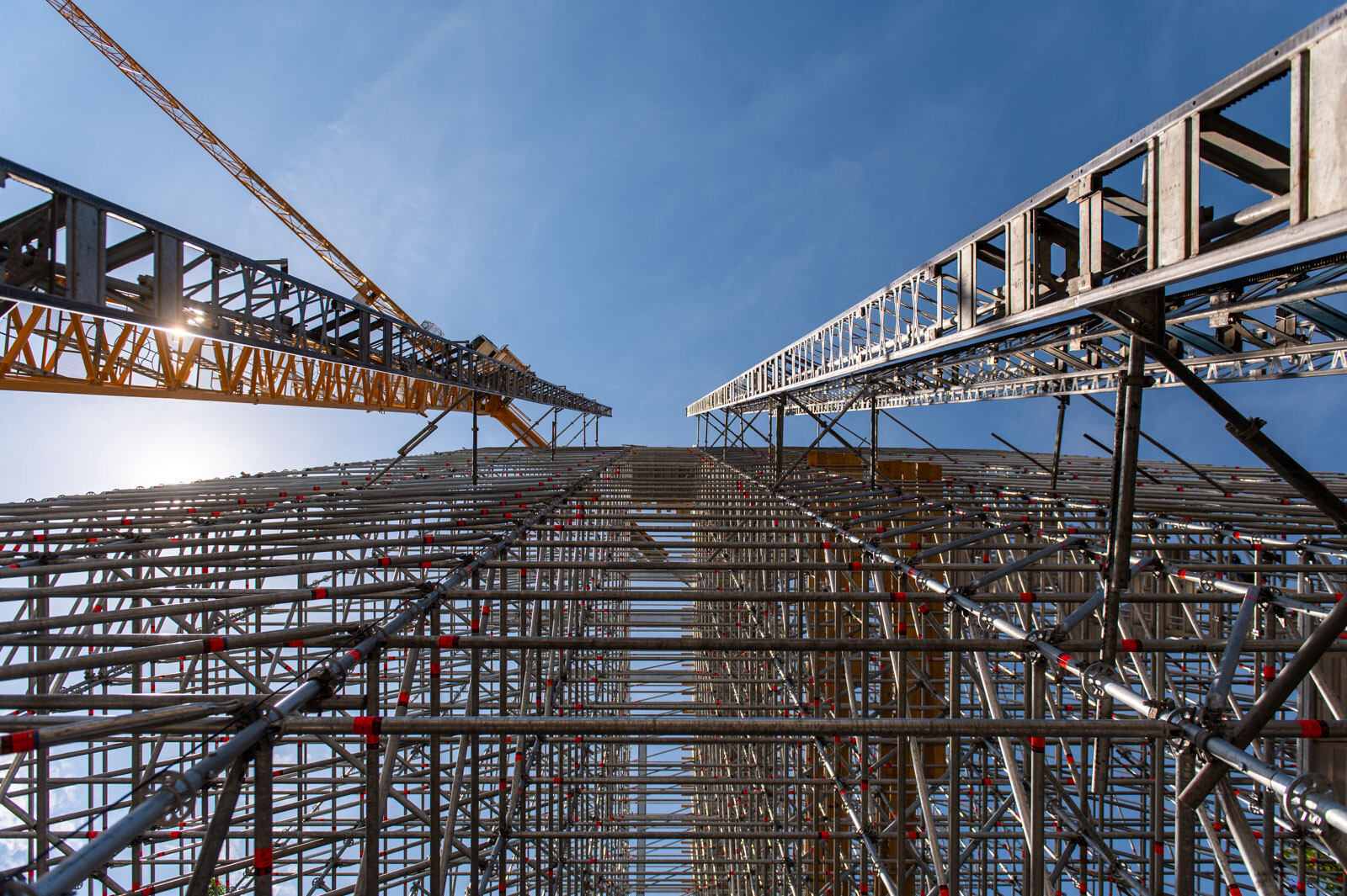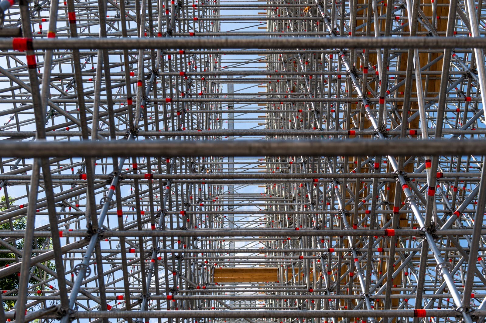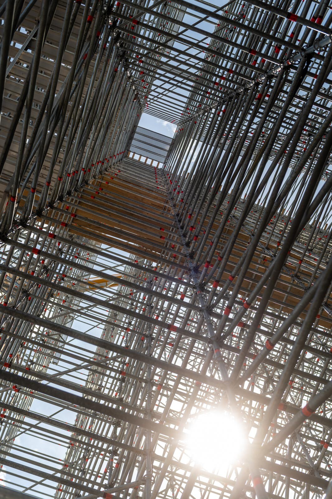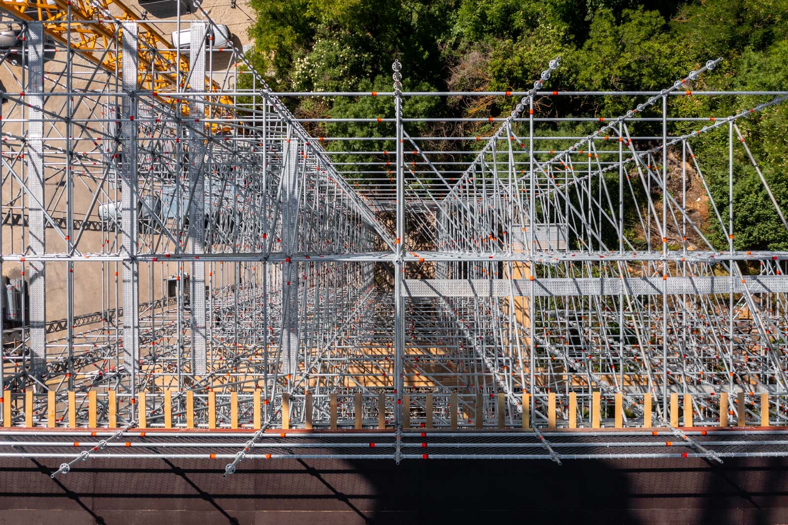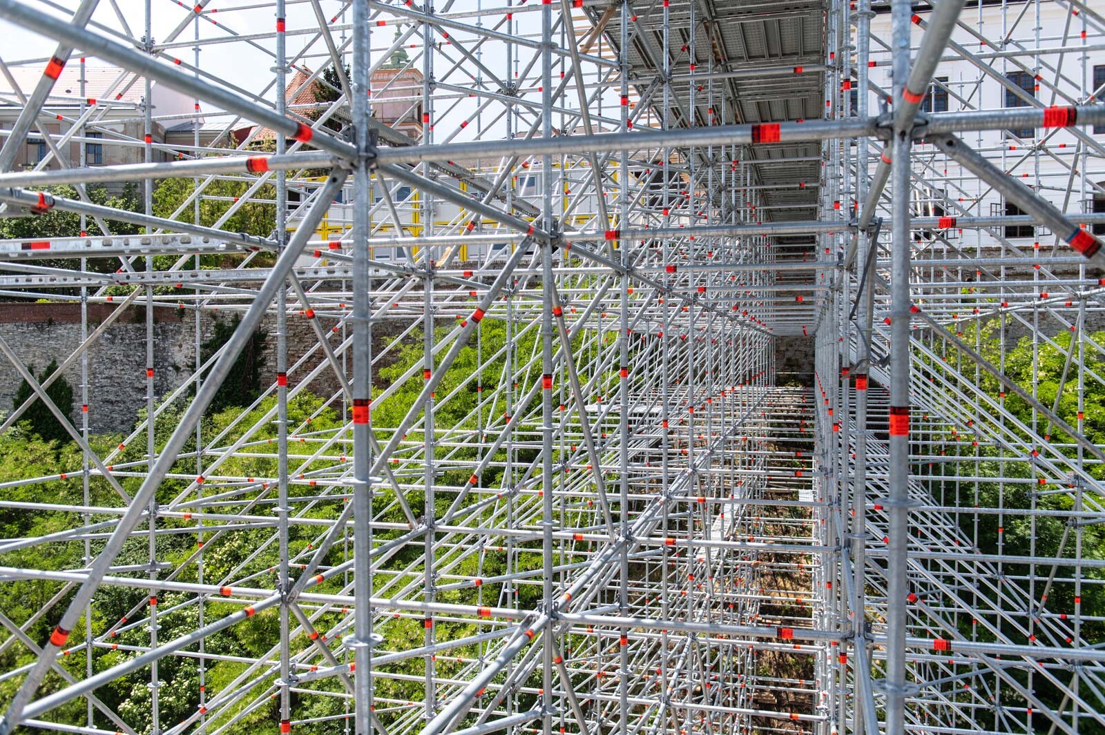 Mindezt a Layher Allround moduláris állványrendszer alkalmazásával elkészült, hozzávetőlegesen 80 tonna súlyú térállvány biztosítja, amelyhez két Geda Z/ZP 1500-as felvonót rögzítettek a teher és személyi forgalom lebonyolítására. A két Geda felvonó egyenként 1500 kilogramm teherbírásúak. A felvonók az építési anyagok felhordására és a személyek feljutásának támogatására szolgálnak, és egyenként 15-15 fő szállítására alkalmasak.