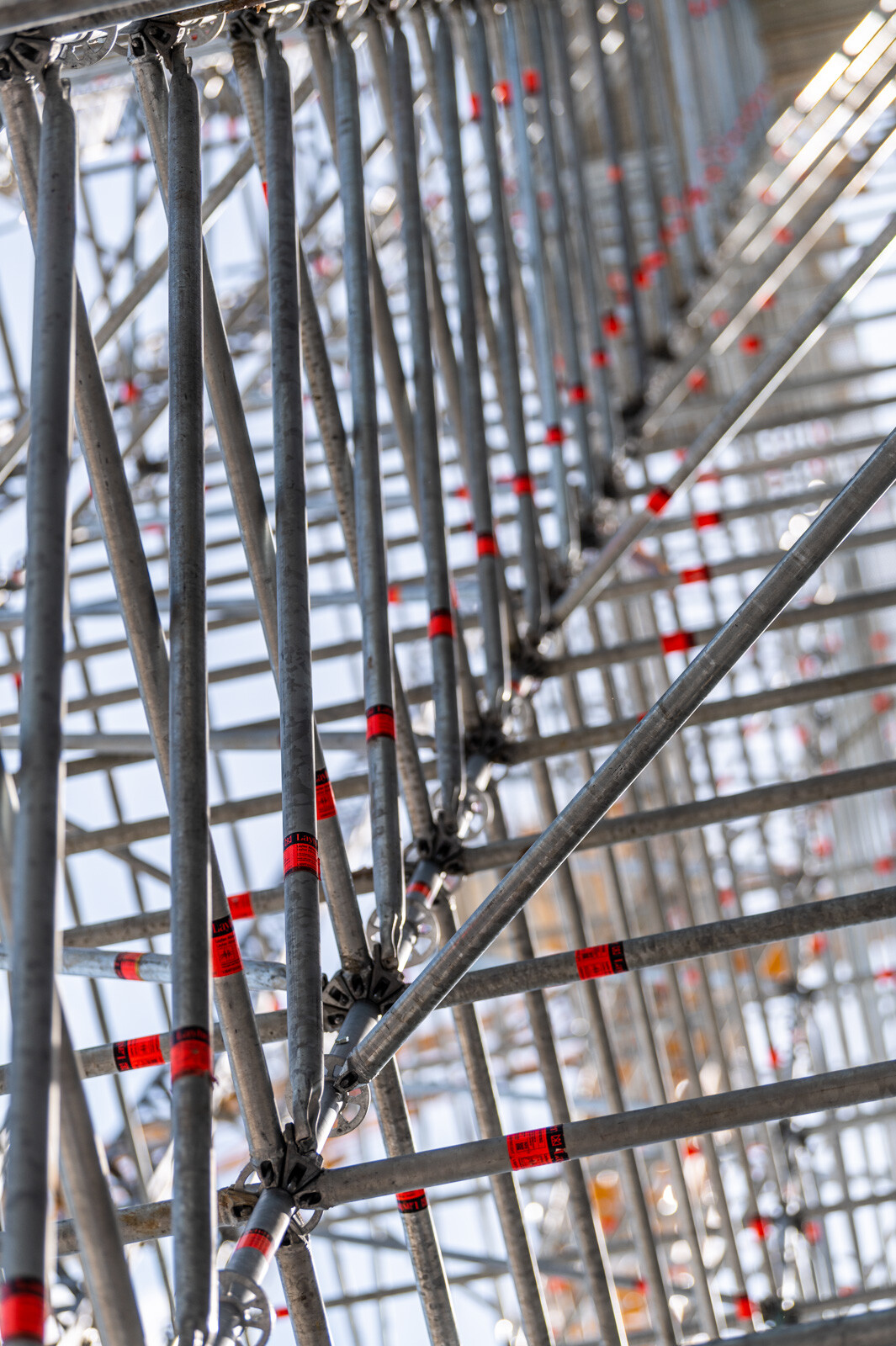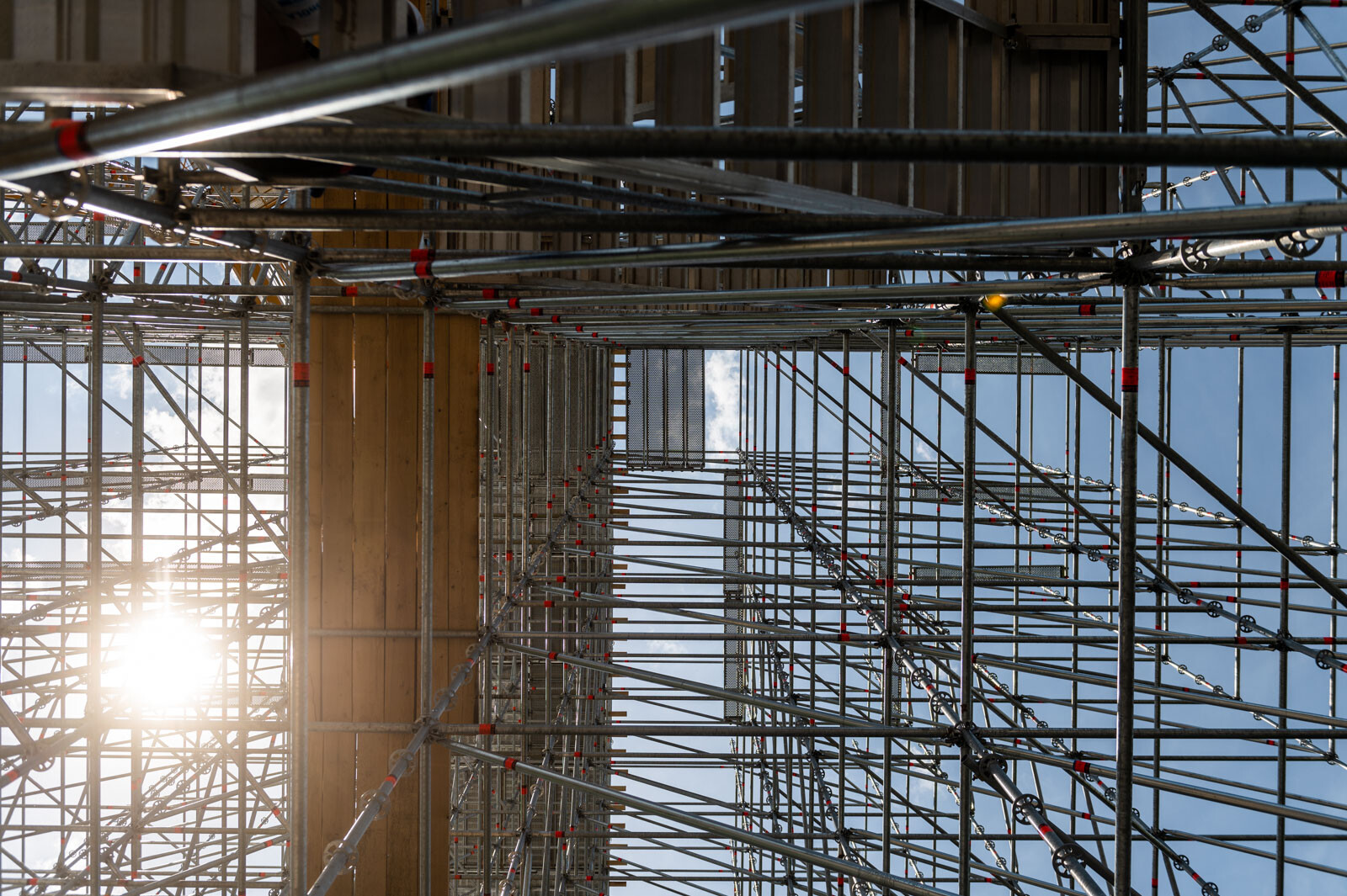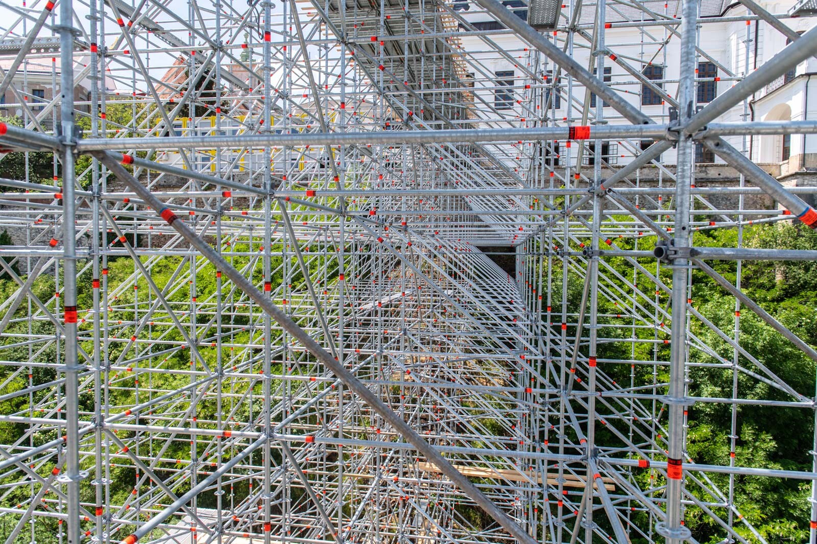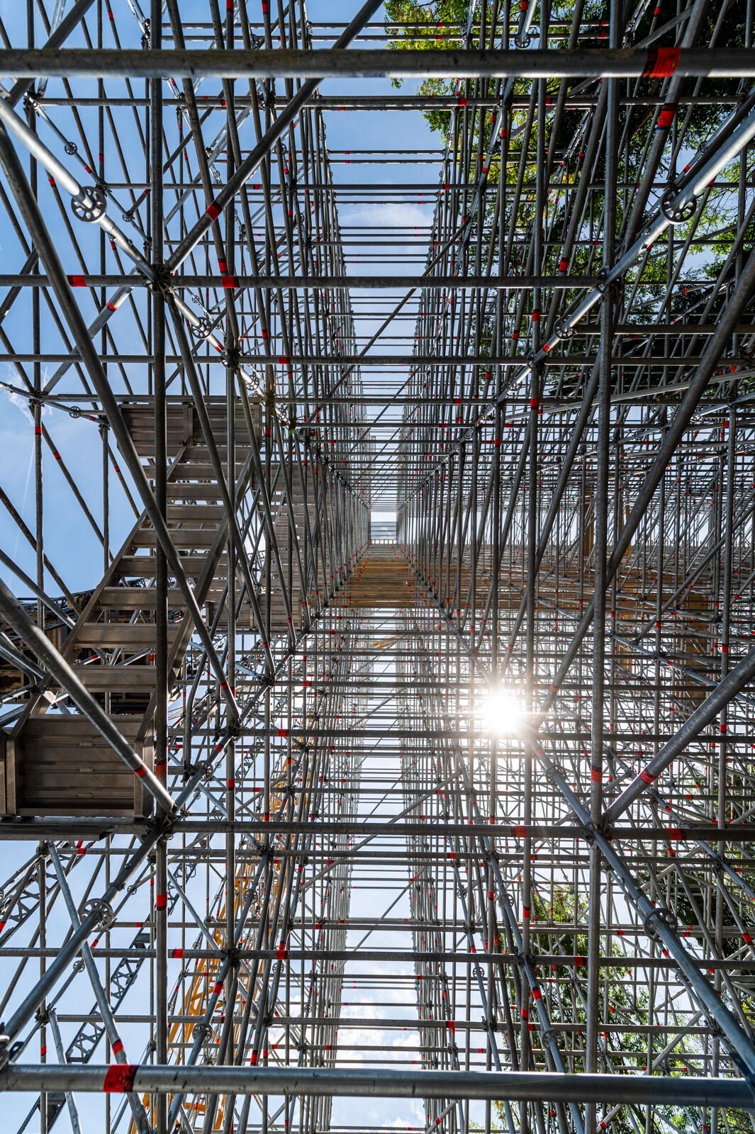 Mindezt a Layher Allround moduláris állványrendszer alkalmazásával elkészült, hozzávetőlegesen 80 tonna súlyú térállvány biztosítja, amelyhez két Geda Z/ZP 1500-as felvonót rögzítettek a teher és személyi forgalom lebonyolítására. A két Geda felvonó egyenként 1500 kilogramm teherbírásúak. A felvonók az építési anyagok felhordására és a személyek feljutásának támogatására szolgálnak, és egyenként 15-15 fő szállítására alkalmasak.