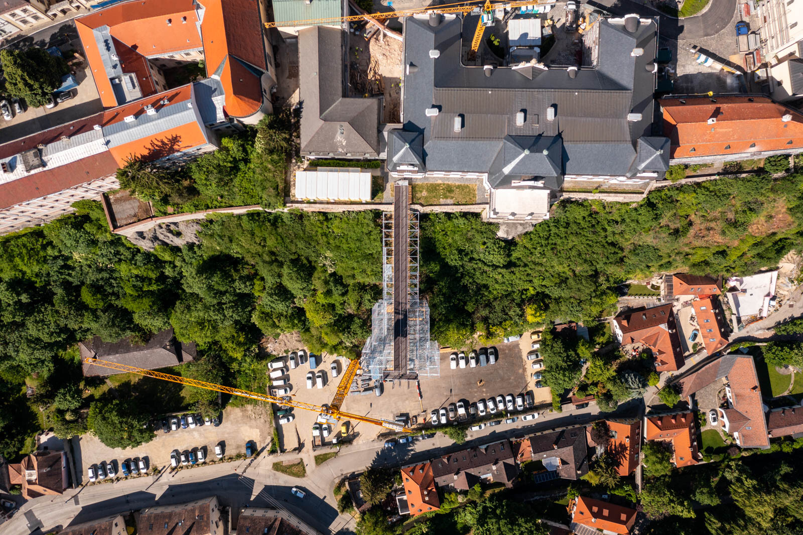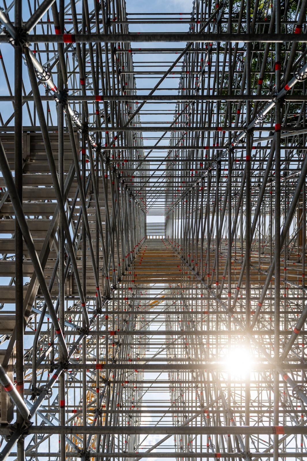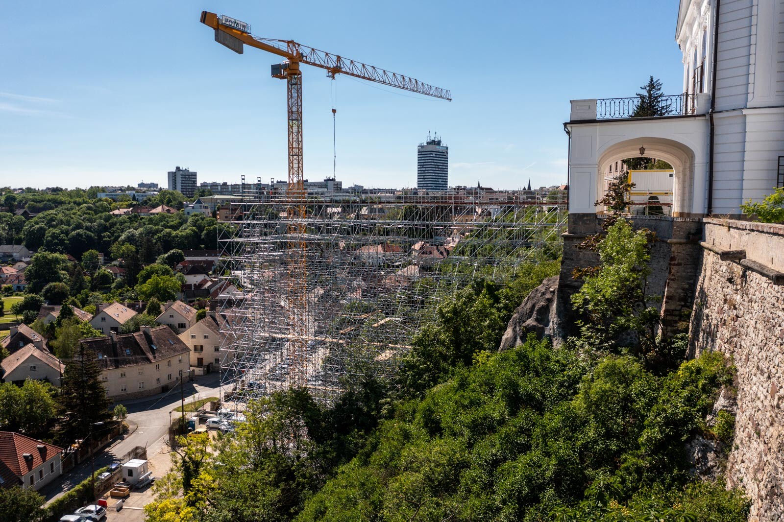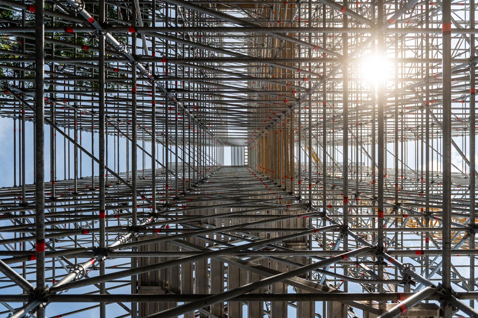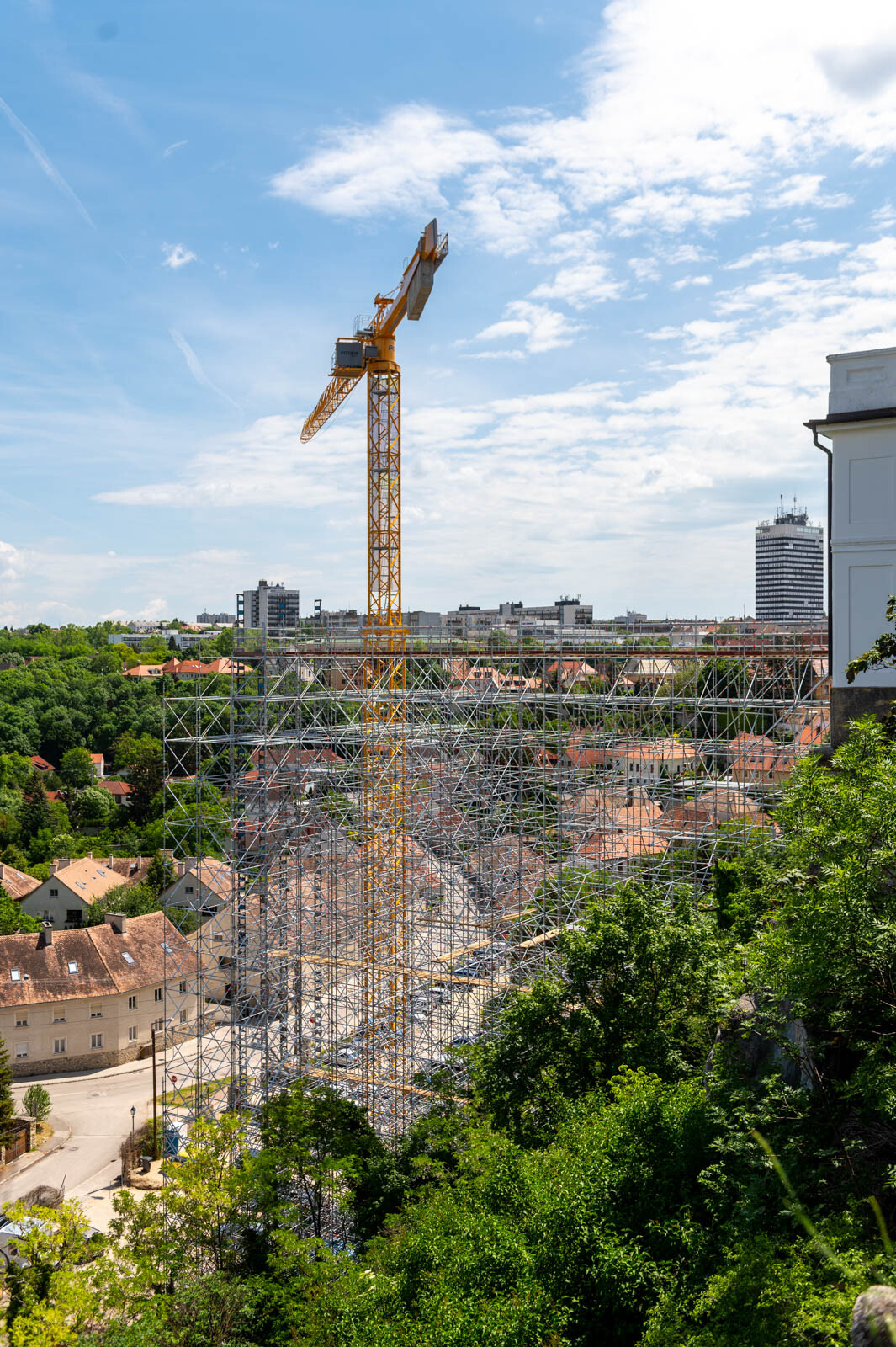 Mindezt a Layher Allround moduláris állványrendszer alkalmazásával elkészült, hozzávetőlegesen 80 tonna súlyú térállvány biztosítja, amelyhez két Geda Z/ZP 1500-as felvonót rögzítettek a teher és személyi forgalom lebonyolítására. A két Geda felvonó egyenként 1500 kilogramm teherbírásúak. A felvonók az építési anyagok felhordására és a személyek feljutásának támogatására szolgálnak, és egyenként 15-15 fő szállítására alkalmasak.