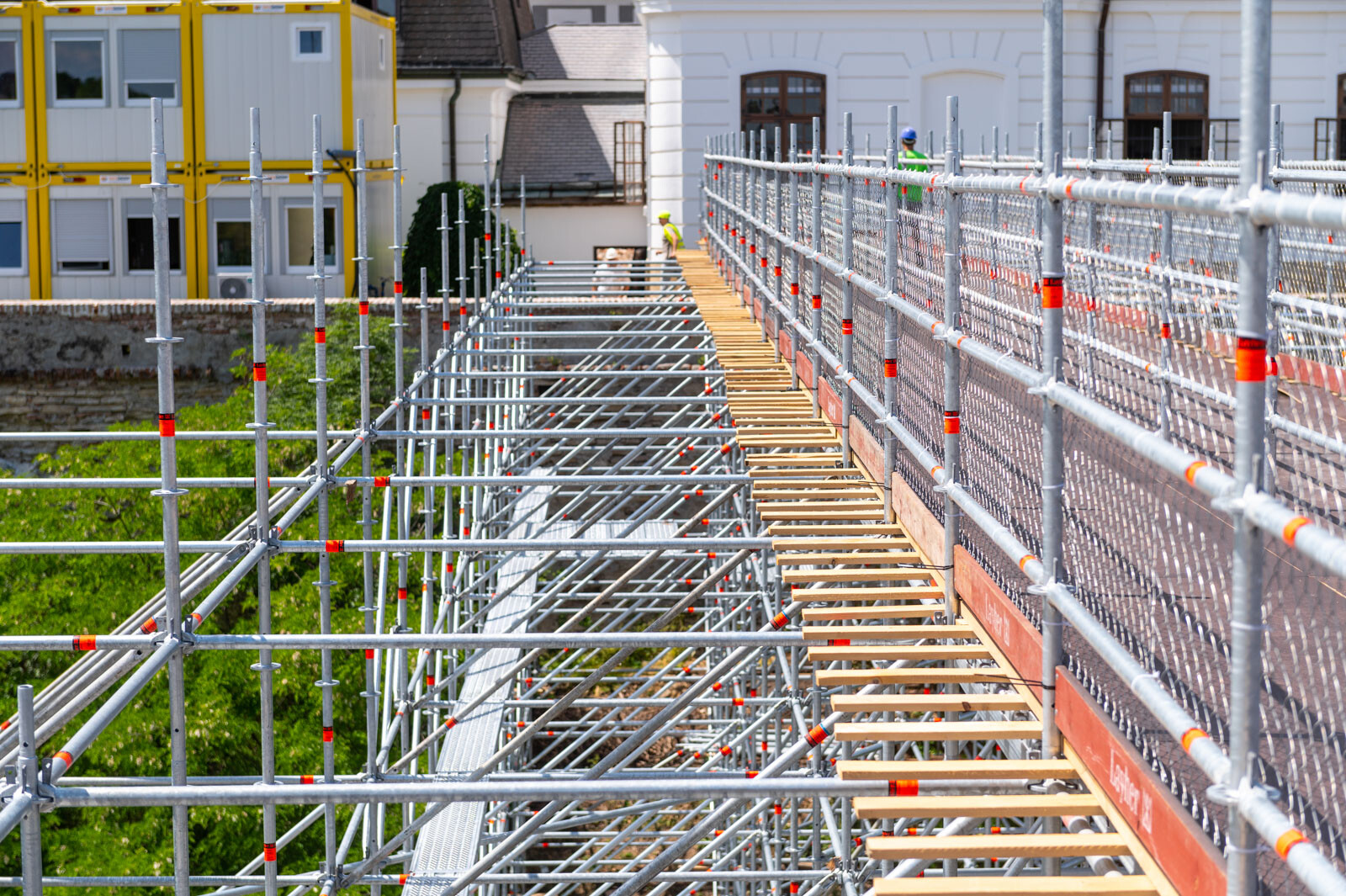 Az állványzat tetején két, 1,5 méter széles közlekedő folyosót építettek ki, annak érdekében, hogy az anyagokat a felvonóból kigurítva ezeken keresztül vigyék a munkaterületre. Az egyik a személyi, a másik a teherforgalomért felel. Mindkettőről elmondható, hogy extrán biztosított, 4 soros oldalvédelemmel ellátott megoldás.