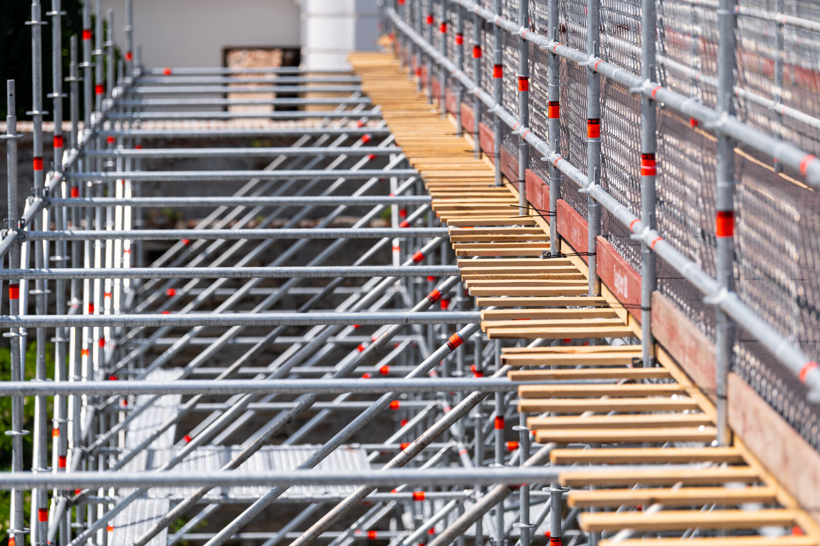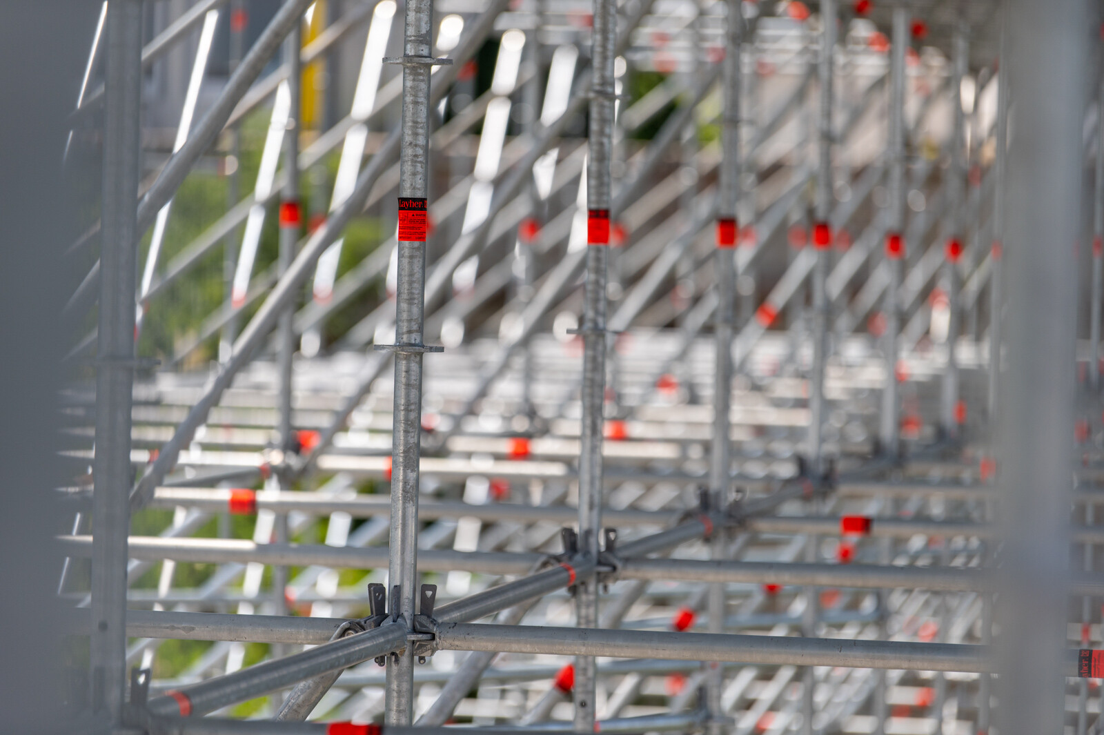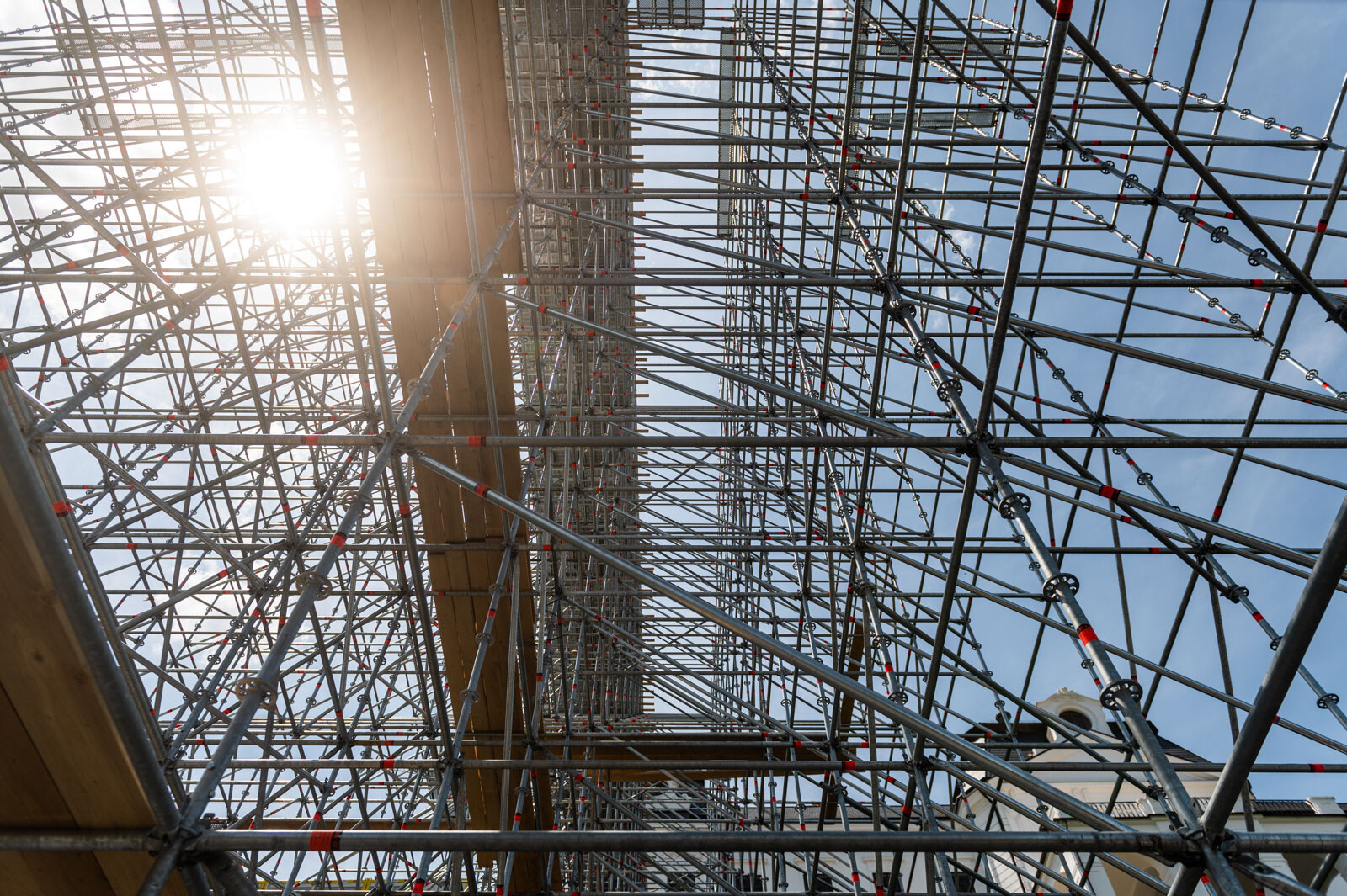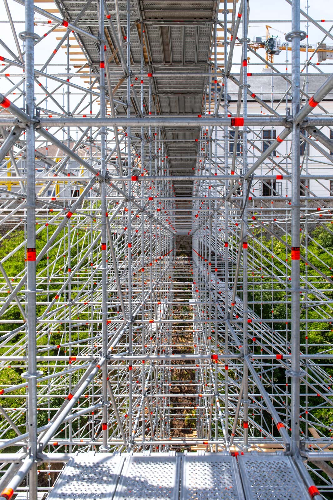 A két közlekedési folyosó borítása is gondos munka eredménye. Layher Lightweight, vagyis könnyített súlyú acél járólapokat alkalmaztak. Ezek standard állványozási munkákhoz kiválóan alkalmasak, vékonyabb falvastagságúak a standard acél járólapnál és kisebb súllyal rendelkeznek, ennek ellenére nagyobb teherbírásúak.
