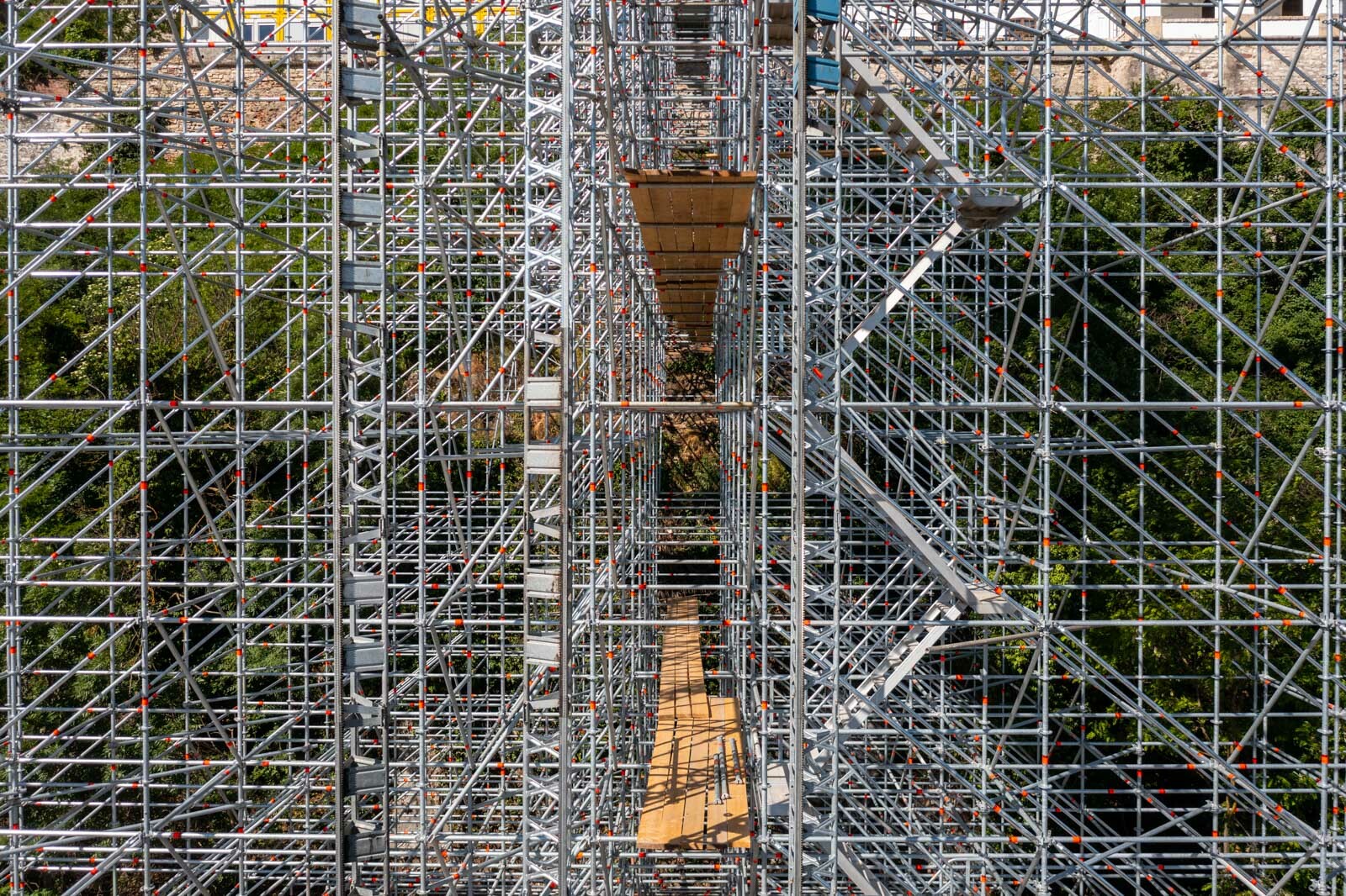 Az állványzaton egy esetleges áramszünet esetén sem áll meg a munka, ugyanis Podest lépcsőket építettek be a szerkezetbe, amelyek szükség esetén biztosítják a feljárást a szakemberek számára.