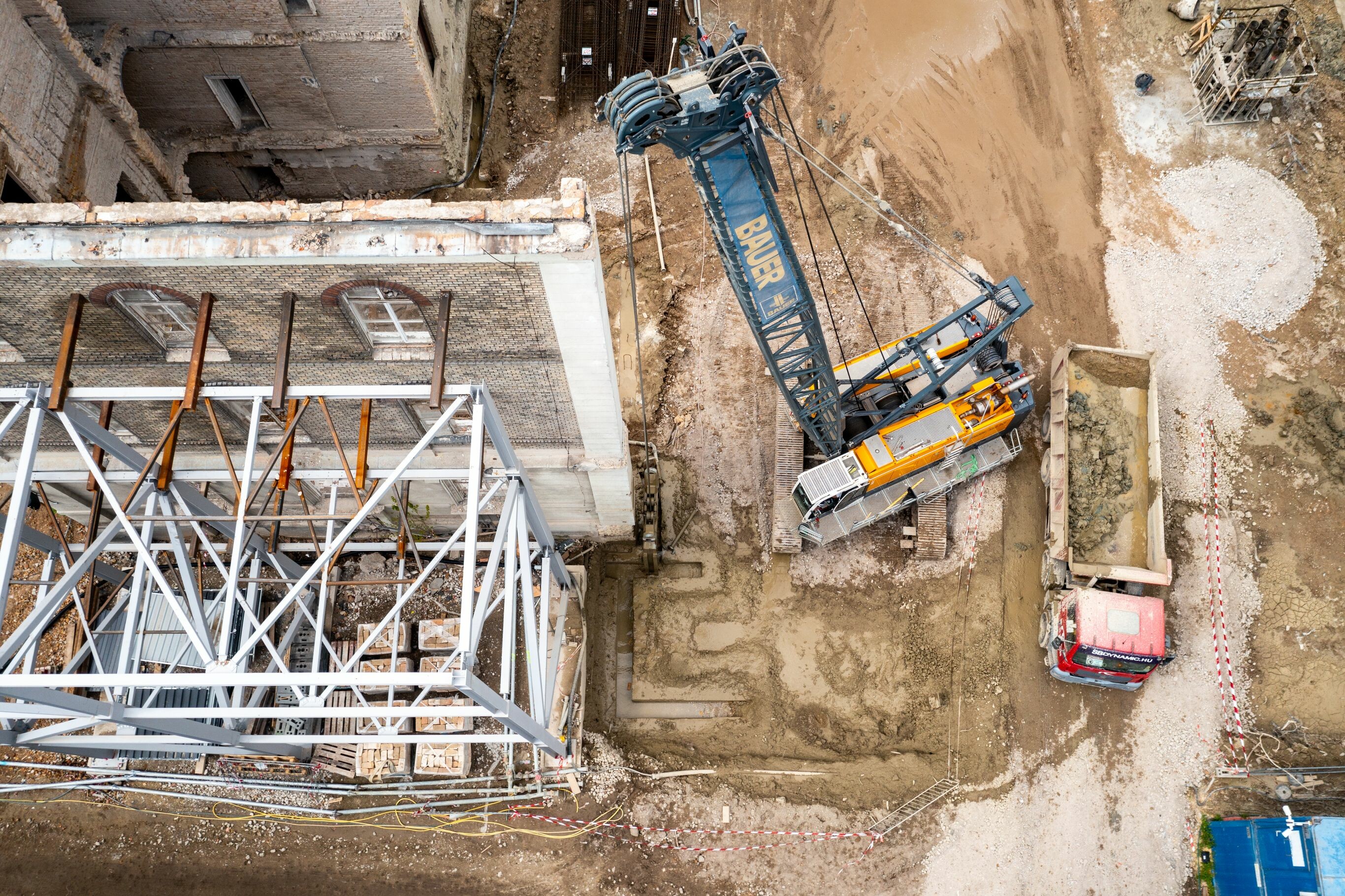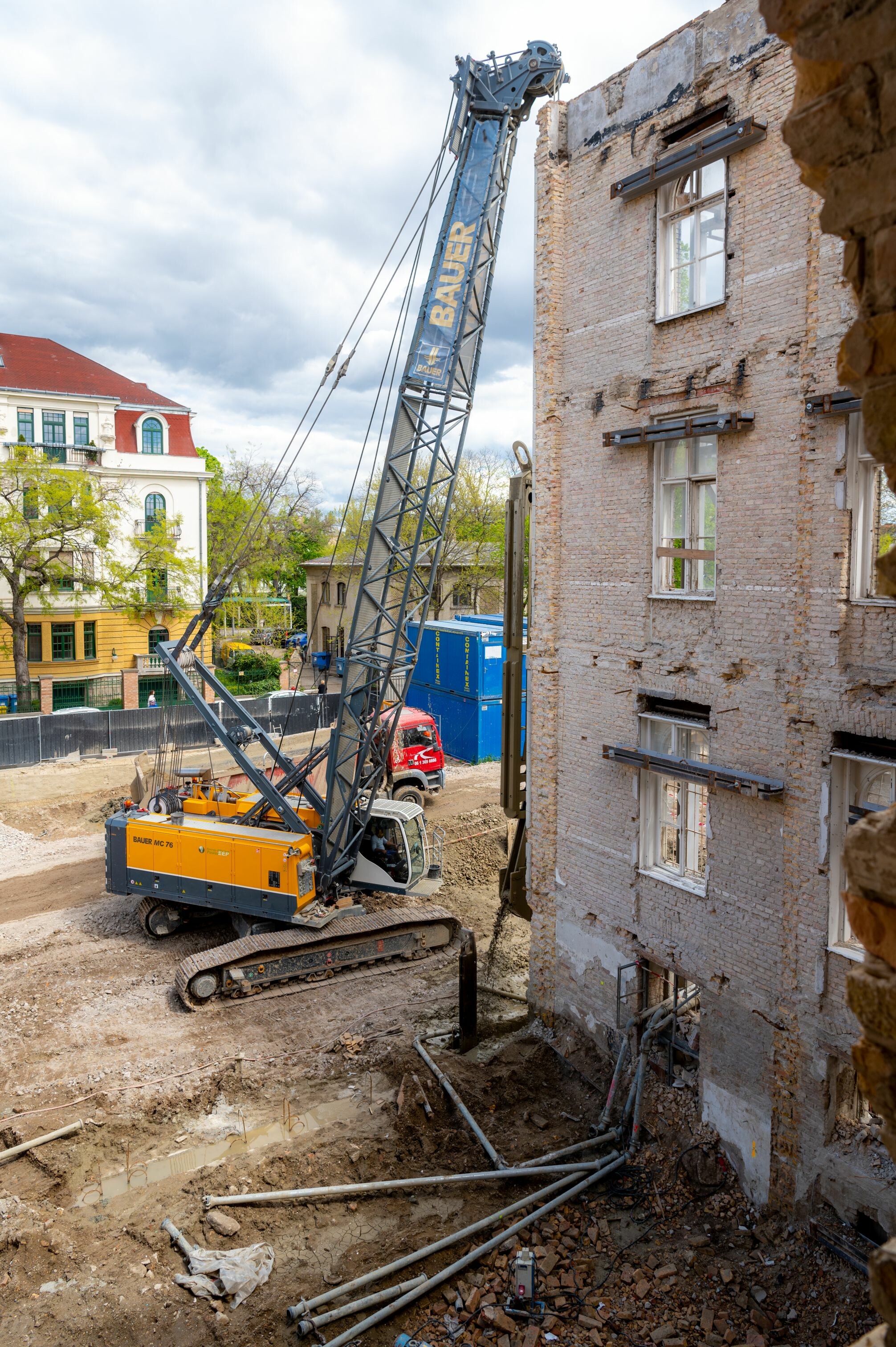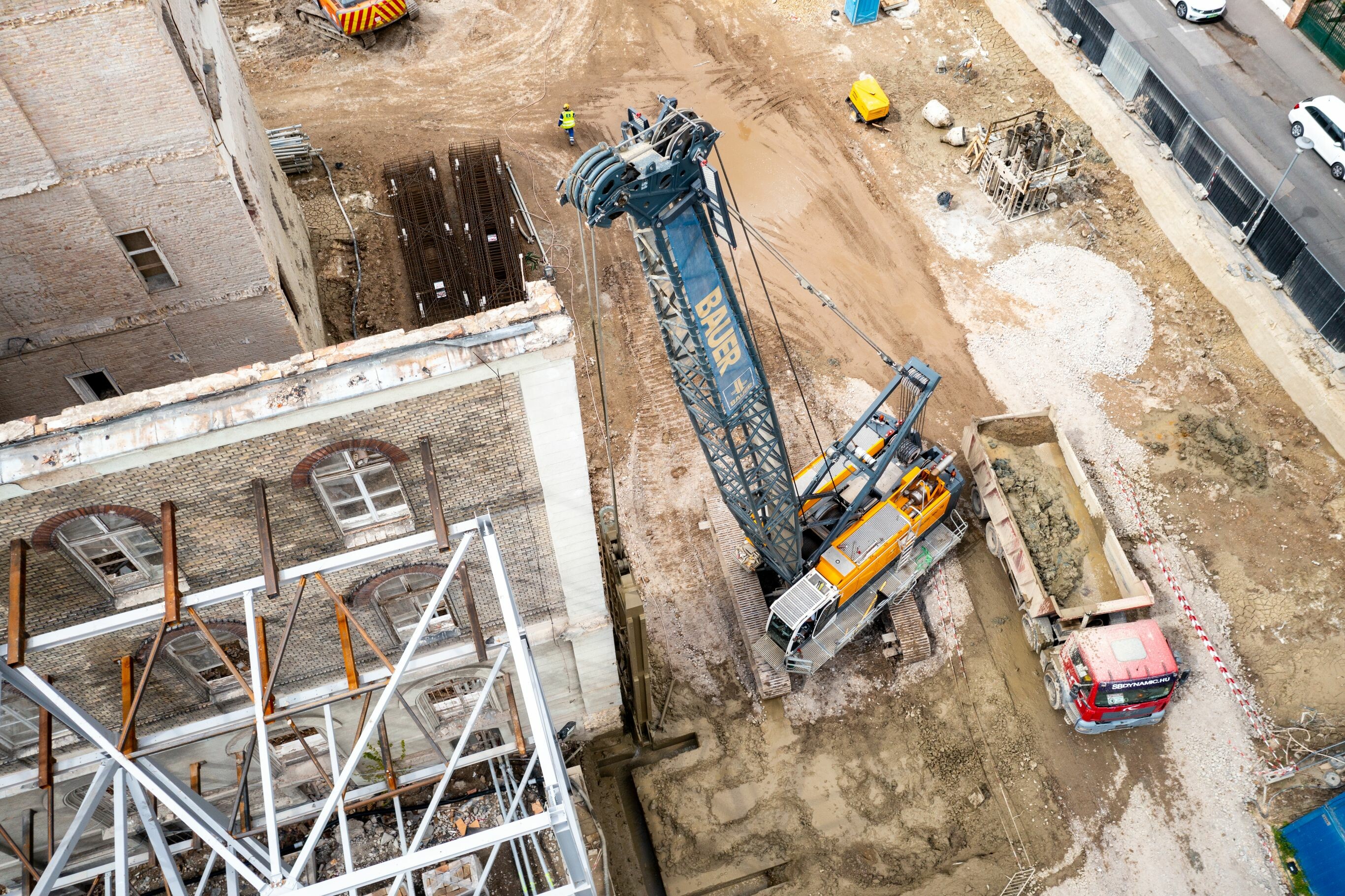 A projekt előrehaladásával kapcsolatban Rezes Sándor, a BAUER Magyarország Kft. projektvezetője informálta lapunkat. A munkaterületet 2022. március elején vették át, a szükséges épületbontás, valamint a munkaterület kialakítását követően. Az első irodaházzal ellentétben ezúttal mindössze egy bejáró vezet az építkezésre, emellett a réselési feladatok ellátására is jóval kisebb munkaterület állt rendelkezésre. Ebből kifolyólag komplex organizálásra volt szükség, így a felvonulási területet is egy külső részen kellett elhelyezni.