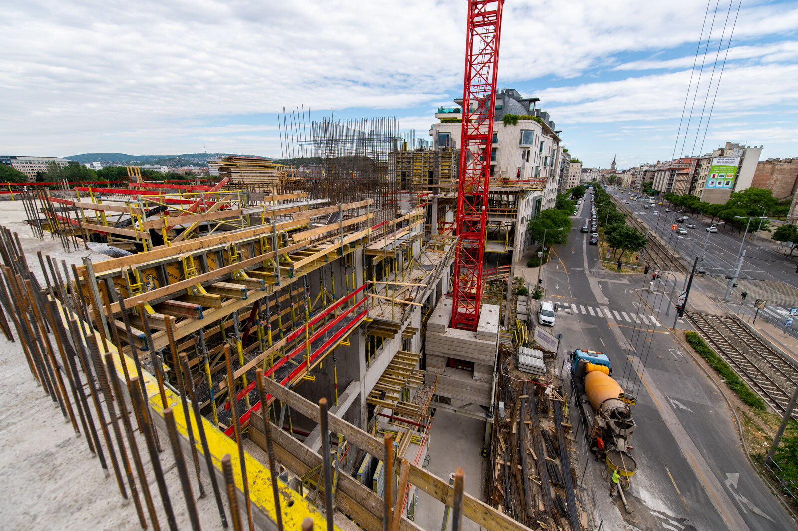 Az ingatlanfejlesztés aktuális állásával kapcsolatban a kivitelező szakemberei tájékoztatták lapunkat. A munkálatok 2021. augusztusában kezdődtek meg, a meglévő pinceszintek változó építési programhoz tartozó átalakításaival. Hozzátették, a rendelkezésre álló szűk felvonulási terület folyamatos megpróbáltatásokat jelent az épület kivitelezésének szervezése során, de ettől függetlenül az ütemterveknek megfelelően halad az építkezés.
