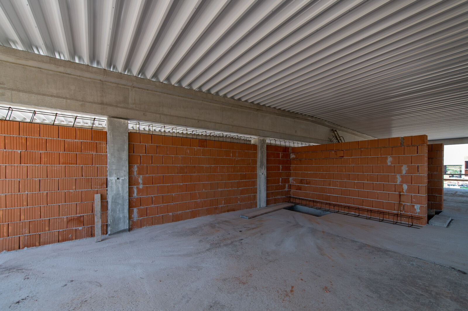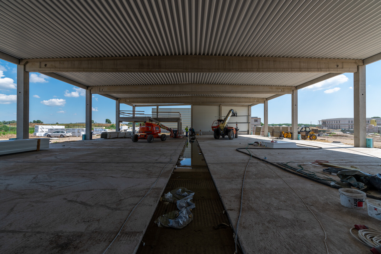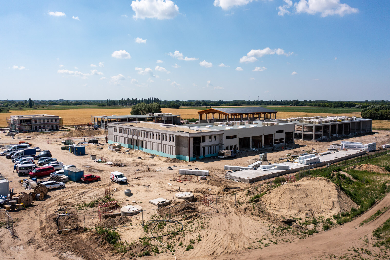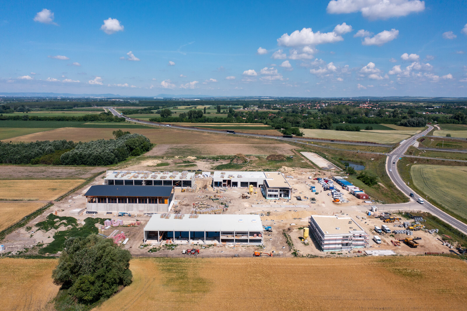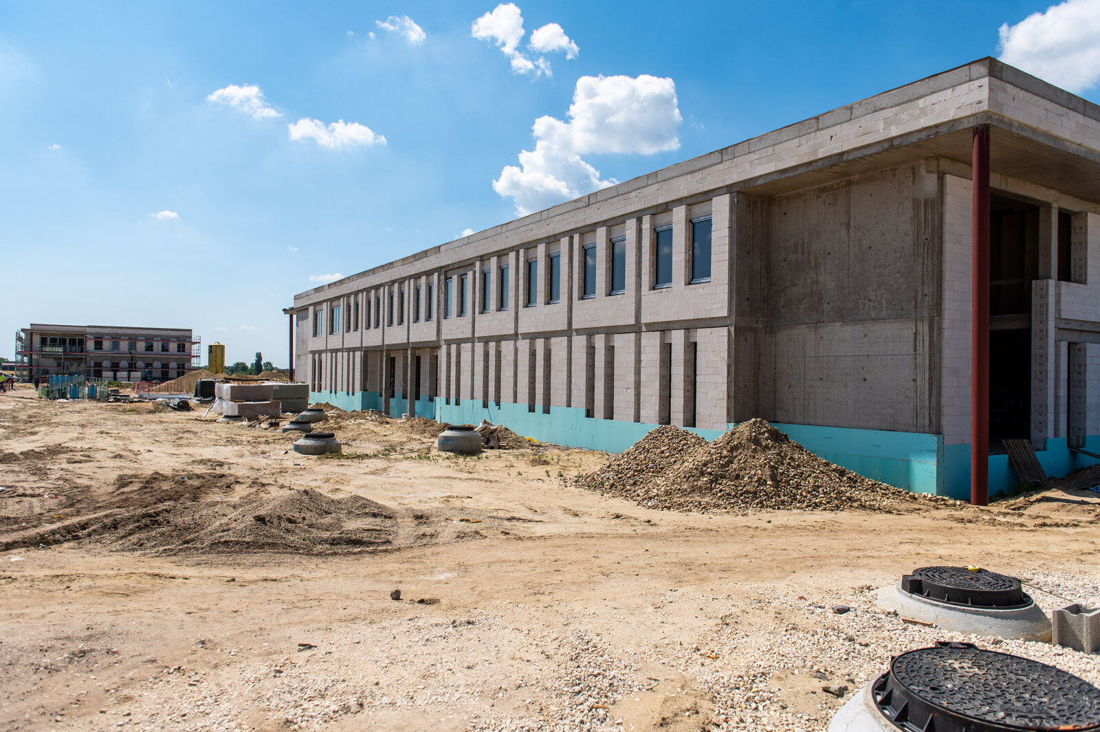 Az épületek teherhordó szerkezete, tetőfedése, illetve homlokzata mind a hat tervezett épületnél elkészült, illetve a terepszint alatti közműhálózat kiépítése is megvalósult. A kétszintes rendőrségi épületnél, illetve a mérnökségi szociális-iroda épületnél folyamatban vannak a befejező szakipari munkák, illetve a gépészeti és elektromos hálózatok kiépítése. Az épületek szerkezetépítésében az Épszerk-Pannónia Invest Kft. is szerepet vállalt.
