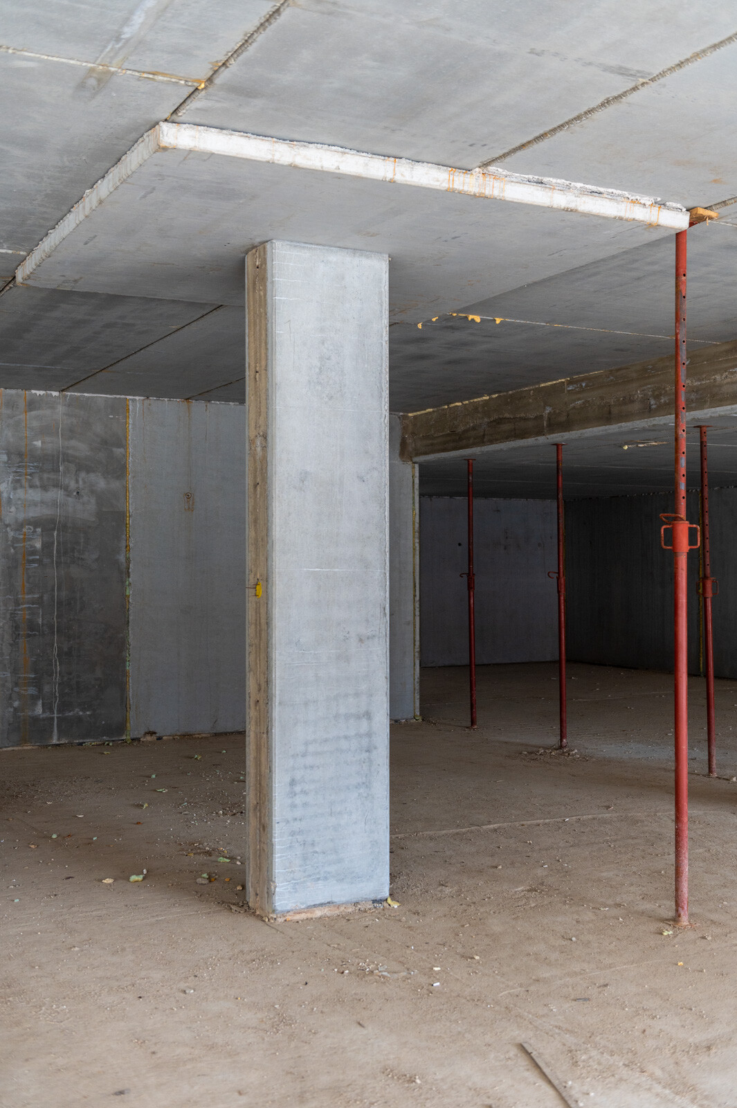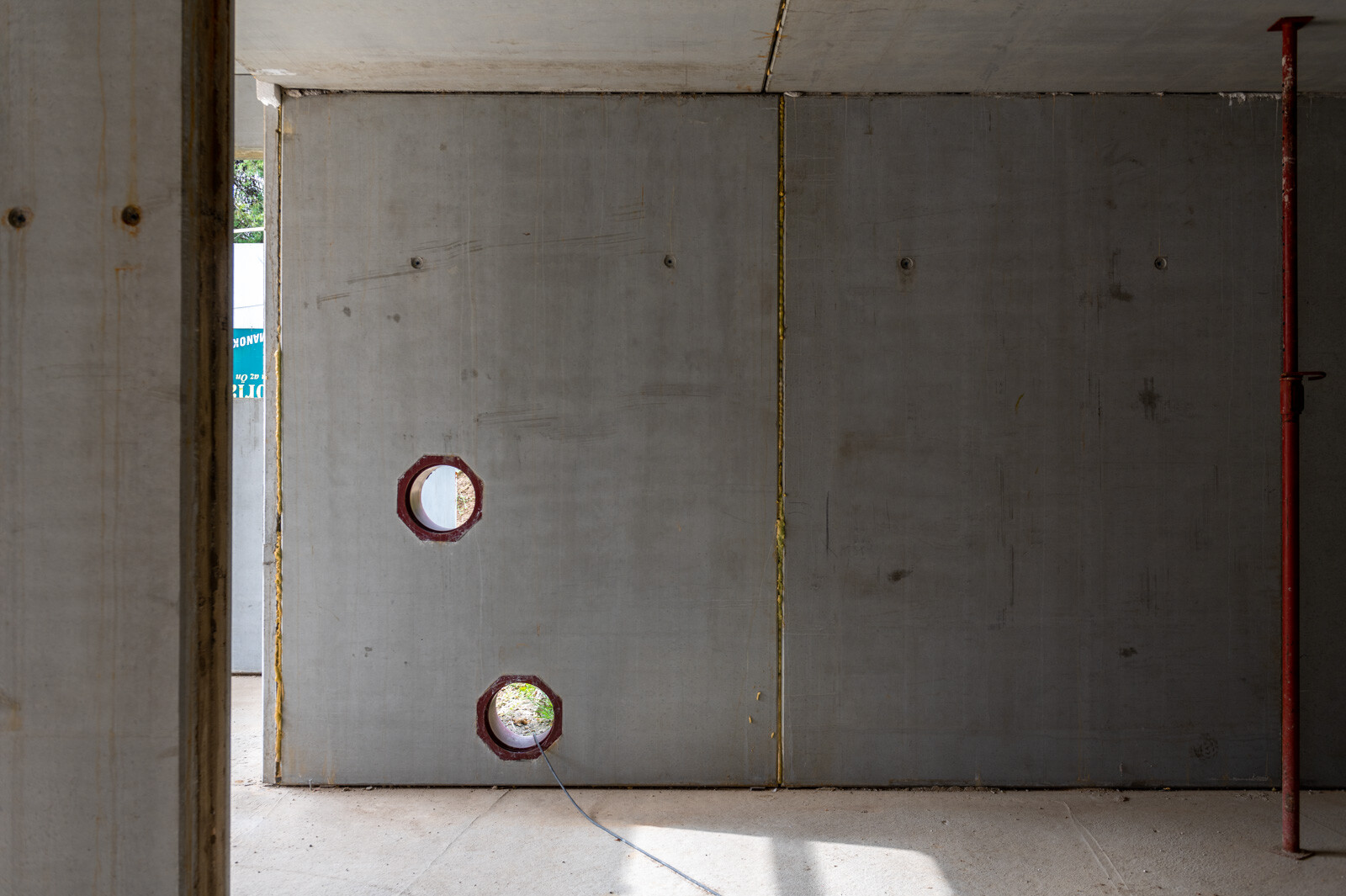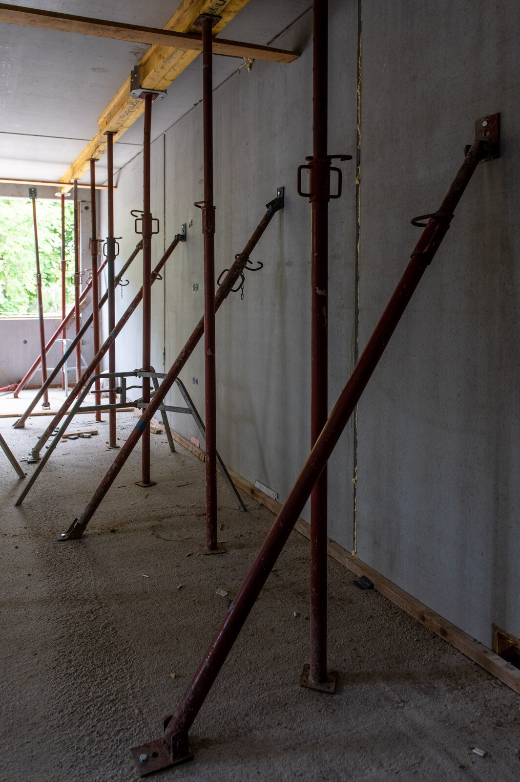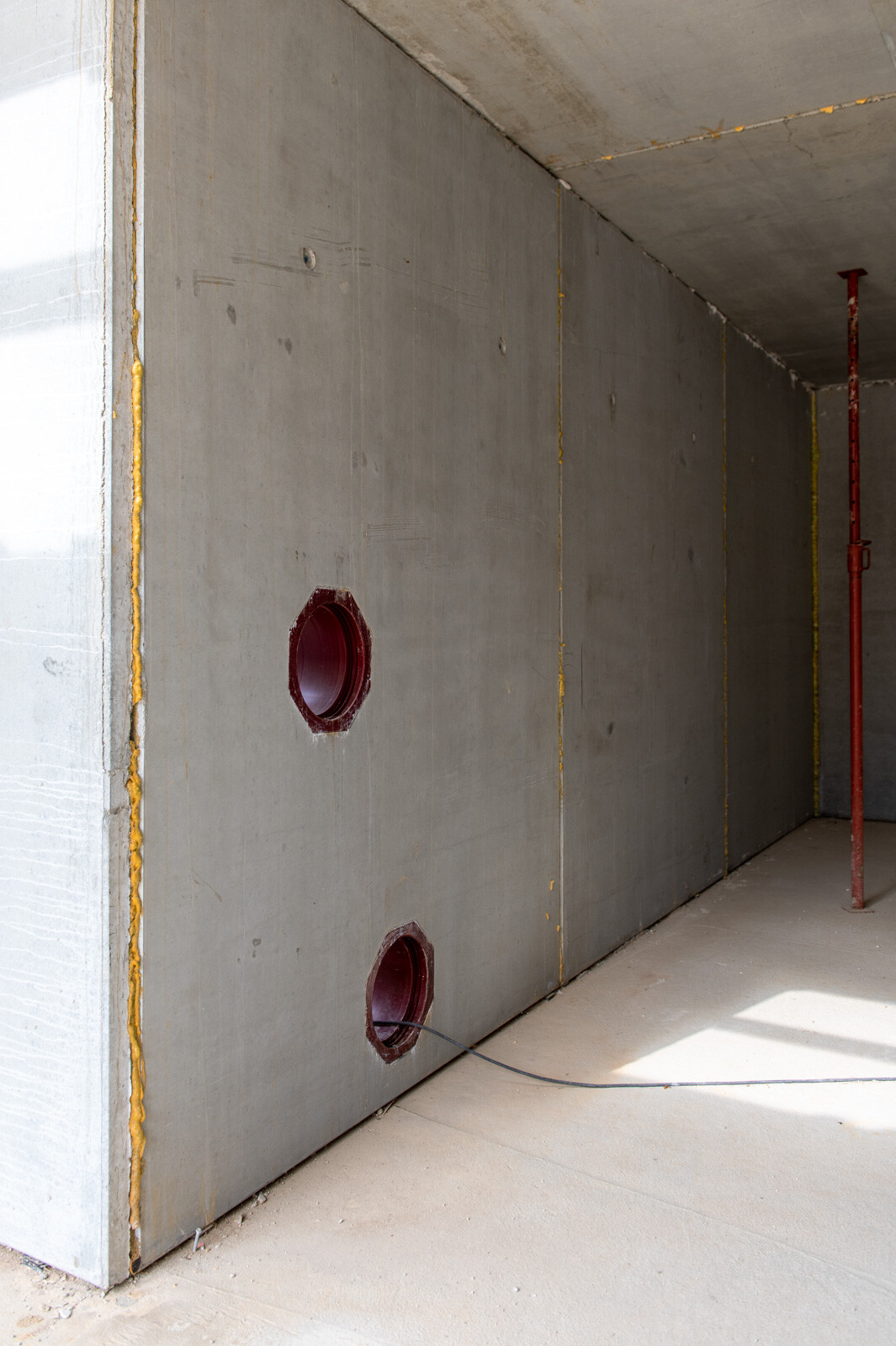 A kéregelemes falak külső és lakáselválasztó falként funkcionálnak, és előszerelt gépészettel, valamint elektromos szerelvényekkel, ajtó és ablaknyílásokkal rendelkeznek. Az alsó szinten a gombafödémhez szükséges pillérek is ebből a kéregfalból készültek.