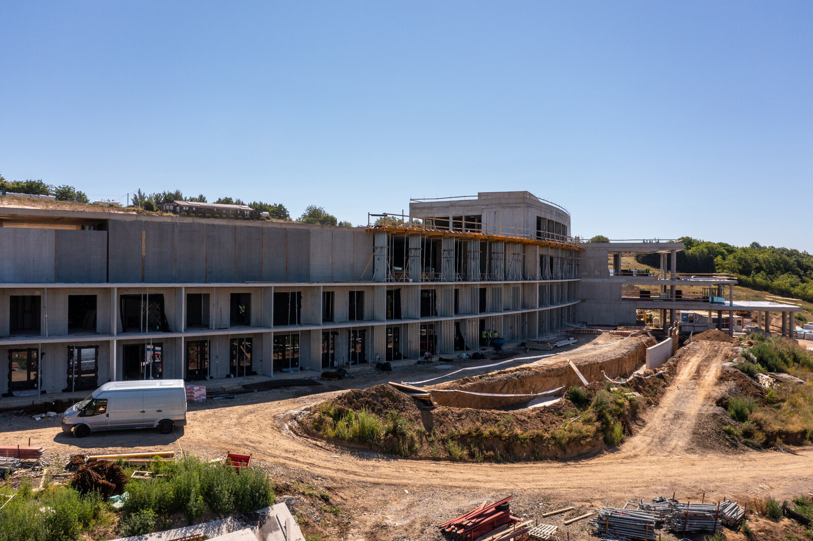 A hotel ötszintes, jellemzően oldalfolyosós elrendezésű, négy dilatációs egységre és három tűzszakaszra bontott, extenzív zöldtetővel takart, lapostetős épület, amelyet mélyalapozással - CFA cölöpökkel – terveztek meg. A mélyalapozás 2021. nyarán fejeződött be, ezt követően kezdődtek a szerkezetépítési munkák.