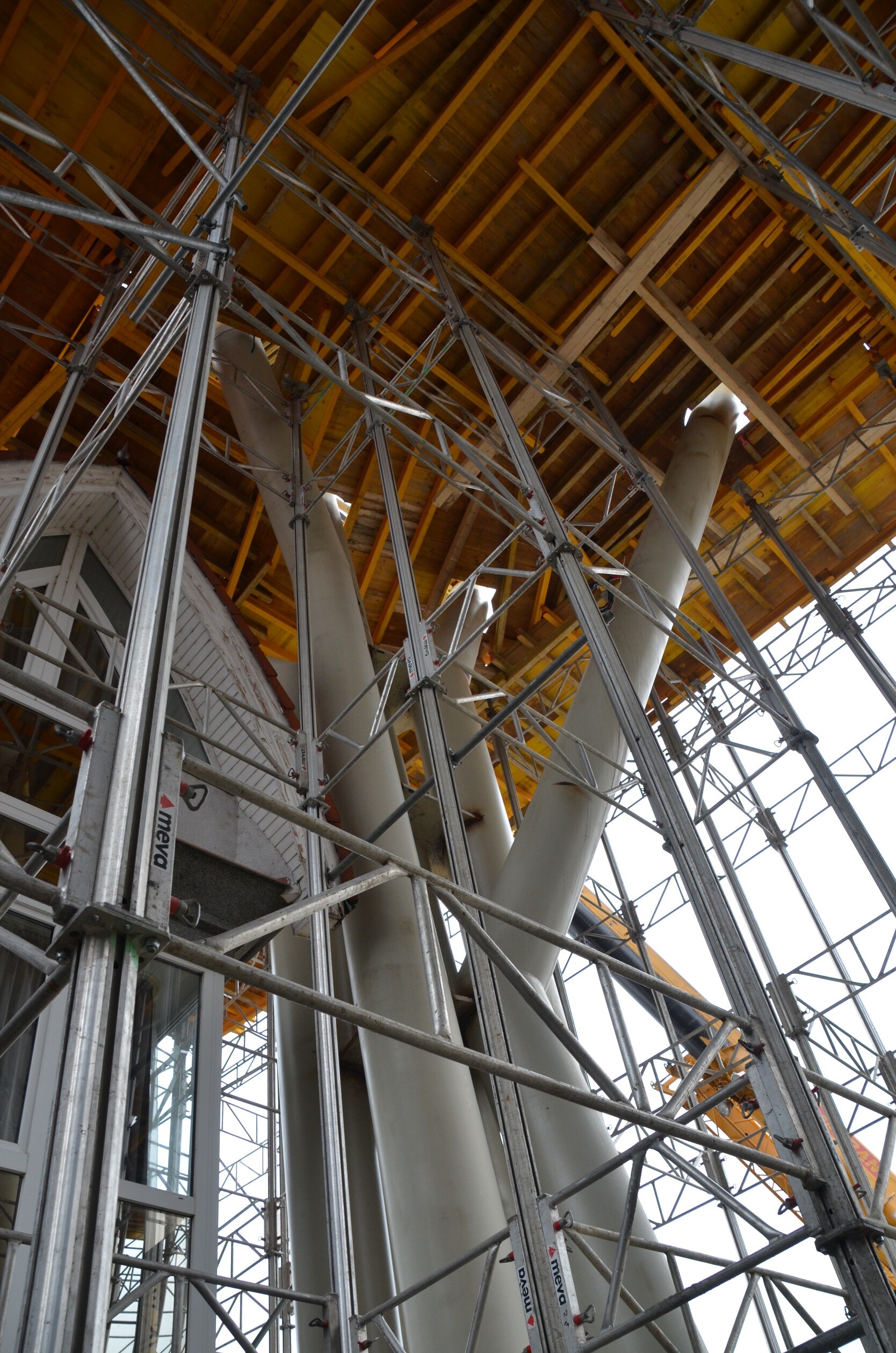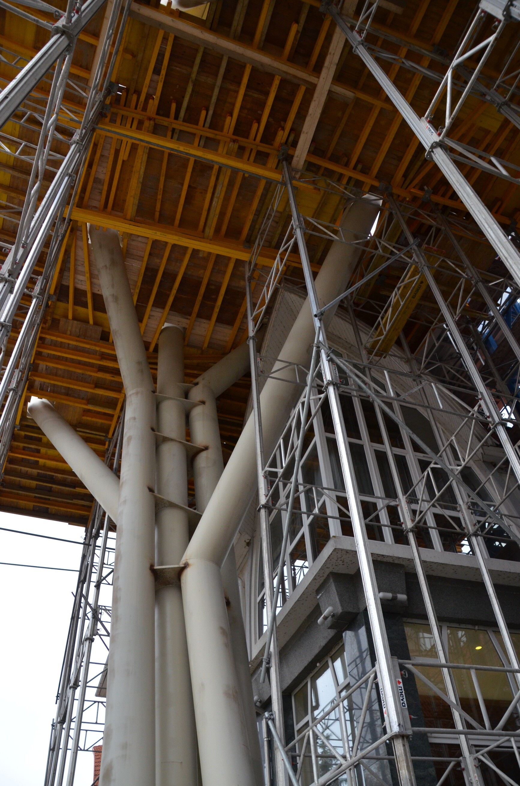 Ez a szerkezet azért bizonyult a legjobb megoldásnak, mert az állványzat stabilitását biztosító keretek az állványtornyokon belül szabadon és bárhol elhelyezhetőek, ezáltal a „fák ágai” közé is könnyebben beépíthetővé váltak. Hozzátette, ezen felül a ritka letámasztásnak köszönhetően mindössze csak néhány ütközés alakult ki az acélszerkezeti vázzal.