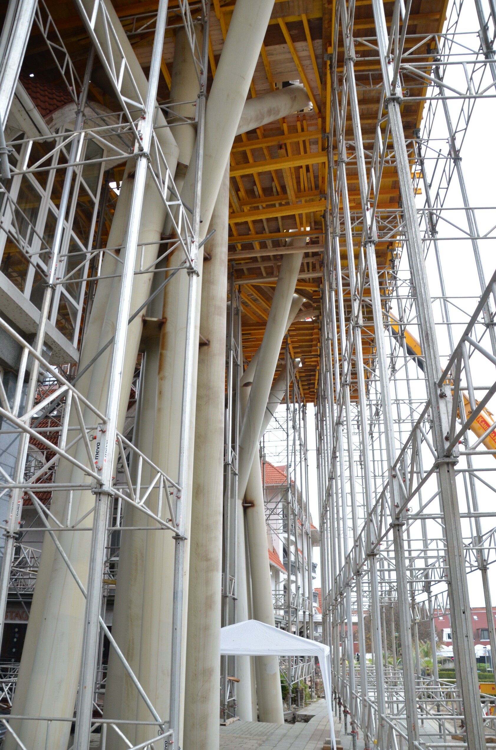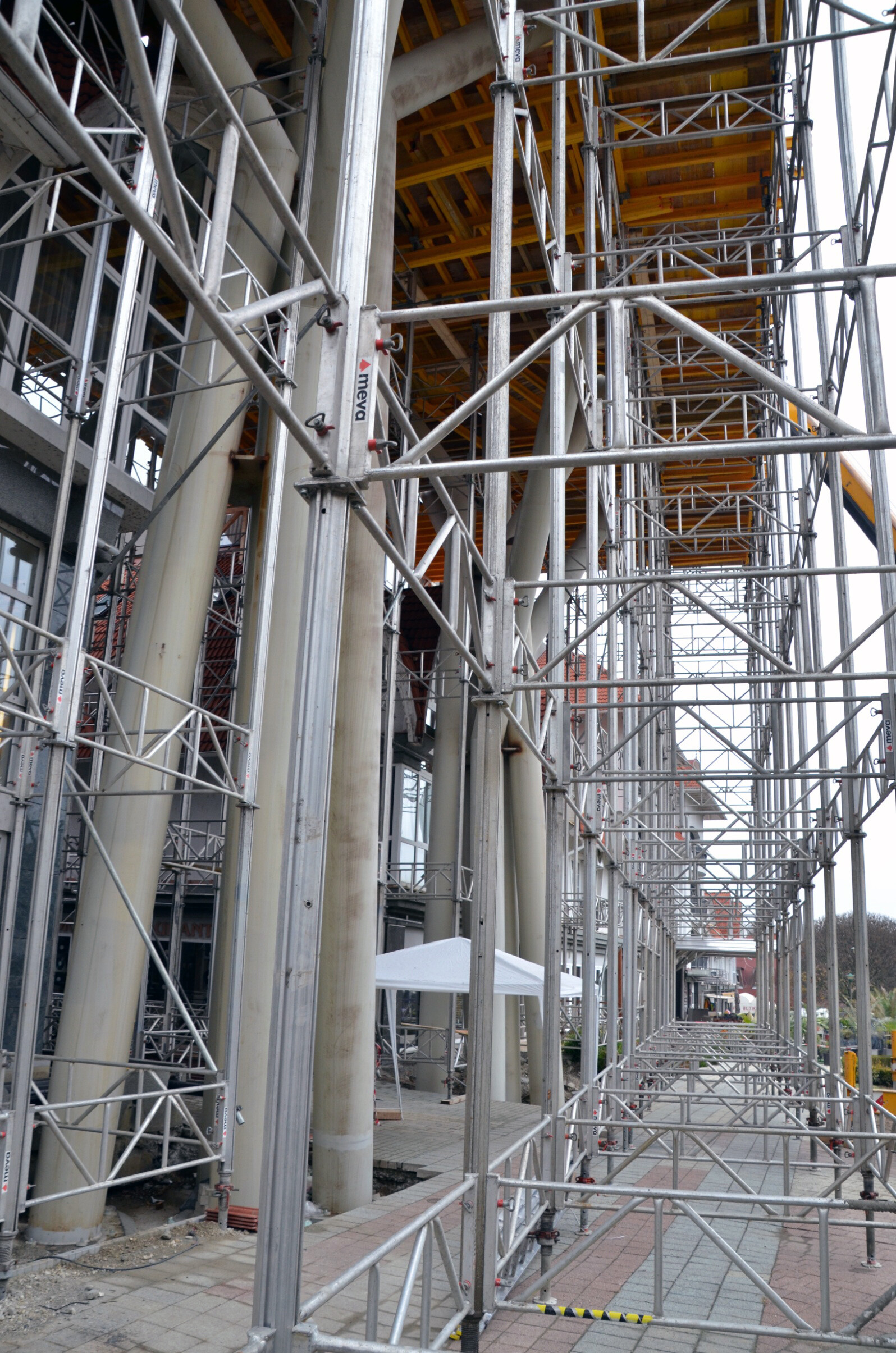 Ennek érdekében a feladat megkövetelte a nagy teherbírású, ezáltal ritka letámasztású és jól variálható állványzatot, hiszen a medencét alátámasztó acél fák ágai és a kapcsolódó épület geometriája a hagyományos keretes állványzat használatával csak nehezen megoldható feladat lett volna – fejtette ki a szakember.
