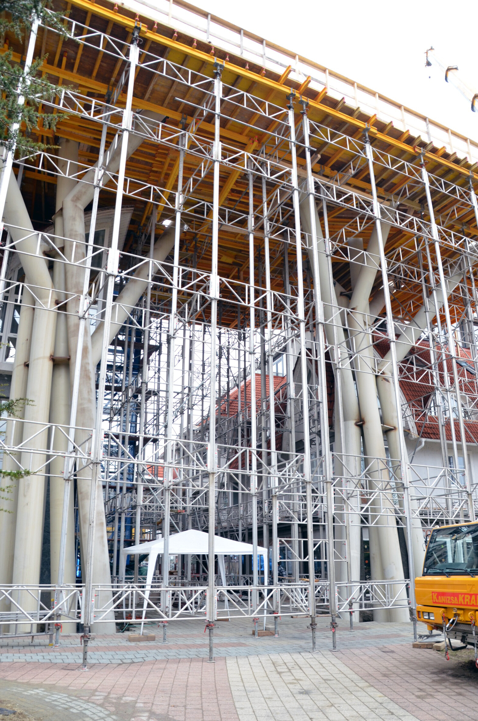 Ugyanakkor előnyt jelentett, hogy az állványzat minden eleme kézzel mozgatható, így azokat szintről-szintre lehetett felépíteni a közbenső munkaszintekről, illetve emelőkosaras daru segítségével.