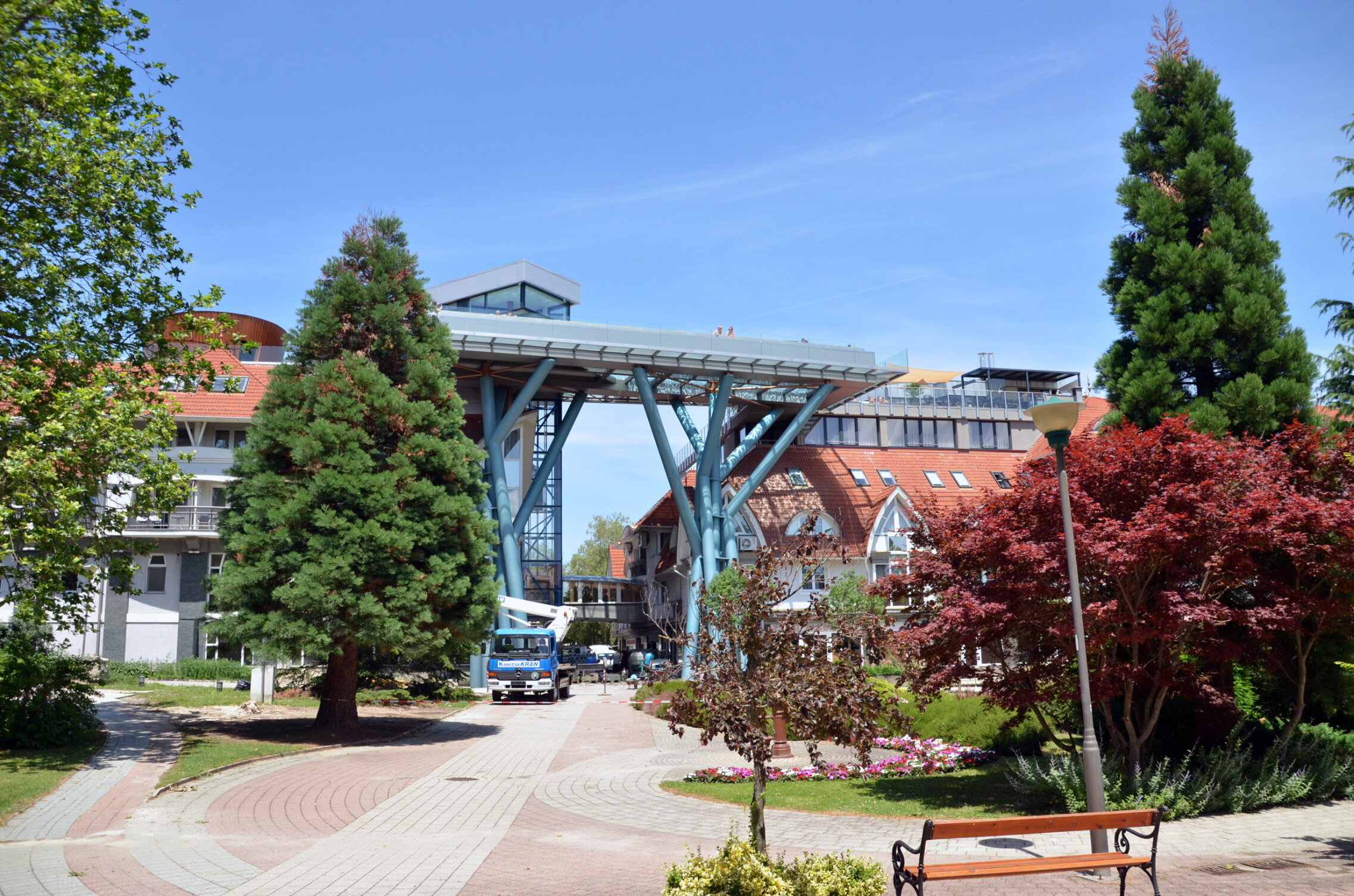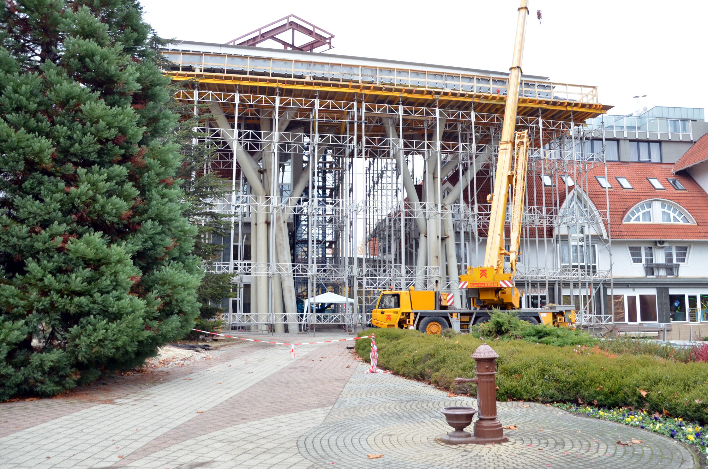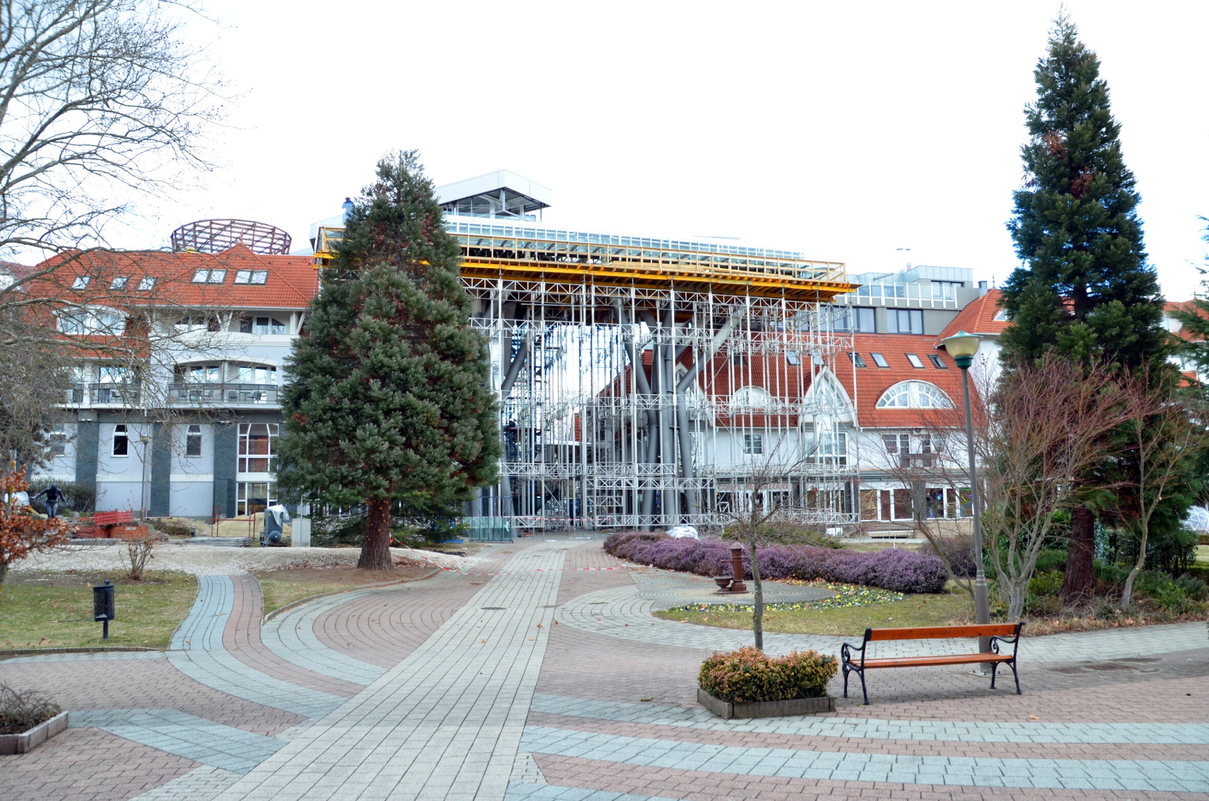 A látványos medence a négycsillagos zalakarosi wellness hotel tetején foglal helyet, melynek speciális kialakításához a MEVA MEP nehézállványzatát, valamint fatartós födémzsalu rendszerét alkalmazták a kivitelezők.