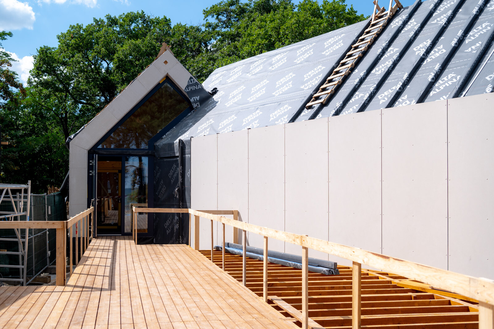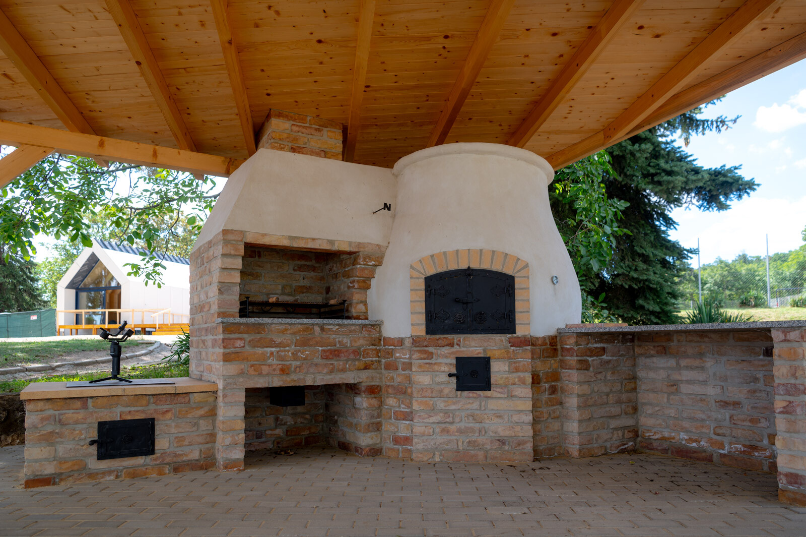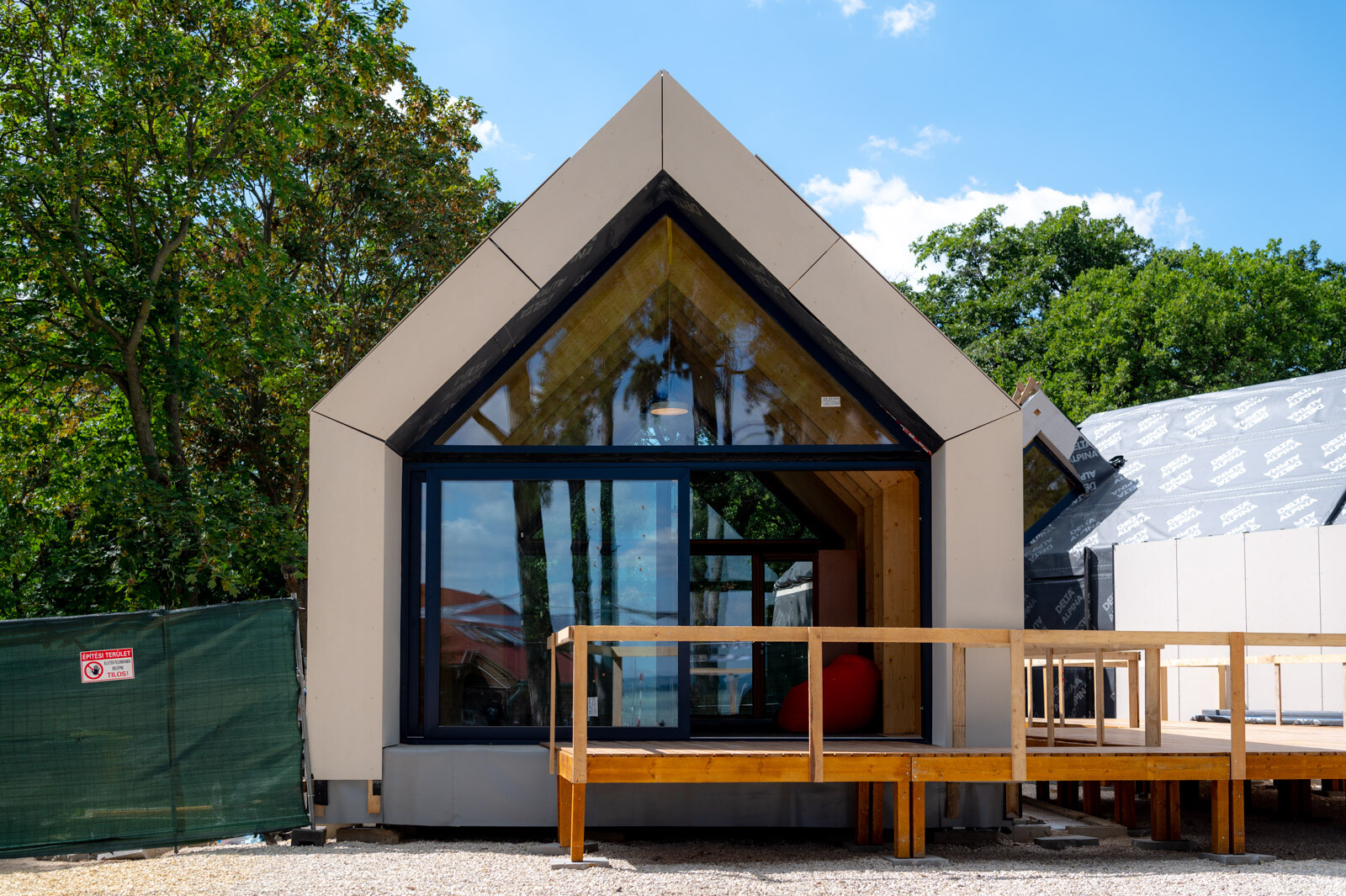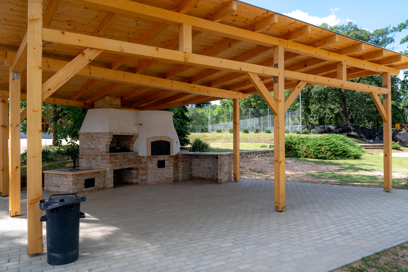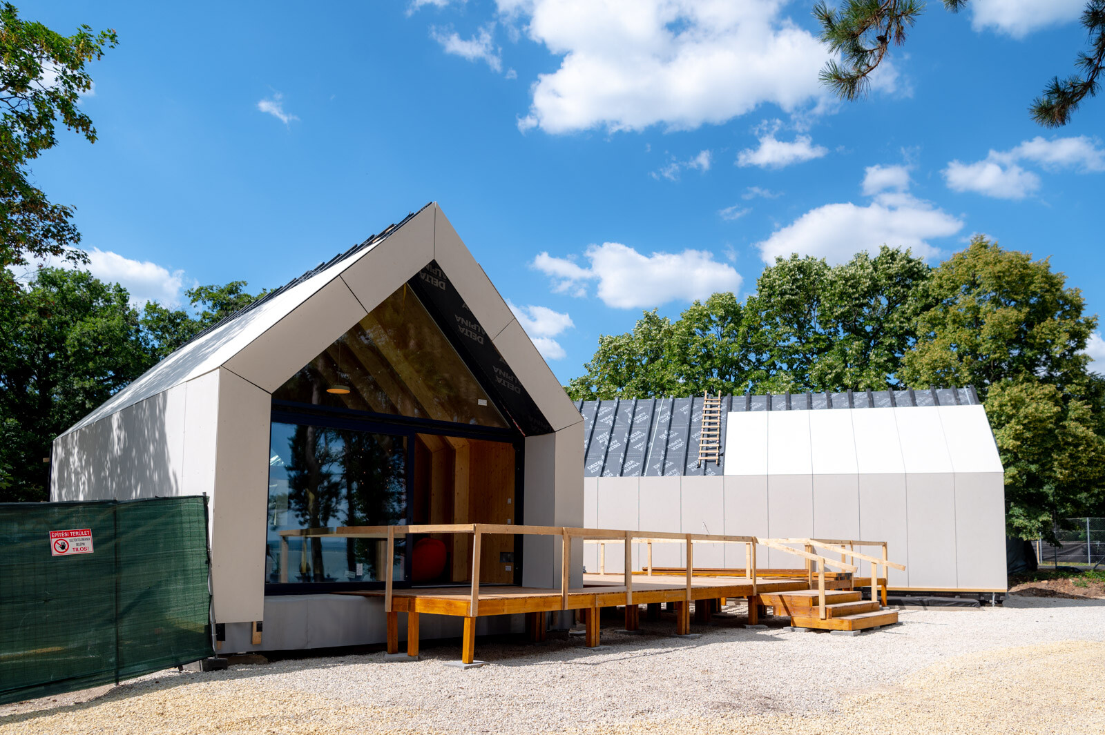 A közösségi pavilon munkálatai 2022 márciusában kezdődtek meg. A CLT paneles technológia alkalmazásának köszönhetően a pavilont rendkívüli gyorsasággal kivitelezik. Ennél a technológiánál ugyanis az előregyártott rétegragasztott paneleket méretre gyártva, nyílás kiképzésekkel és a szükséges szerelvények nyomvonalával szállítják a helyszínre, majd rövid idő alatt szerkezetkész állapotra szerelik.